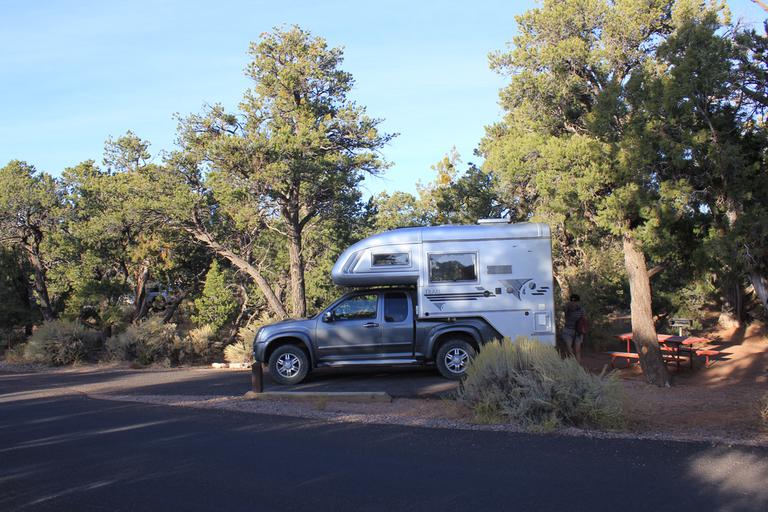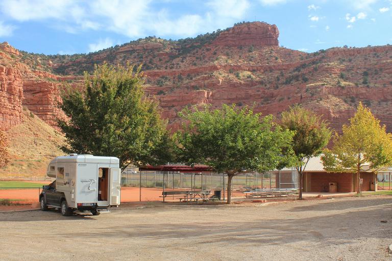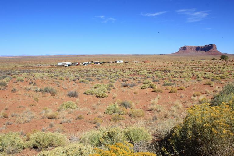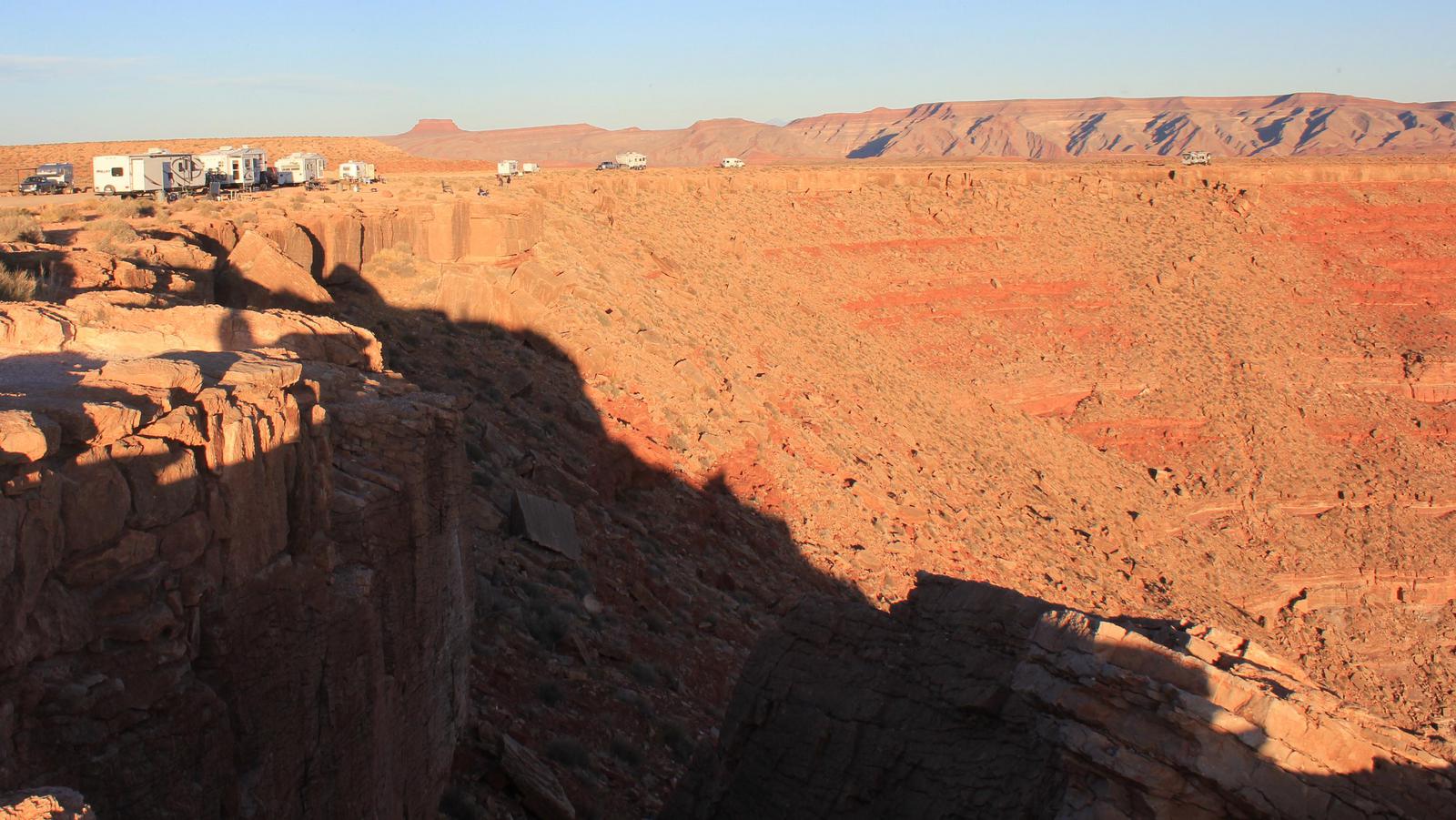 Le site est maintenant payant, $5 ou $10 si on souhaite y passer la nuit. J'explique à la dame de la guérite ce que nous comptons faire, déposer notre cellule et partir visiter Monument Valley. Cela ne pose aucun problème et quelques caravanes et trailers sont déjà stationnés au bord de la gorge alors que leurs occupants sont partis en balade. De plus, notre nuit nous autorise un départ à 14h00, ce qui nous permettra de visiter Valley of the Gods demain matin.