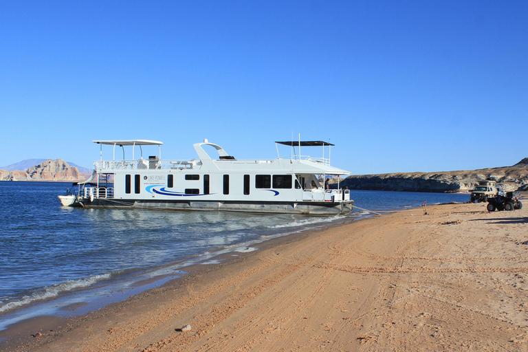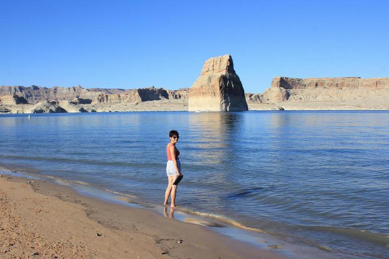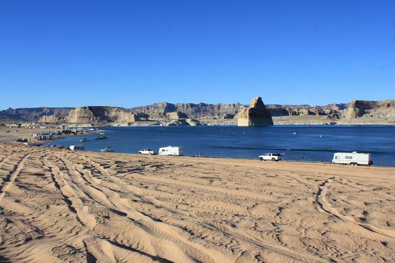 Nous rejoignons ensuite Lone Rock, un bras de lac avec un gros rocher isolé. Cette plage fait partie de la Glen Canyon National Recreation Area et son accès est payant si l'on ne possède pas le pass America The Beautiful. Il est également possible de camper sur la plage moyennant $10 par nuit. Nous sommes revenus en Utah, du reste la majeure partie du lac se trouve dans cet état, et seule la ville de Page est en Arizona. C'est d'ailleurs l'objet d'un petit casse-tête car nous allons rester quelques jours sur la ligne entre ces deux états et nous devons penser à changer d'heure à chaque passage ...