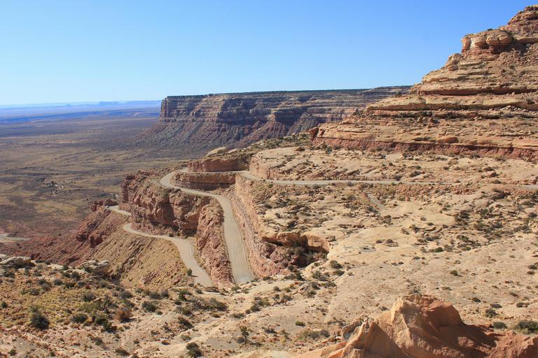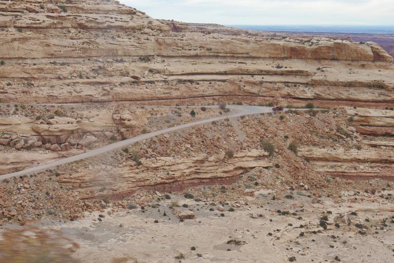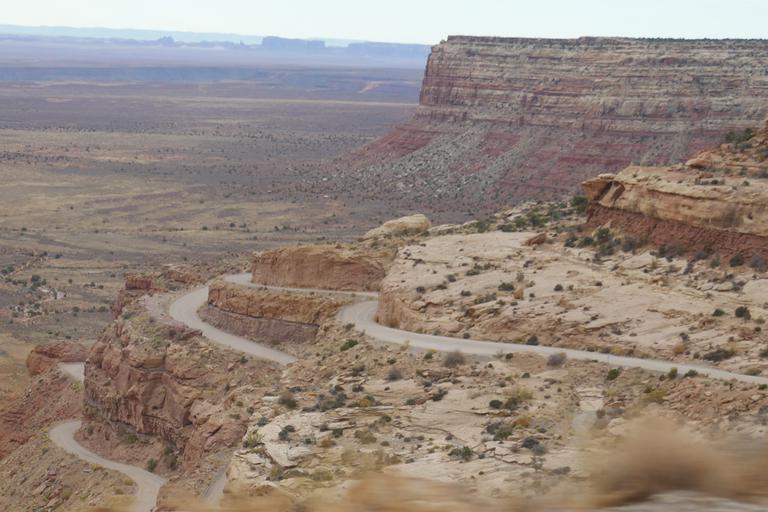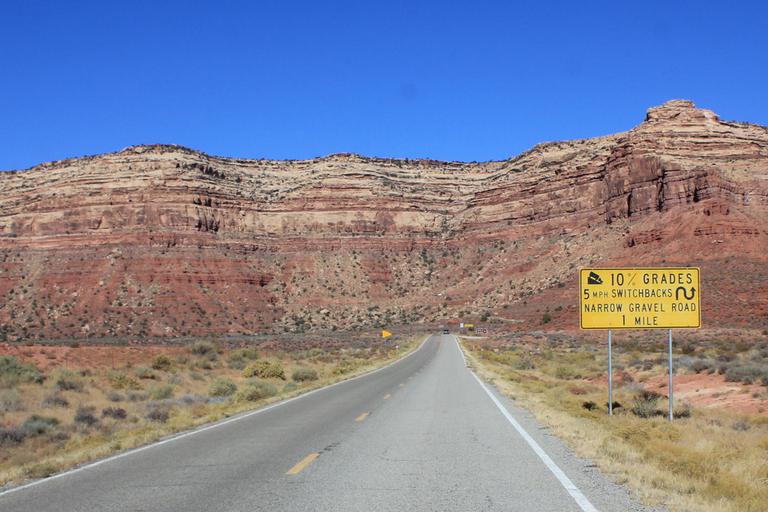 Cette route a été construite dans les années 1950 pour approvisionner le minerai dans une usine près de Mexican Hat. Elle est interdite aux camions et aux gros camping-cars, la pente est raide mais les virages étant goudronnés, la montée est vertigineuse mais relativement facile. Nous redescendons et prenons la piste de la vallée.