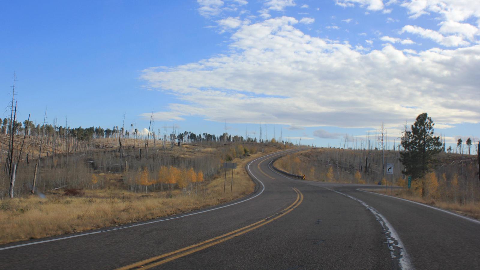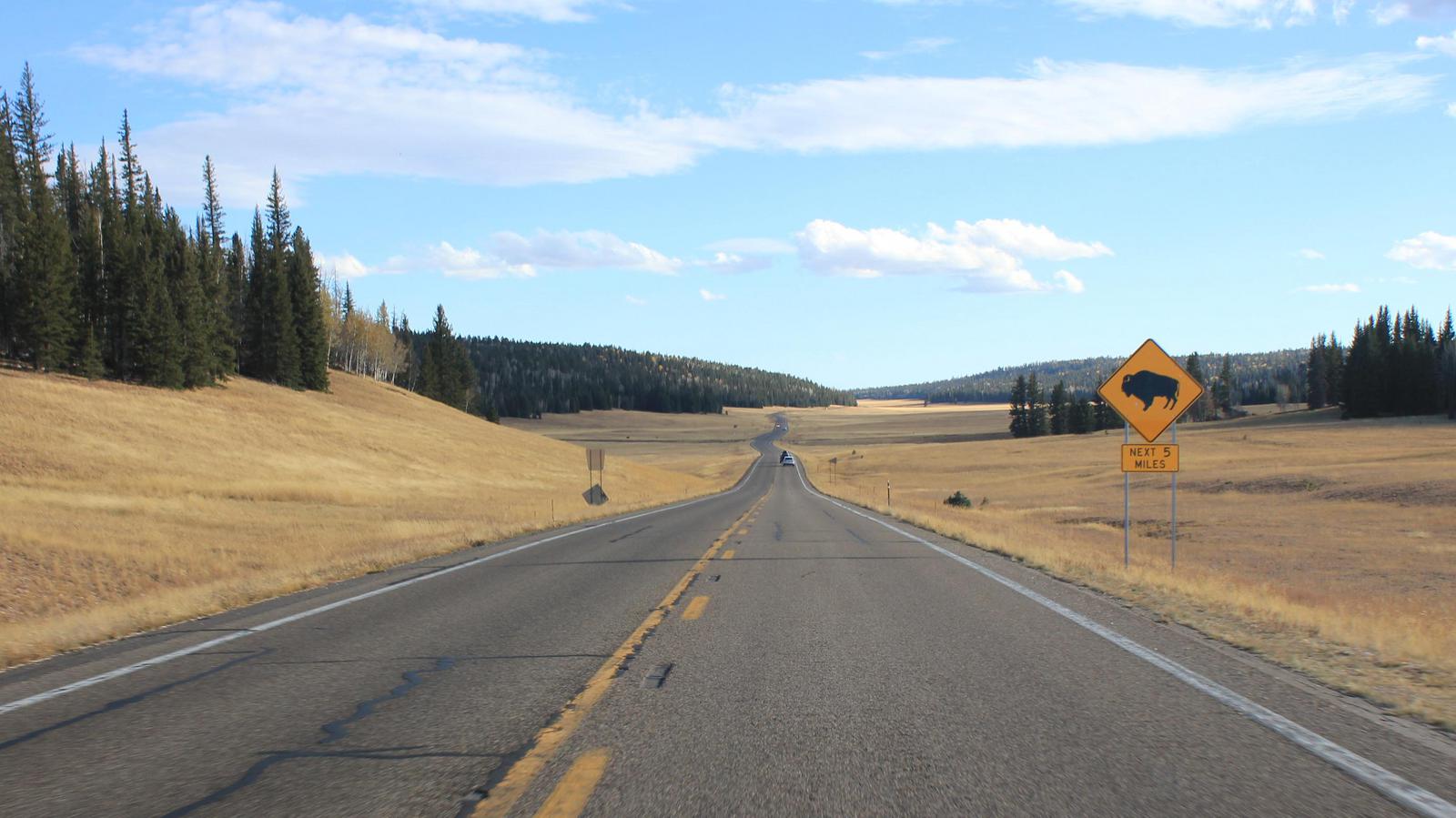 Nous prenons l'ancienne route 89 en direction de Page, puis bifurquons sur la route 67. Celle-ci mène exclusivement au Grand Canyon. Ce sont donc 72km que nous avons à parcourir, à l'aller comme au retour ... Nous traversons des forêts calcinées, souvenir des incendies de 2006, puis de belles prairies à bisons (nous en apercevons d'ailleurs quelques uns), et enfin des forêts de sapins en arrivant au Visitor Center.