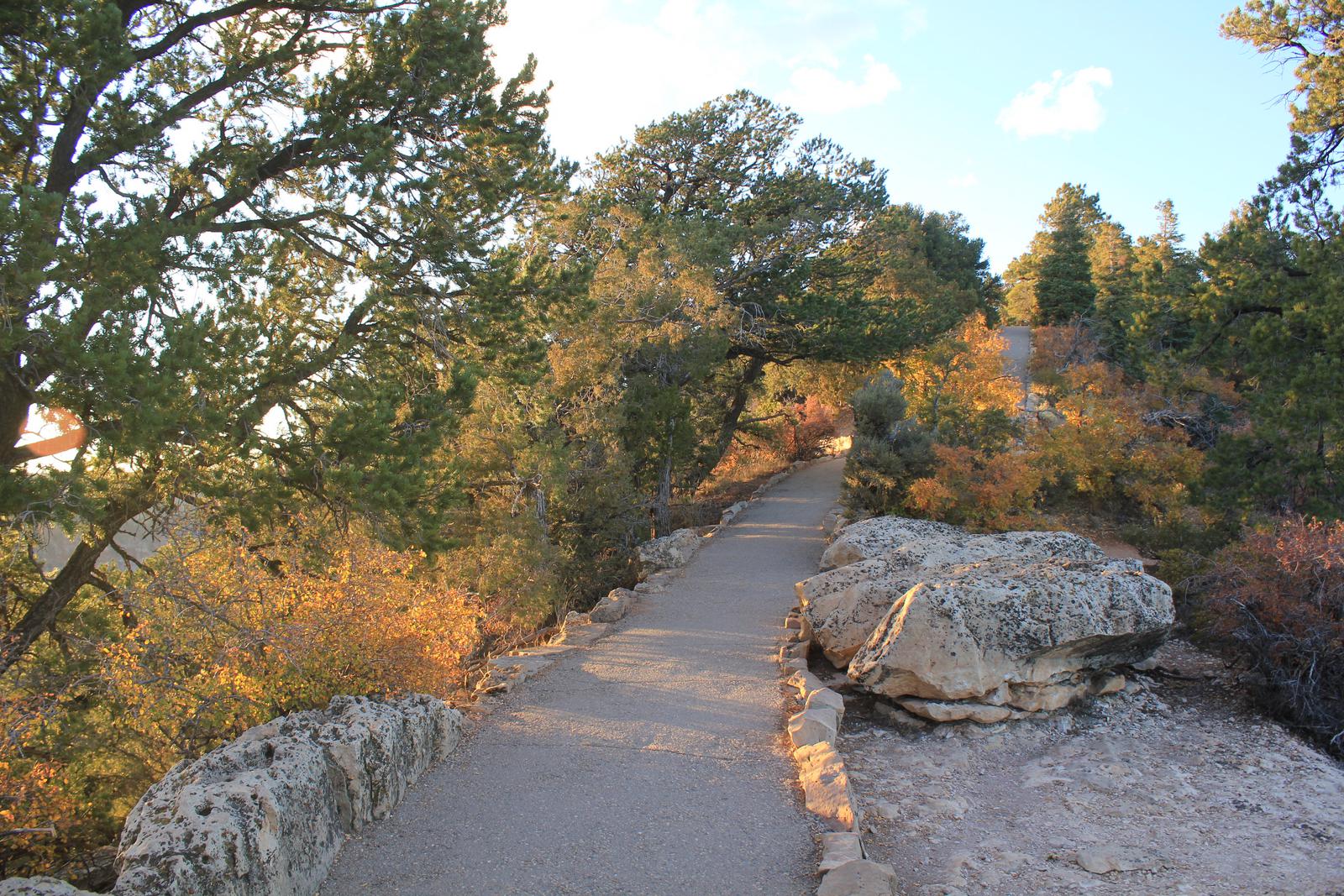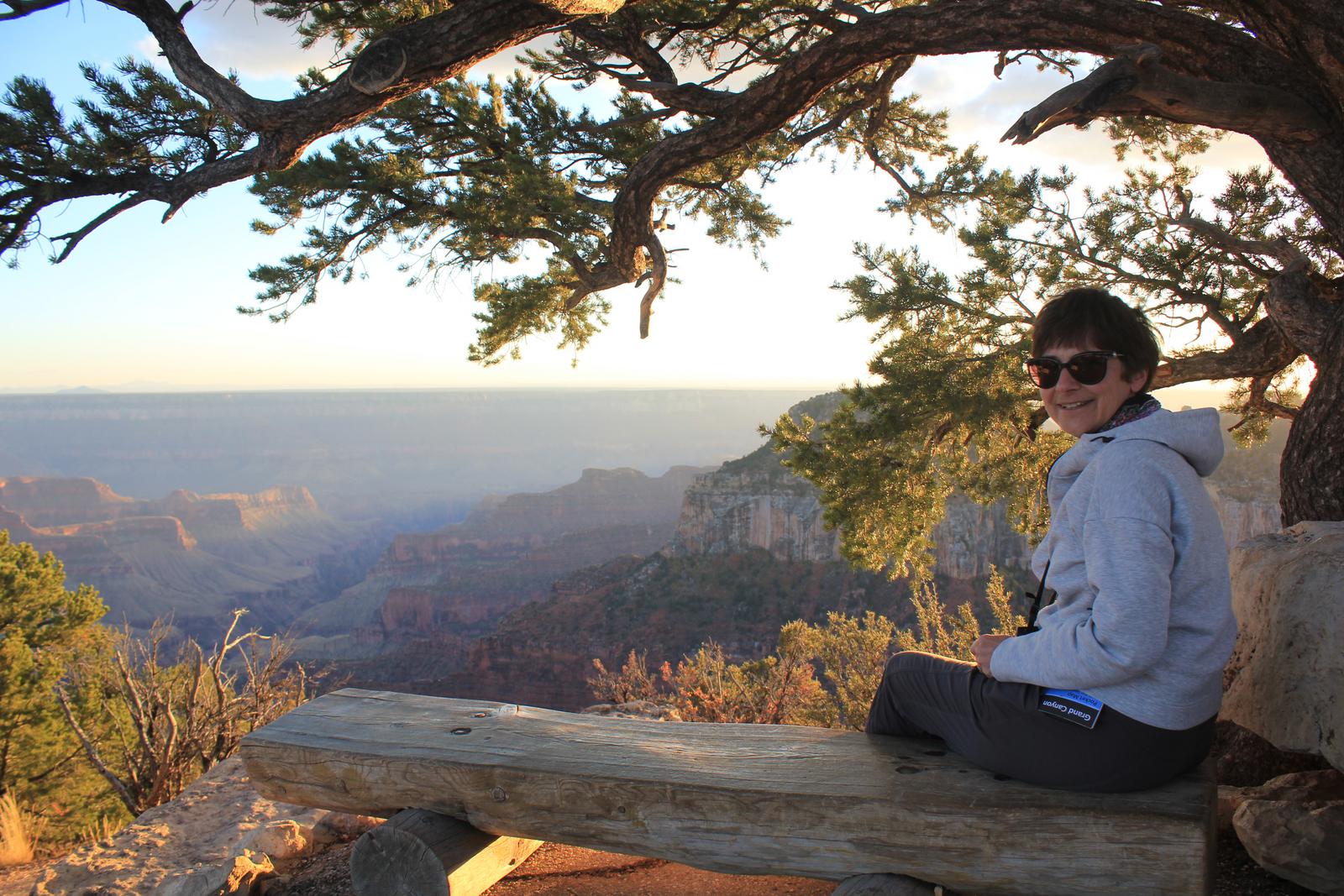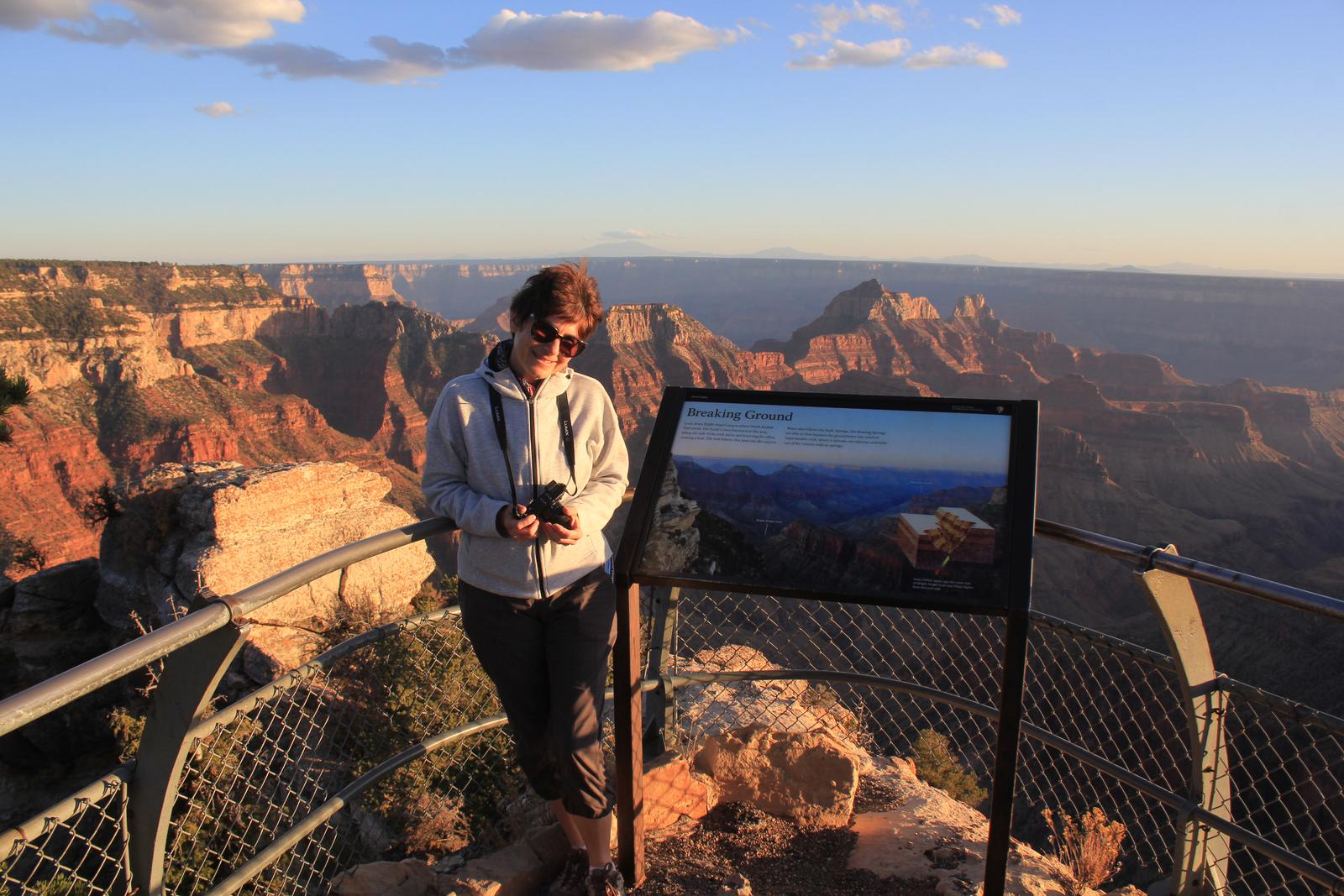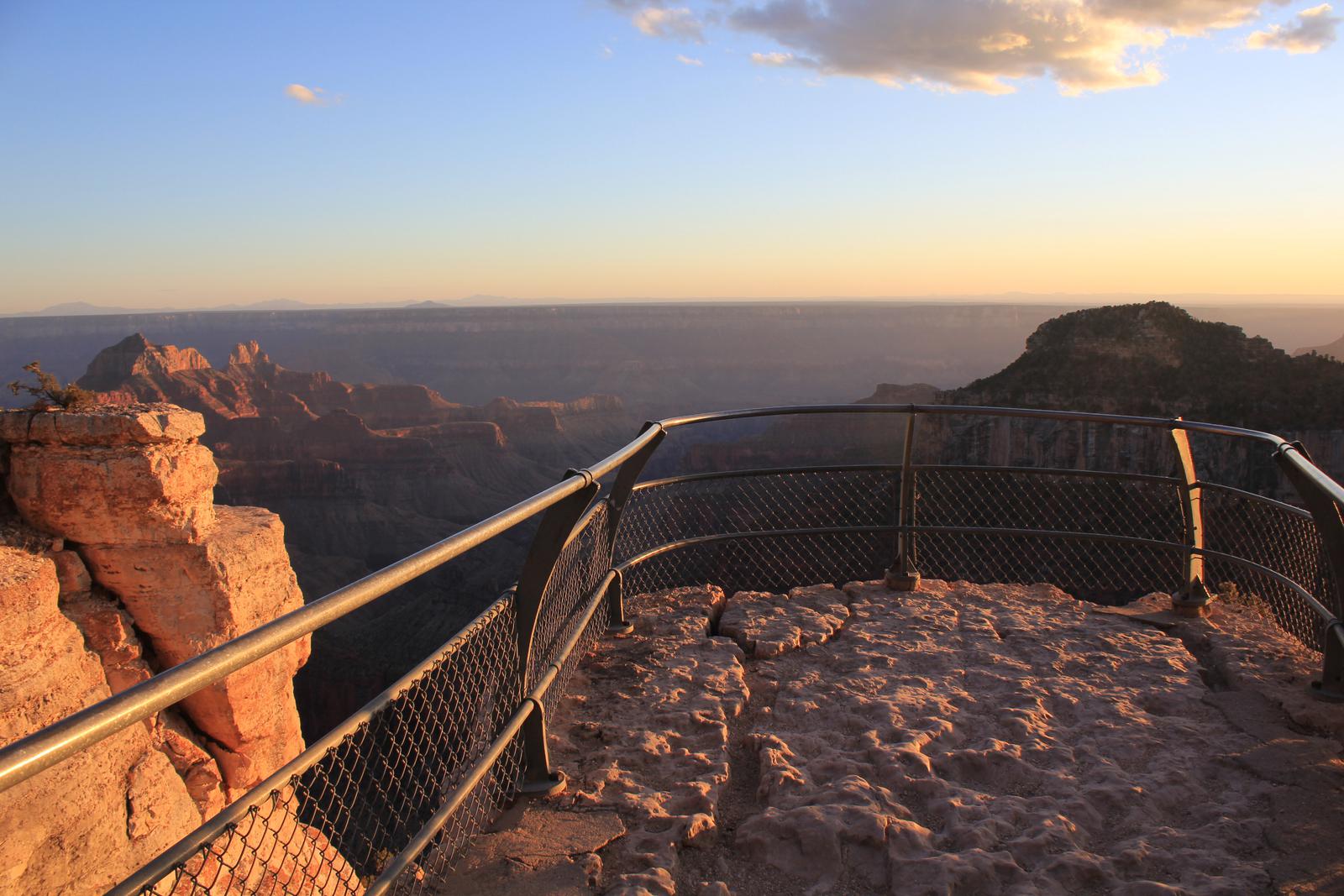 La saison est terminée, le Visitor Center et le lodge sont fermés, en revanche le campground est encore ouvert. Nous suivons le sentier jusqu'au Bright Angel Point. Le sentier suit une crête de rochers, par endroit, le passage fait à peine 50cm, avec le précipice de part et d'autre. La vue est vertigineuse, à couper le souffle, si ce n'était pas le vent qui déjà s'en chargait. Nous faisons les différents points de vue autour du Visitor Center, le soleil disparaît à l'autre bout du canyon.