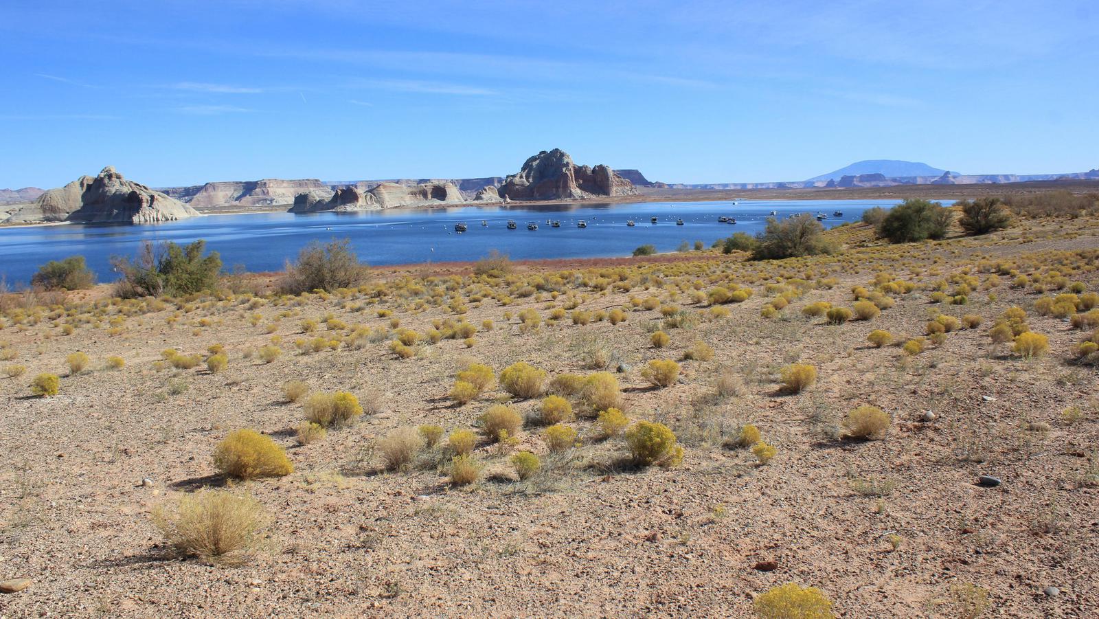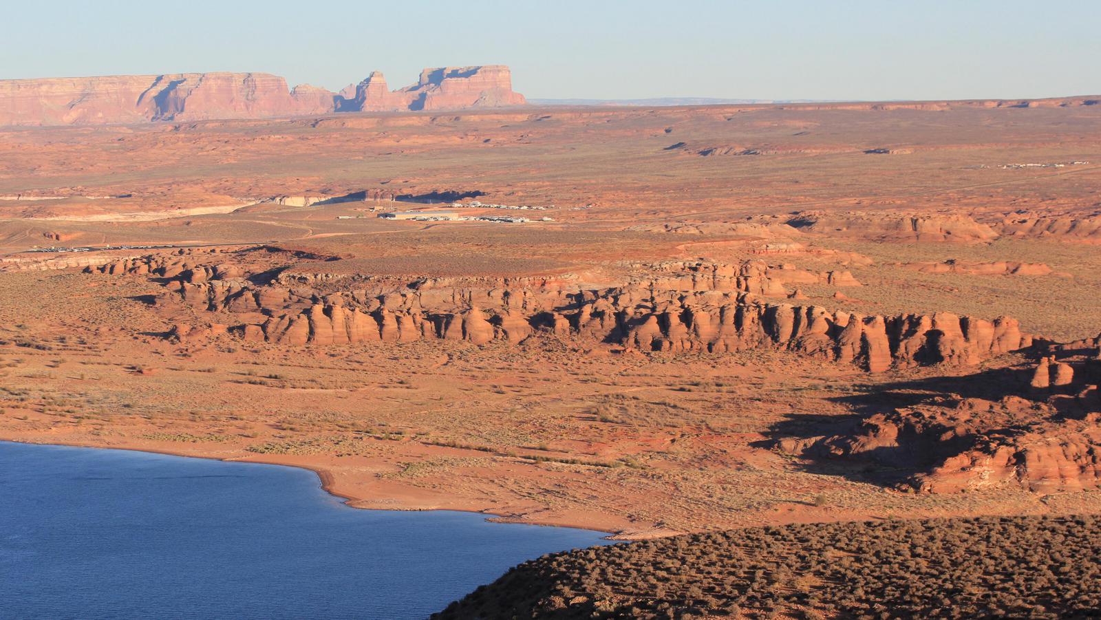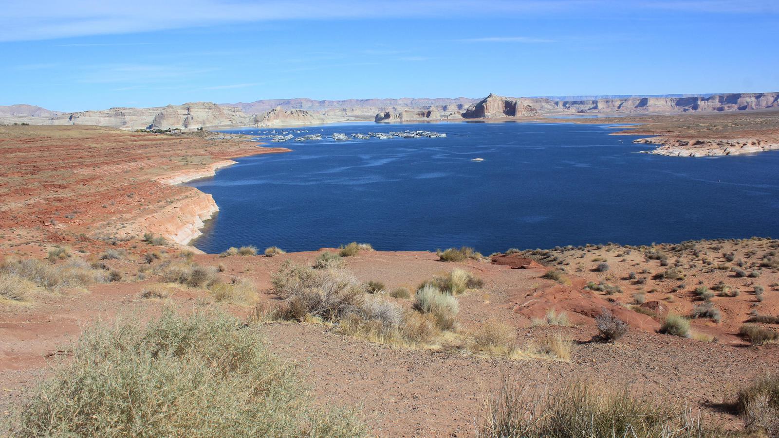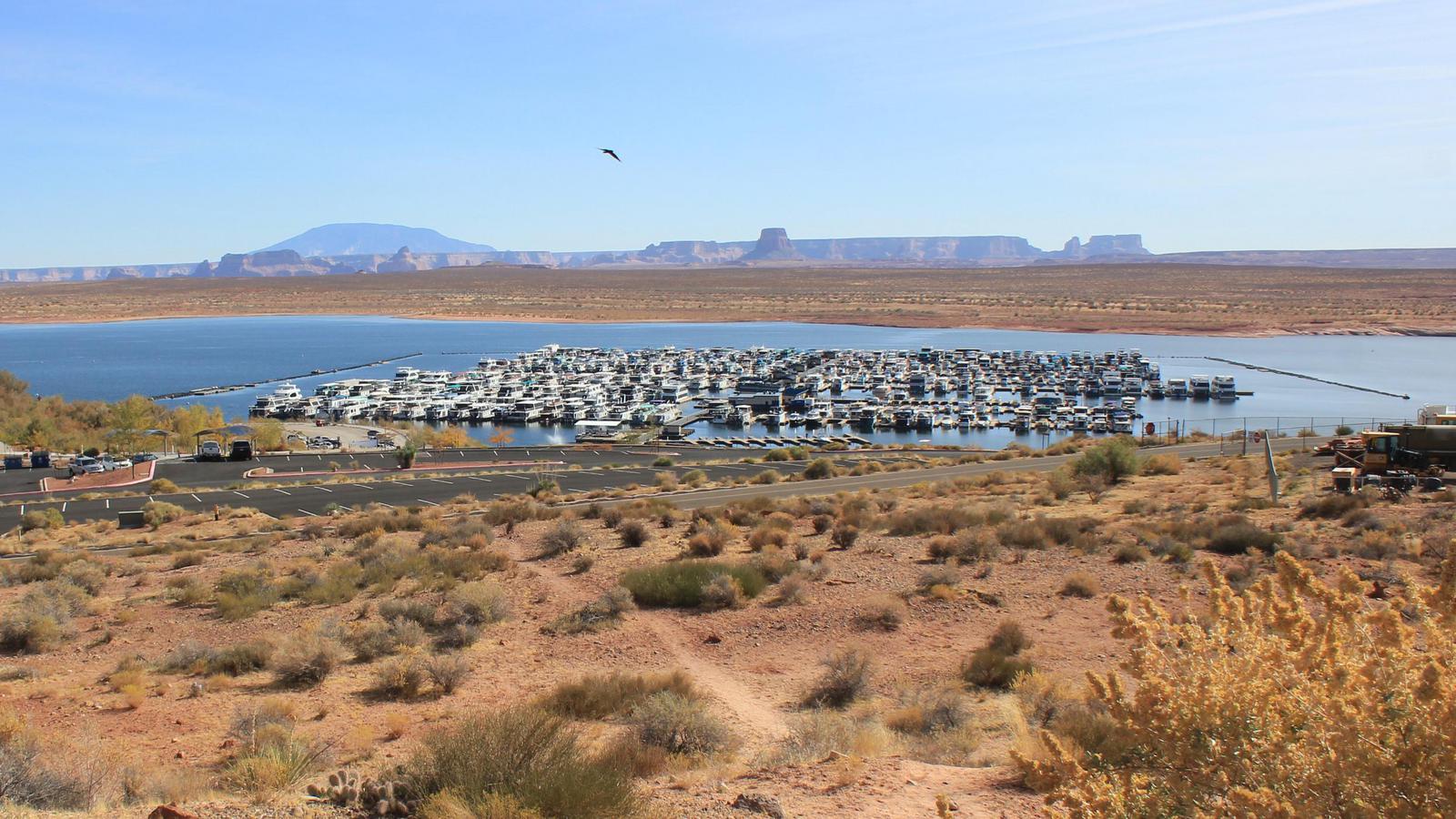 Vers midi, nous partons déjeuner sur le parking du magnifique point de vue sur la Wahweap marina et le lac Powell.