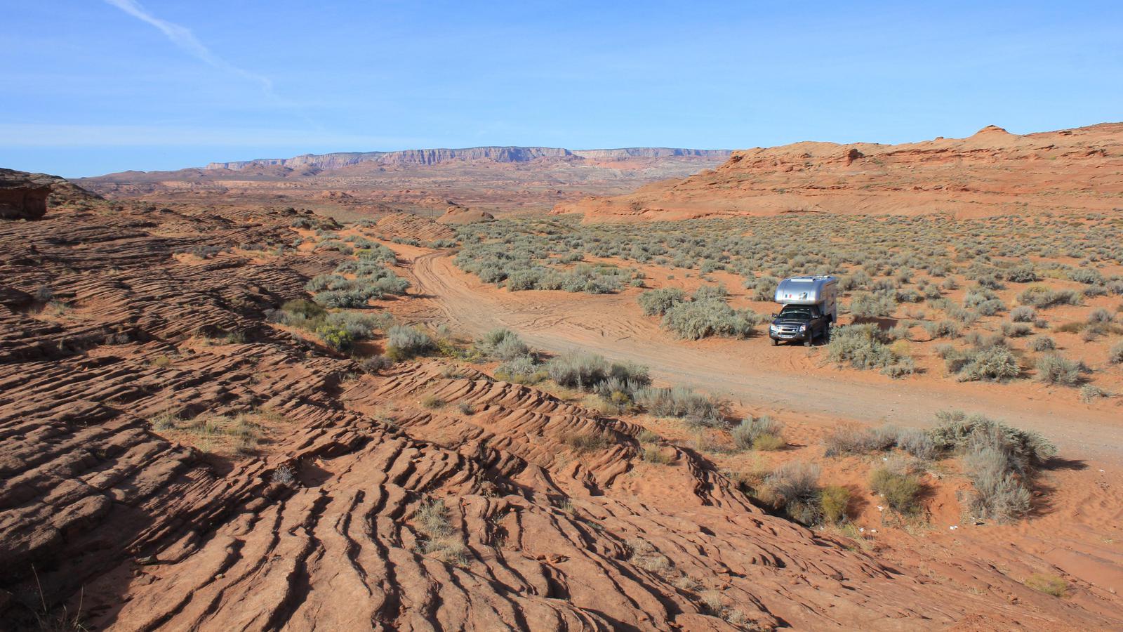 Nous avons repéré à l'aller les sites répertoriés sur ioverlander. Aucun ne nous a plu, de plus compte tenu des conditions météo, nous pensons qu'il est plus judicieux de bivouaquer dans un endroit moins exposé. Nous décidons de rejoindre Page.