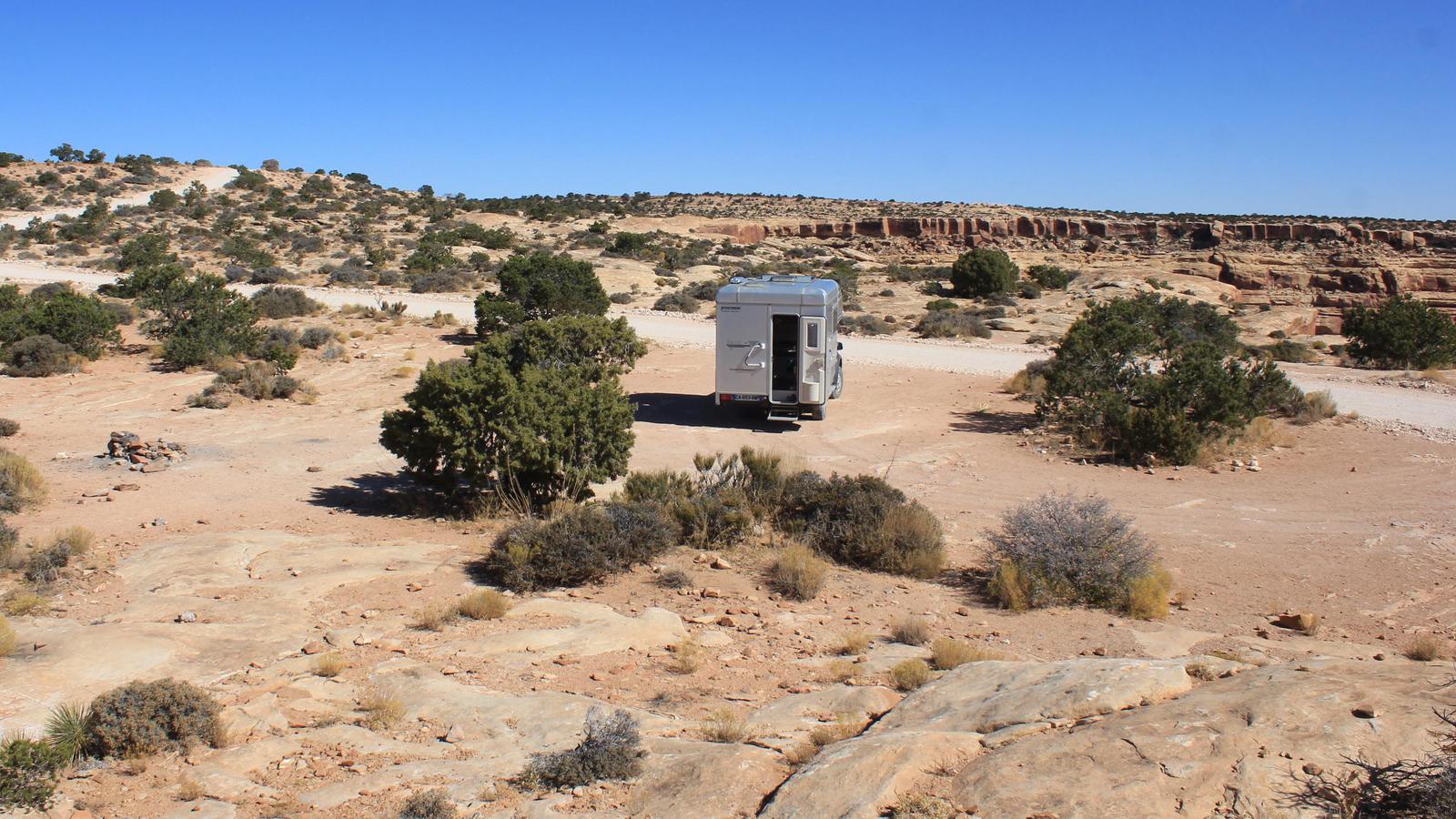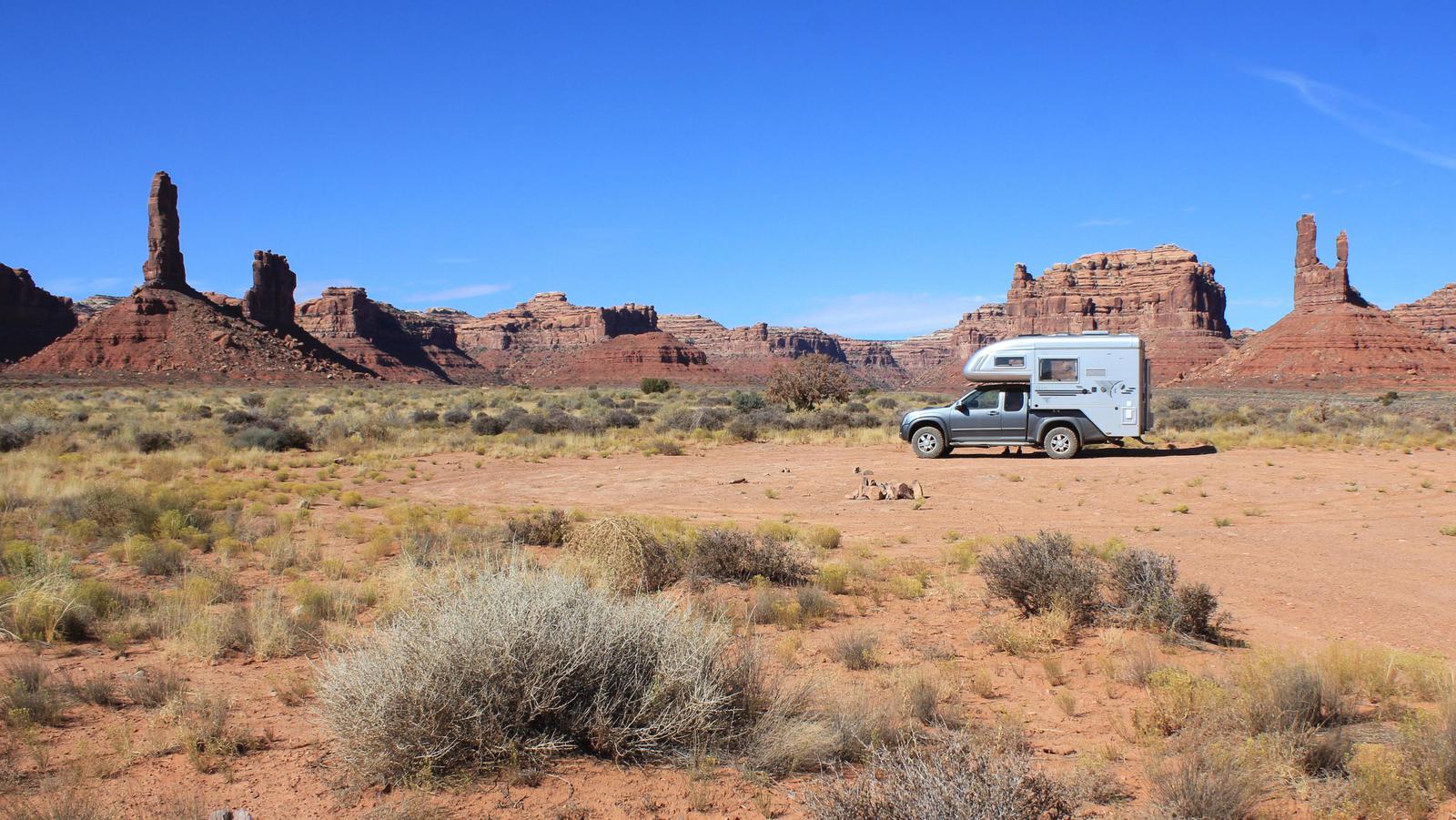 Le début de la piste n'est pas particulièrement intéressant, mais elle le devient au bout d'environ cinq kilomètres et nous retrouvons les paysages traversés la veille à Monument Valley. Le chemin est en assez bon état, mais il comporte de nombreux dos d'âne dans sa première partie qui auraient peut-être posé problème à notre porte-à-faux ... Valley of the gods est gérée par le BLM et il est autorisé de camper sur un des nombreux spots que nous rencontrons.