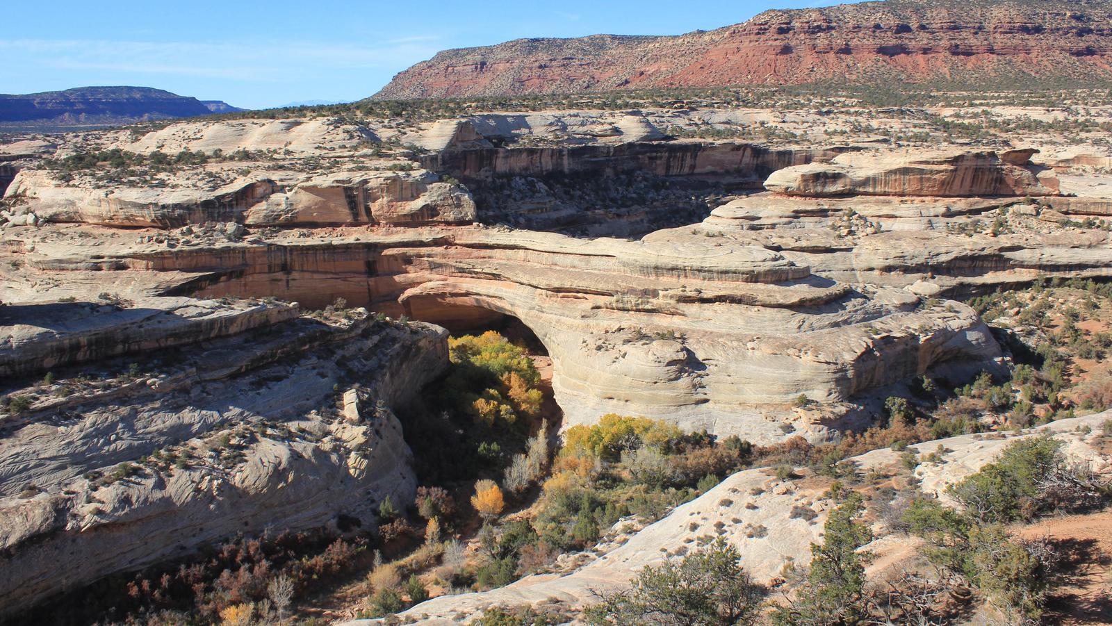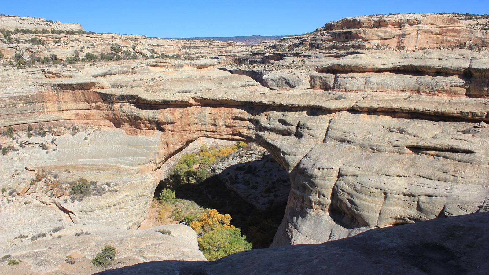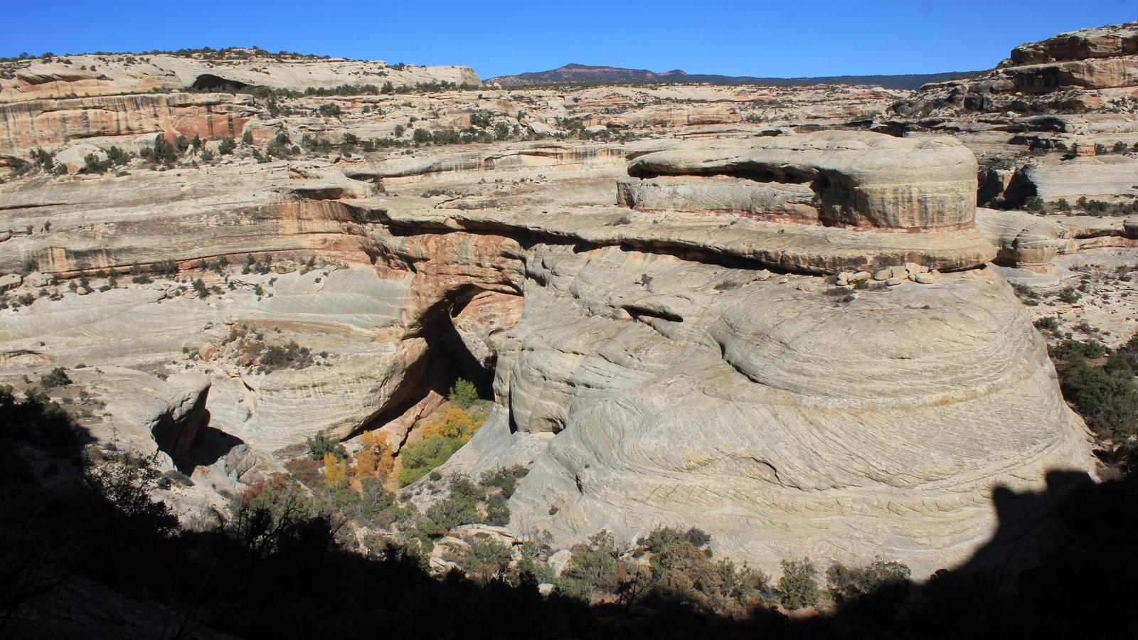 Nous revenons sur la route 261 et roulons jusqu'à Natural Bridges National Monument. Ce petit parc est assez méconnu et souffre de la concurence des autres parcs prestigieux. Il renferme cependant trois des cinq plus grands ponts naturels au monde et le pass America the Beautiful est accepté. Nous prenons la carte du parc au Visitor Center et suivons la route circulaire menant aux différents points de vue.