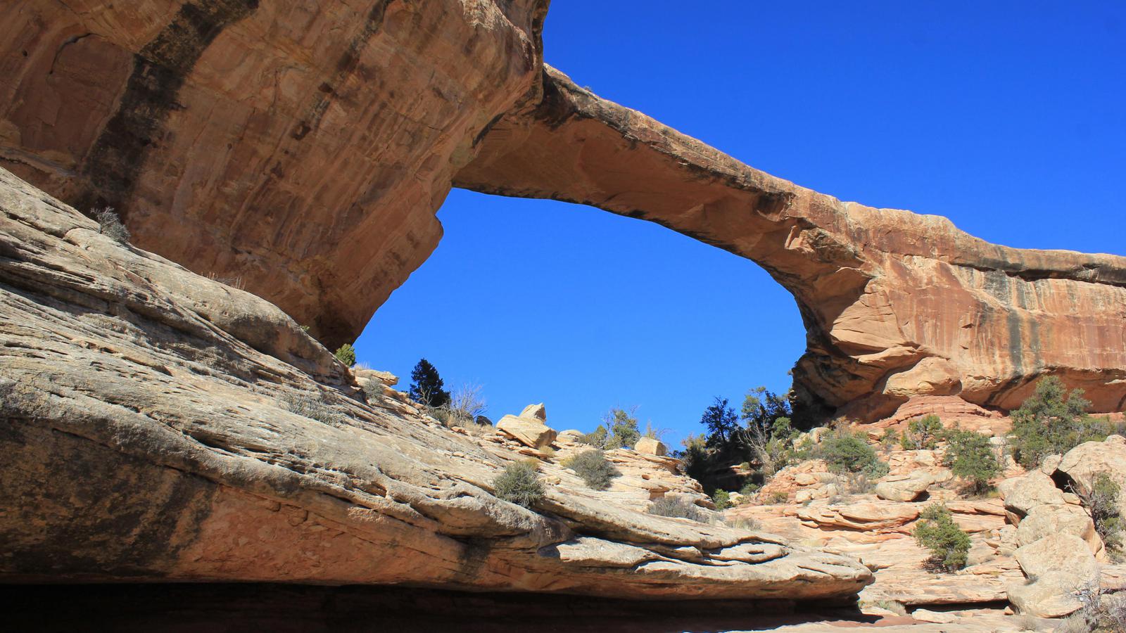 A la différence des arches que nous avons vues près de Moab, ces ponts ne sont pas le fruit de l'érosion sous l'action du vent et de la pluie, mais de celle de la rivière. Le premier que nous découvrons est Sipapu Bridge, le pont le plus haut et le plus impressionnant du parc. Un sentier équipé d'escaliers métalliques nous mène sur une spectculaire corniche face à l'ouverture du pont...