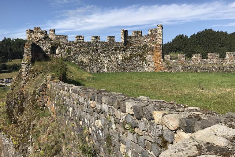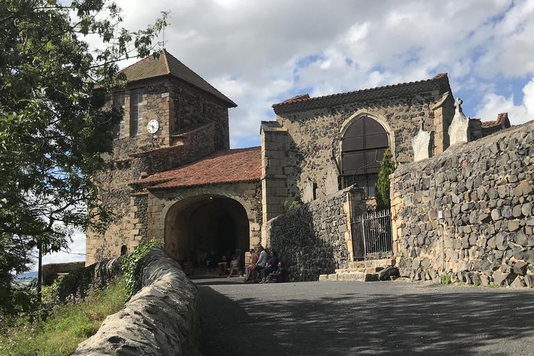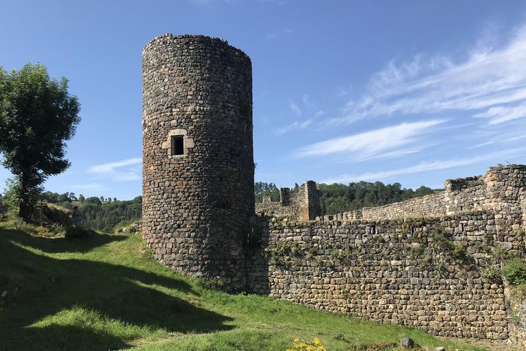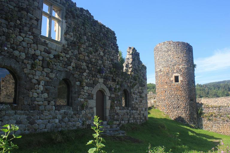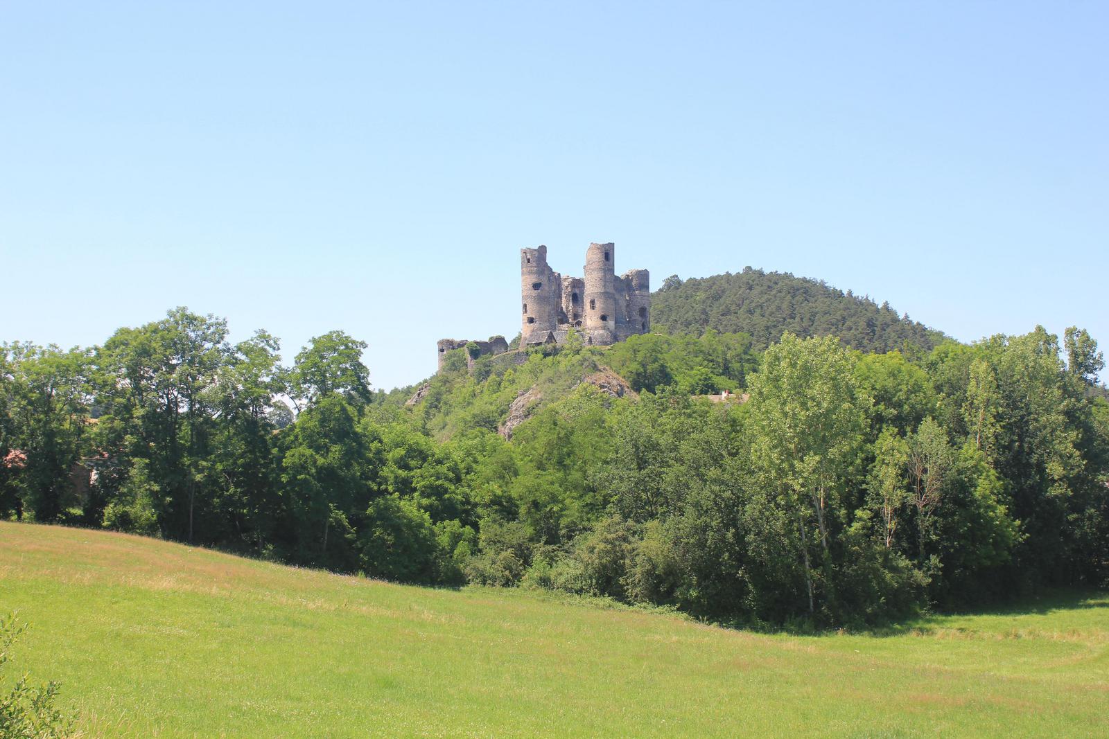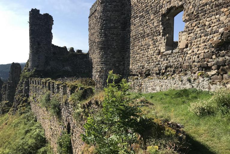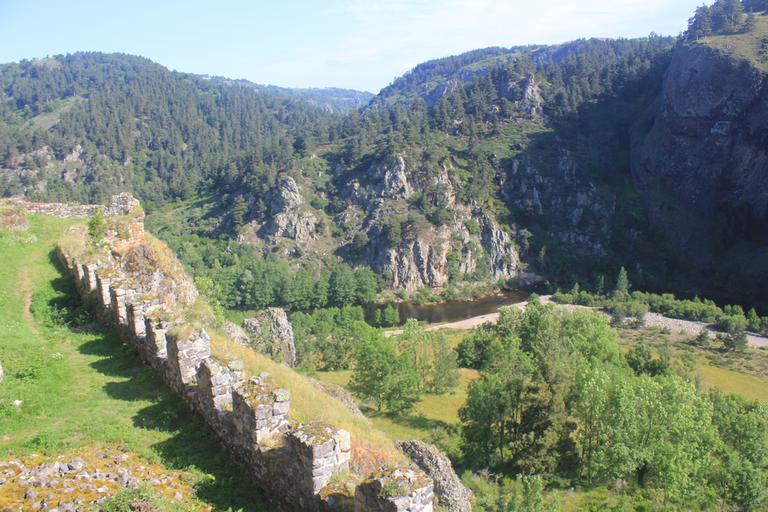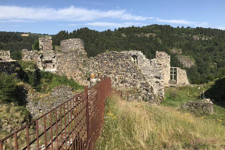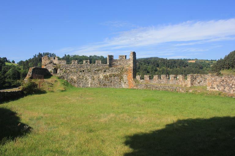 Arlempdes, "le premier château de la Loire au pays des volcans"... Nous pénétrons dans le village par une haute porte de pierre datant du XIè siècle et débouchons directement sur la place. Devant nous se dresse l'église Saint-Pierre, dont la partie la plus ancienne remonte au XIIè siècle. Nous sommes au pied du piton rocheux, les ruines du château sont juste au-dessus de nous. Le chemin empierré nous mène devant une grille, pour aller plus loin, une affiche indique que la clé est à retirer à l'unique auberge du village...