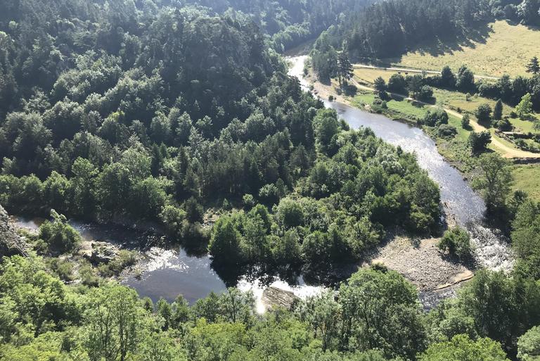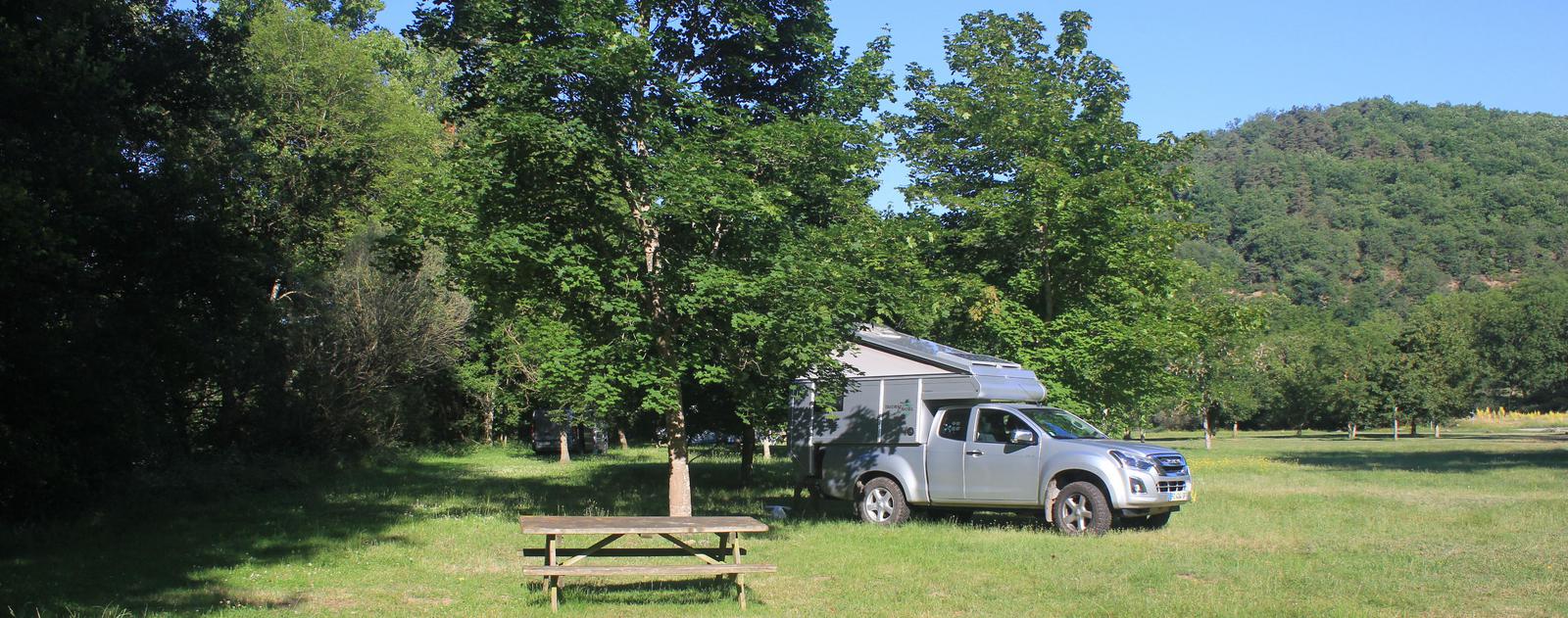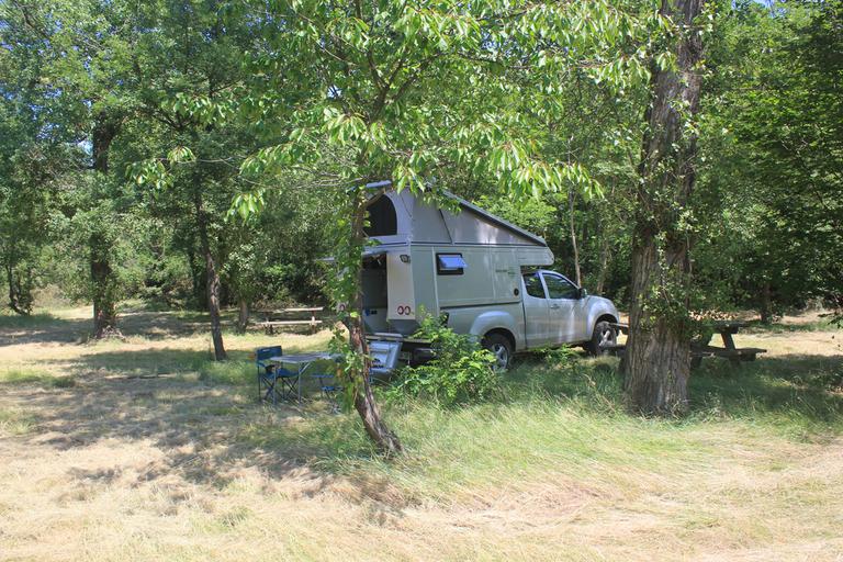 Nous arrivons à Lavaudieu en fin d'après-midi. A l'entrée du village, une immense prairie ombragée et fauchée se tient à notre disposition. Quelques camping-cars sont déjà installés aux quatre coins du pré, nous nous posons près d'une table de pique-nique, juste au bord de la rivière.