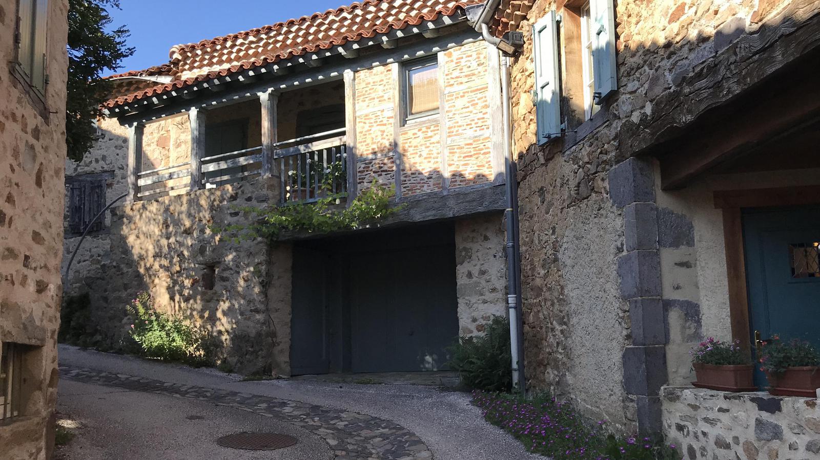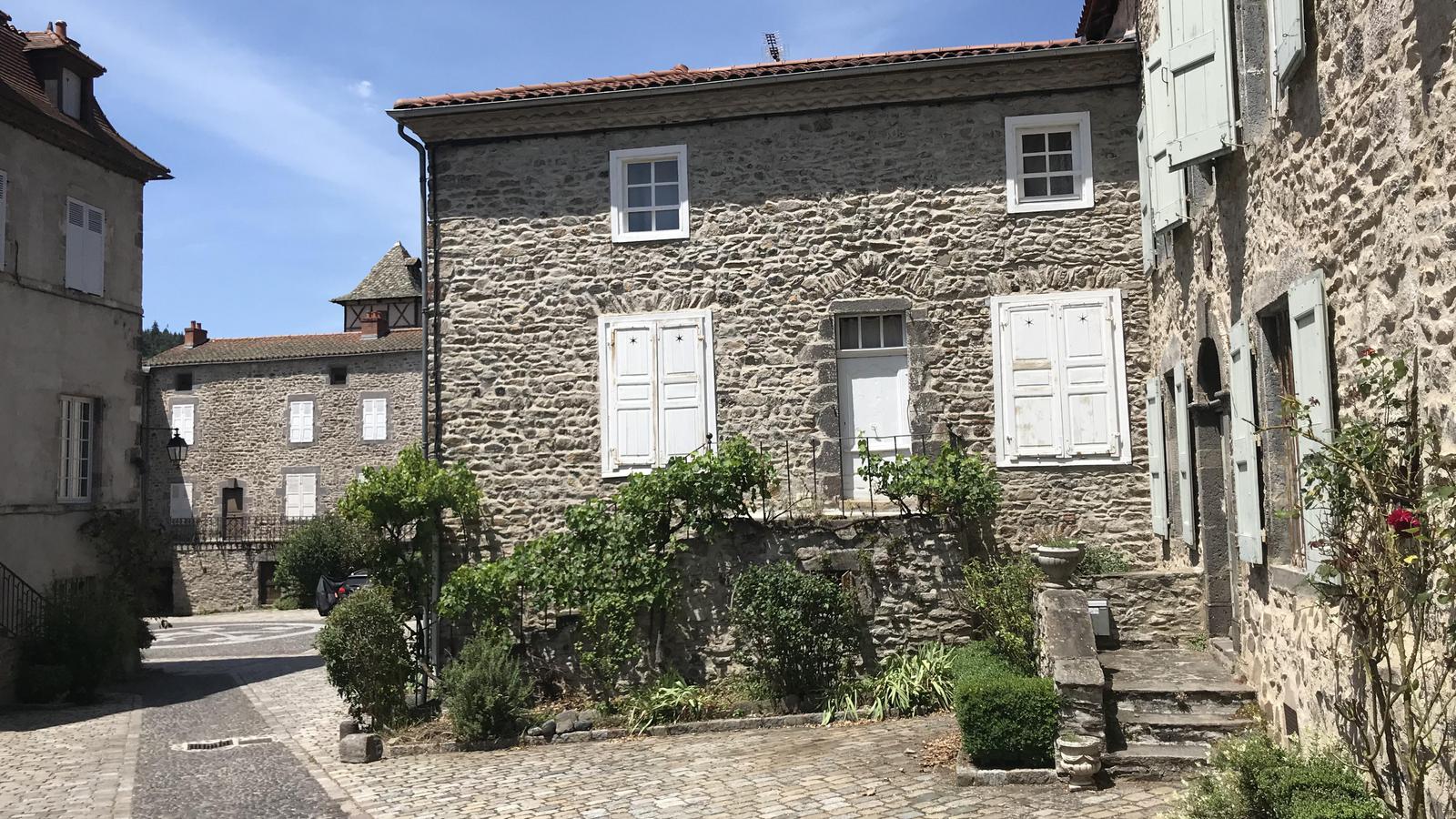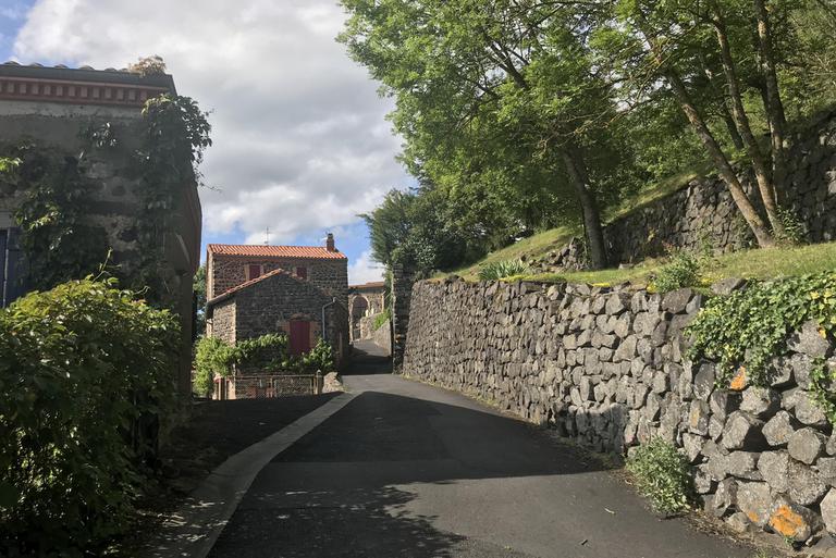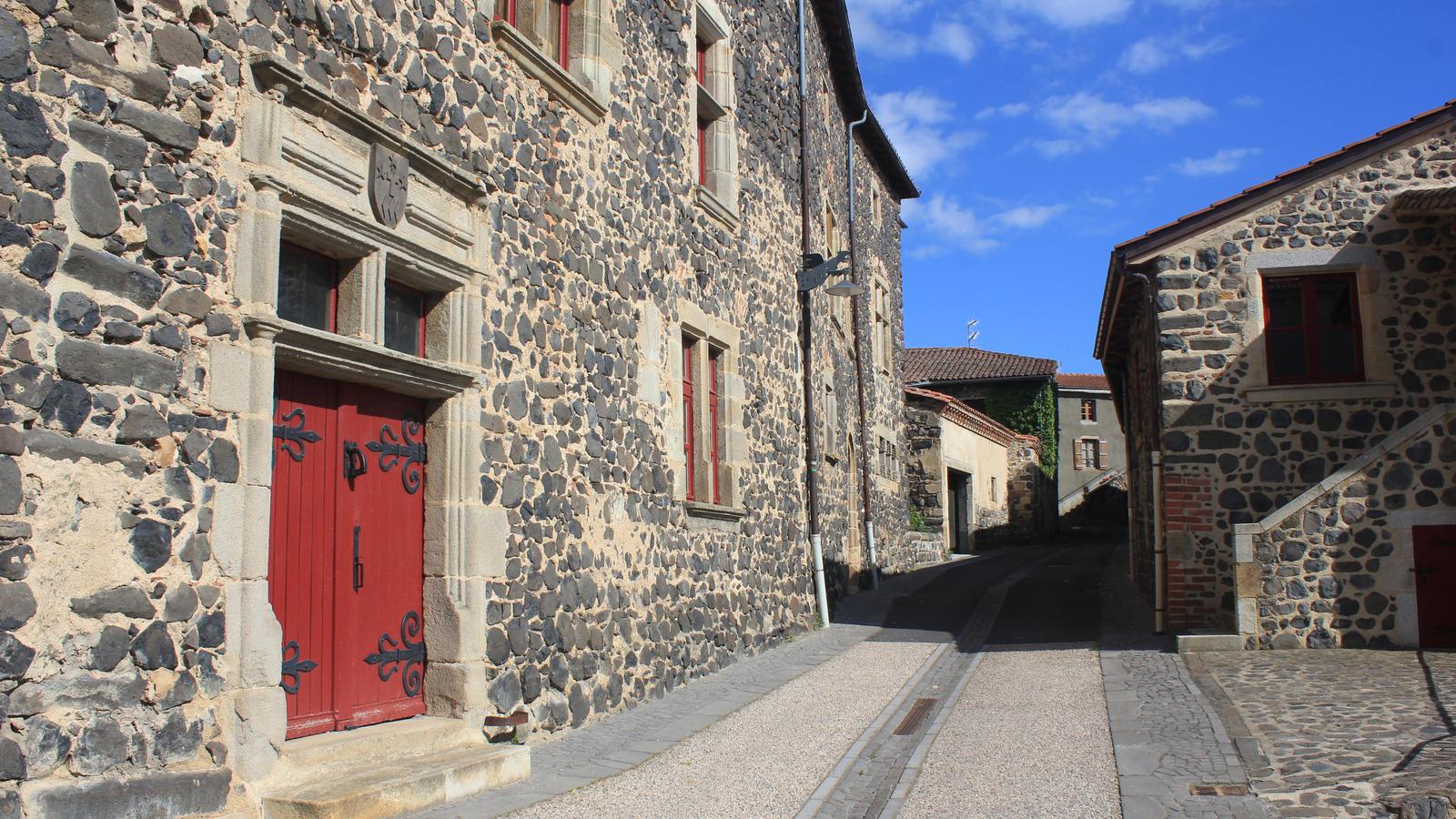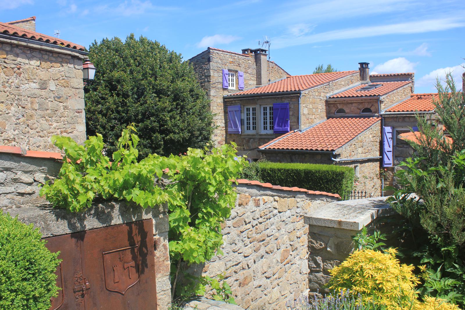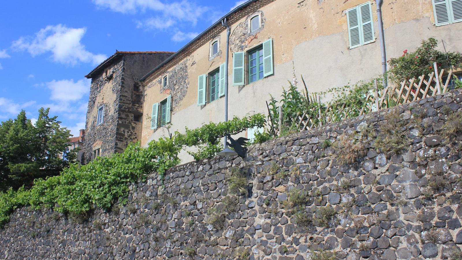 Nous retrouvons ici les constructions en pierres volcaniques typiques de la région. Le village occupe toute la partie inférieure de la butte, nous suivons les rues en pente et arrivons sur la place de la Reine Margot. Nous poursuivons notre ascension en longeant une grande bâtisse du XVIè siècle aux nombreux détails sculptés, la Maison des Capitaines...