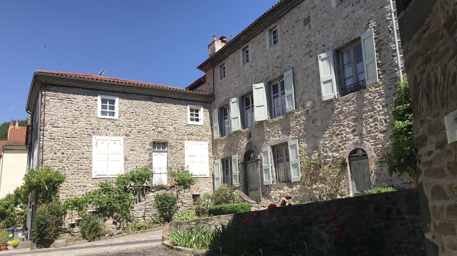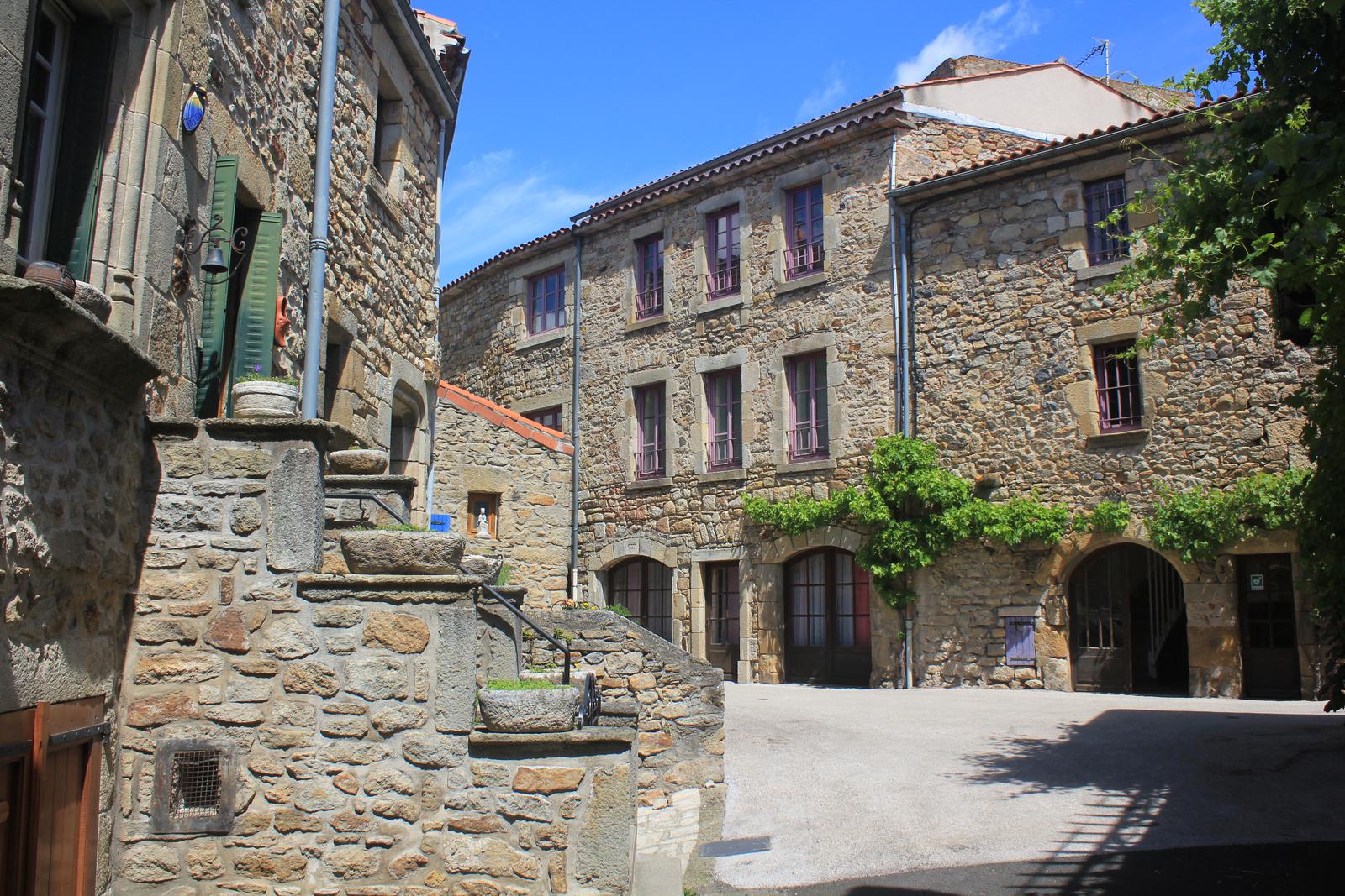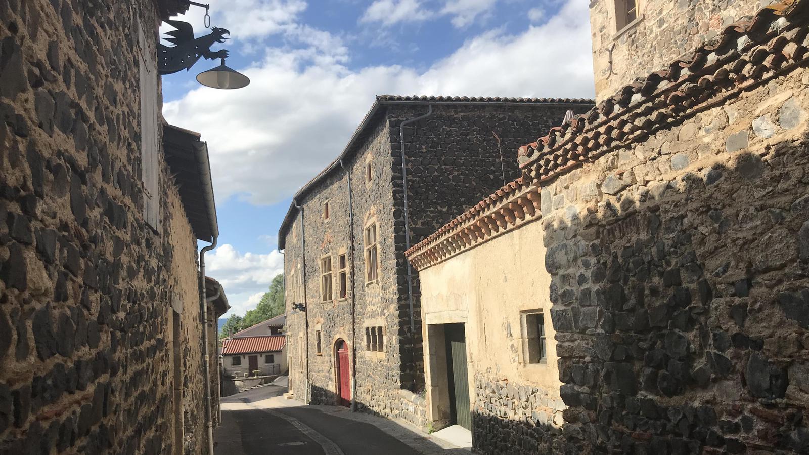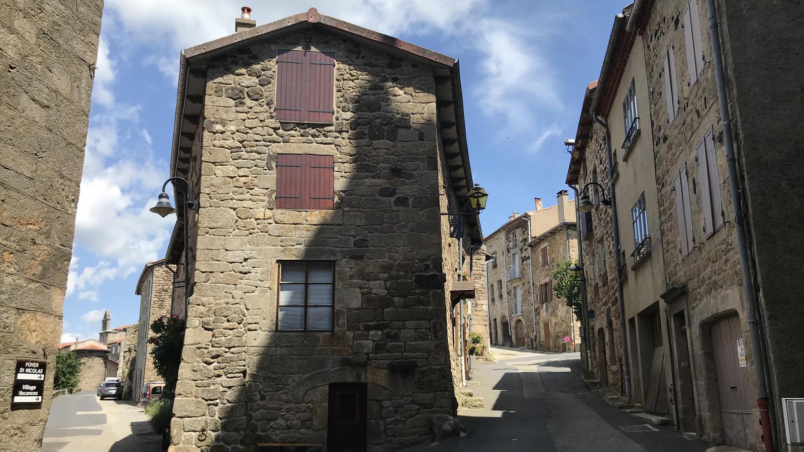 Nous retrouvons ici les constructions en pierres volcaniques typiques de la région. Le village occupe toute la partie inférieure de la butte, nous suivons les rues en pente et arrivons sur la place de la Reine Margot. Nous poursuivons notre ascension en longeant une grande bâtisse du XVIè siècle aux nombreux détails sculptés, la Maison des Capitaines...