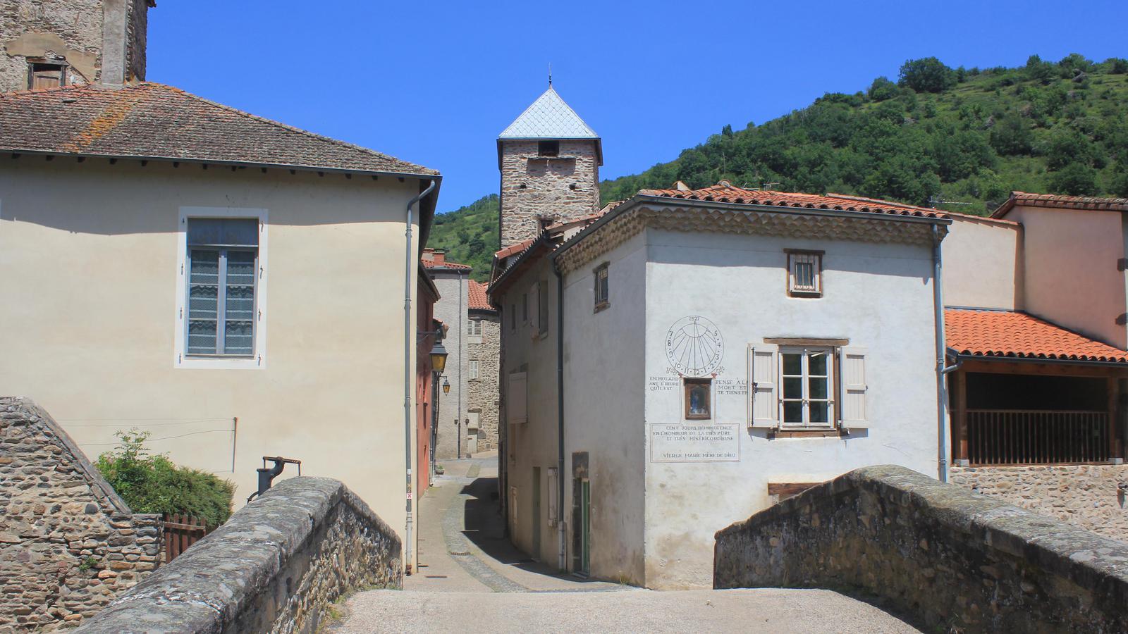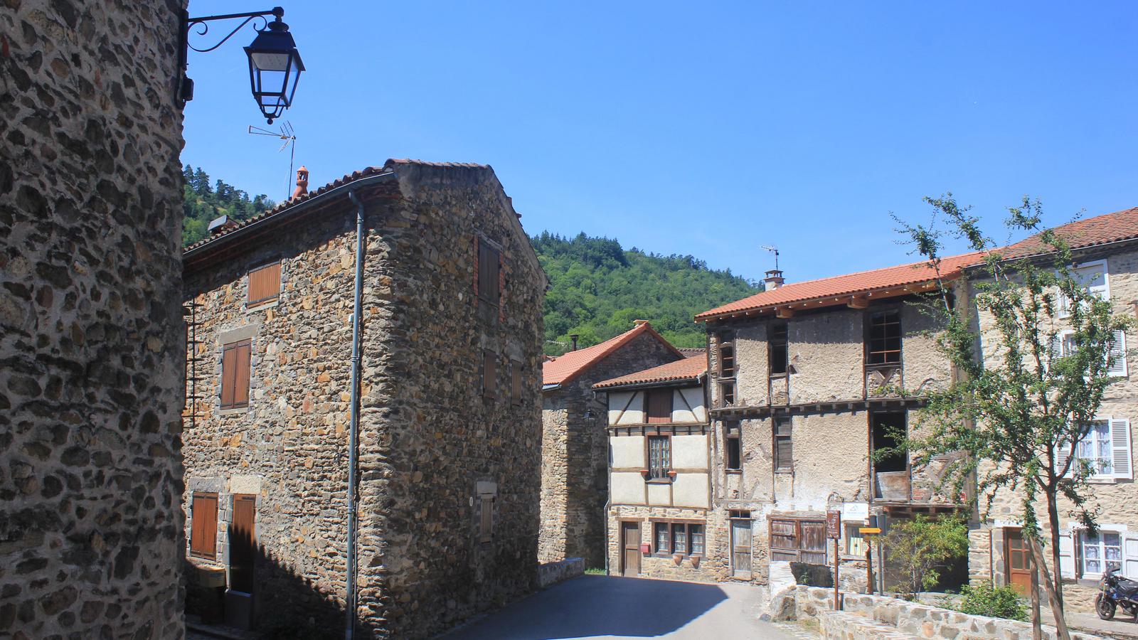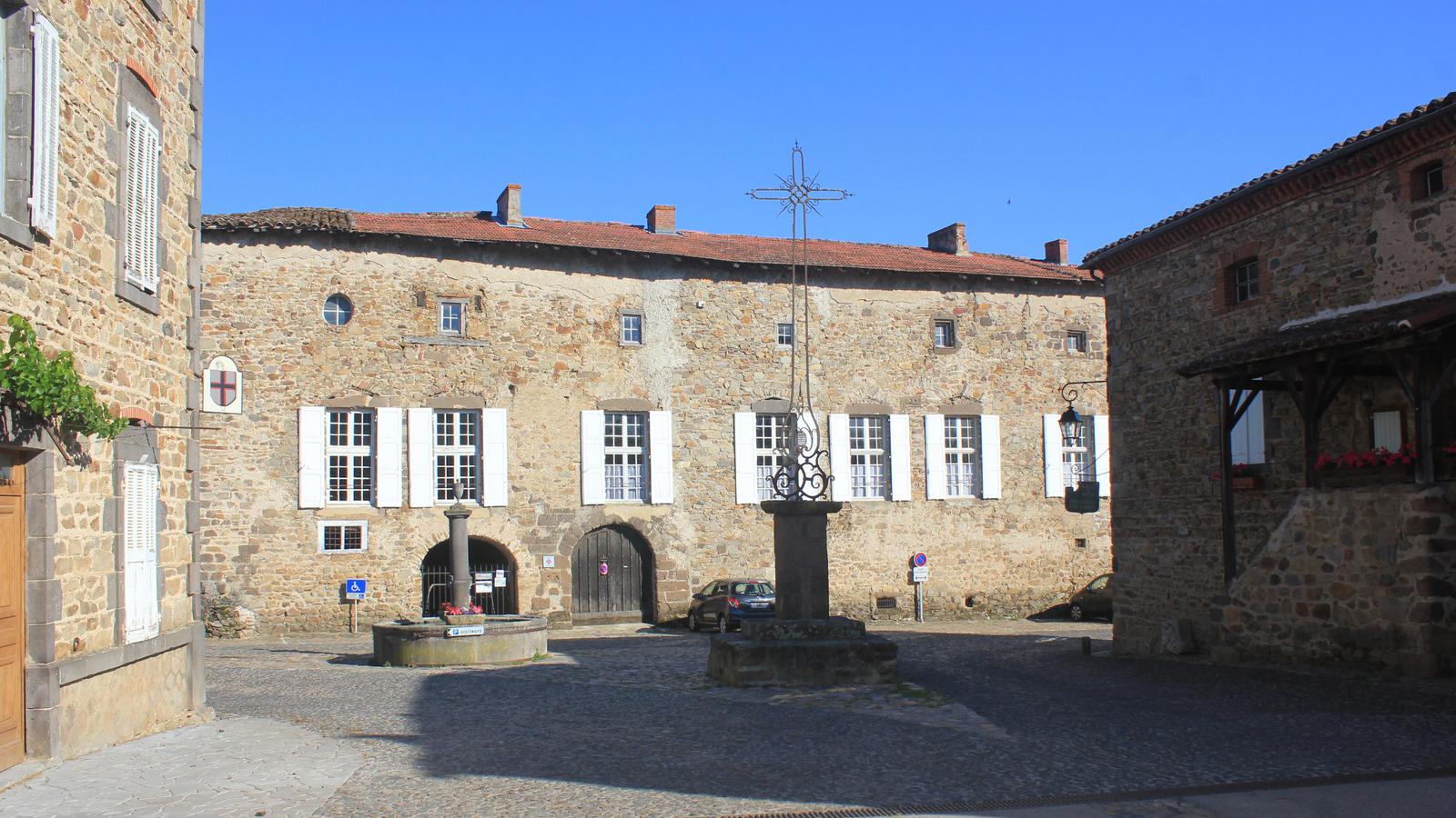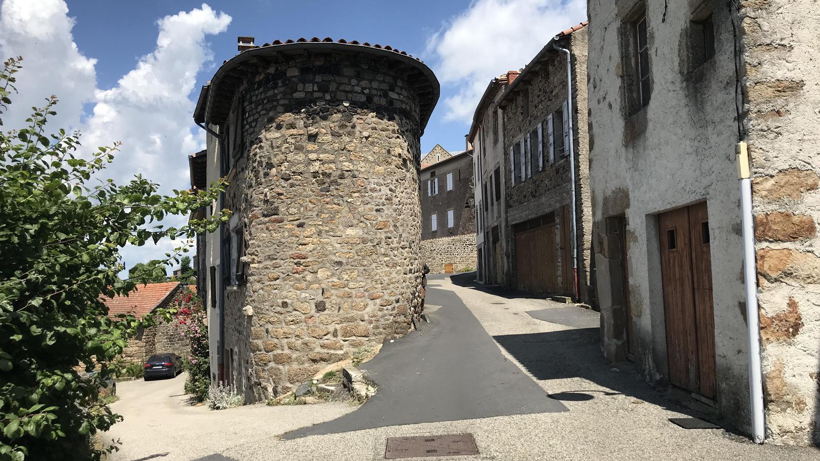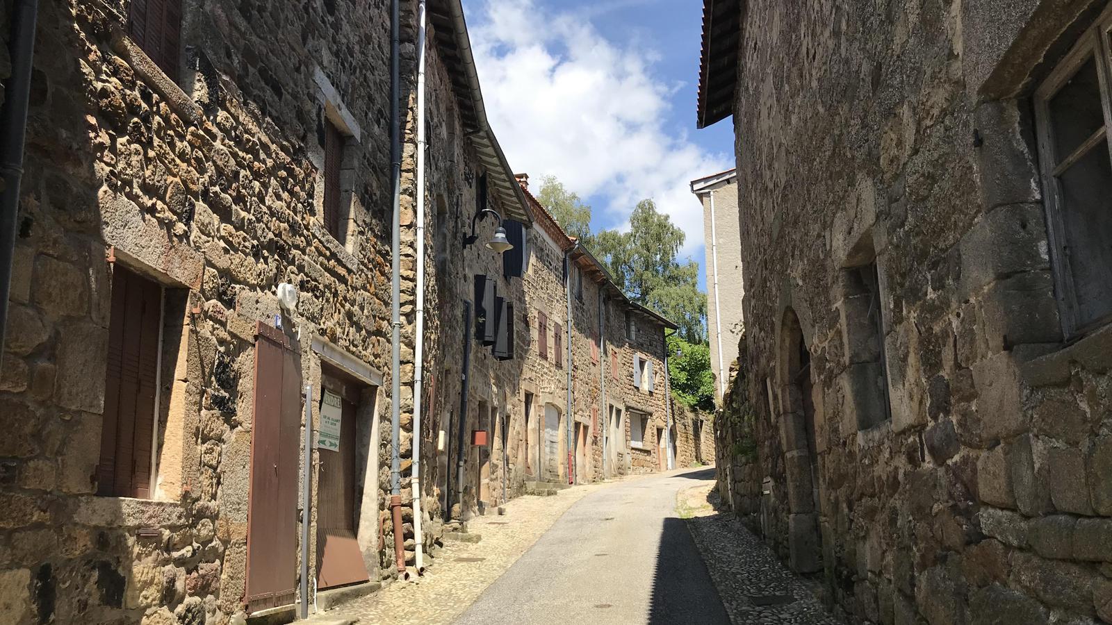 Nous retrouvons ici les constructions en pierres volcaniques typiques de la région. Le village occupe toute la partie inférieure de la butte, nous suivons les rues en pente et arrivons sur la place de la Reine Margot. Nous poursuivons notre ascension en longeant une grande bâtisse du XVIè siècle aux nombreux détails sculptés, la Maison des Capitaines...
