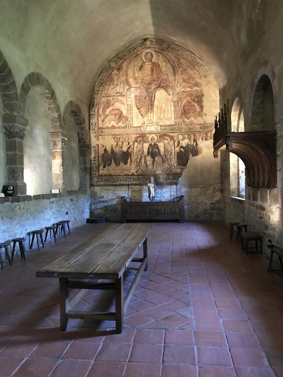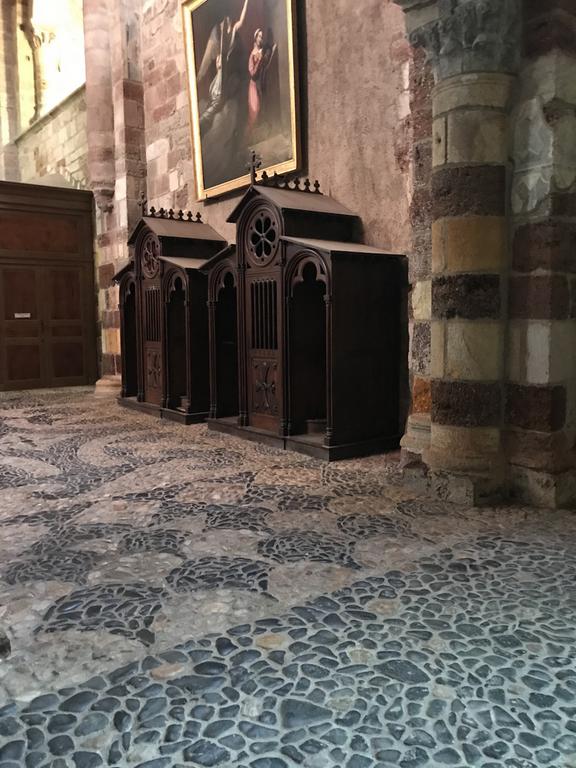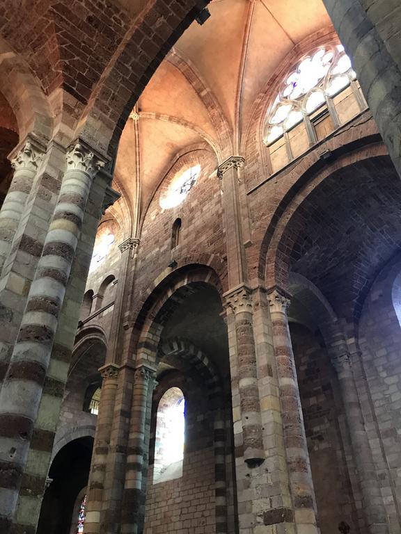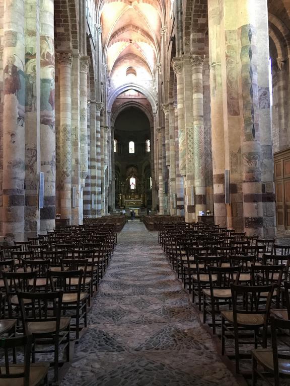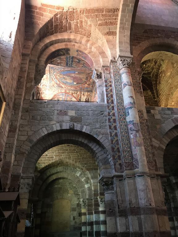 Contrairement à ce à quoi nous nous attendions, l'intérieur de cette basilique romane n'est absolument pas austère, bien au contraire. Du sol, composé de galets de basalte et de quartz, aux voutes ornées de peintures, en passant par les piliers maçonnés en pierres polychromes, l'édifice est lumineux et coloré.
