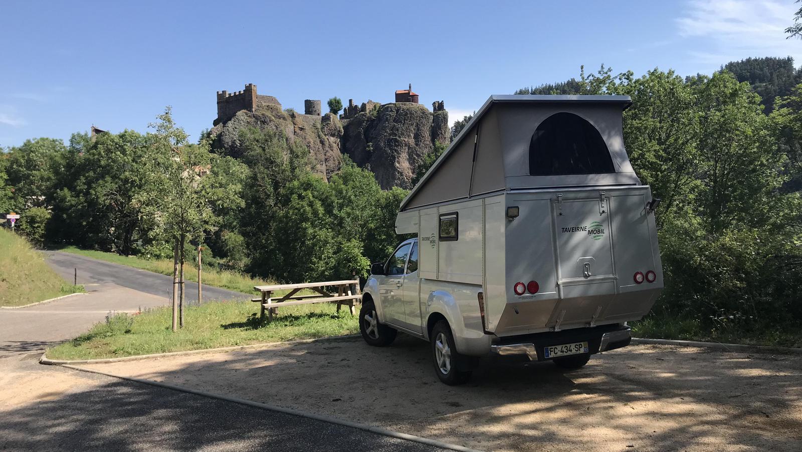 Quelques emplacements ont été aménagés en dessous du village pour les camping-cars. Nous nous y installons pour la nuit, nous sommes au pied du piton rocheux et du château.