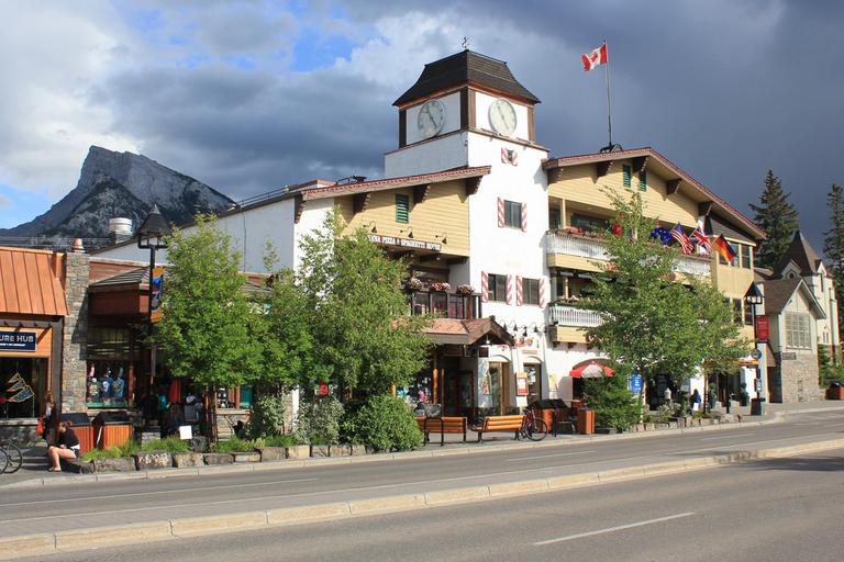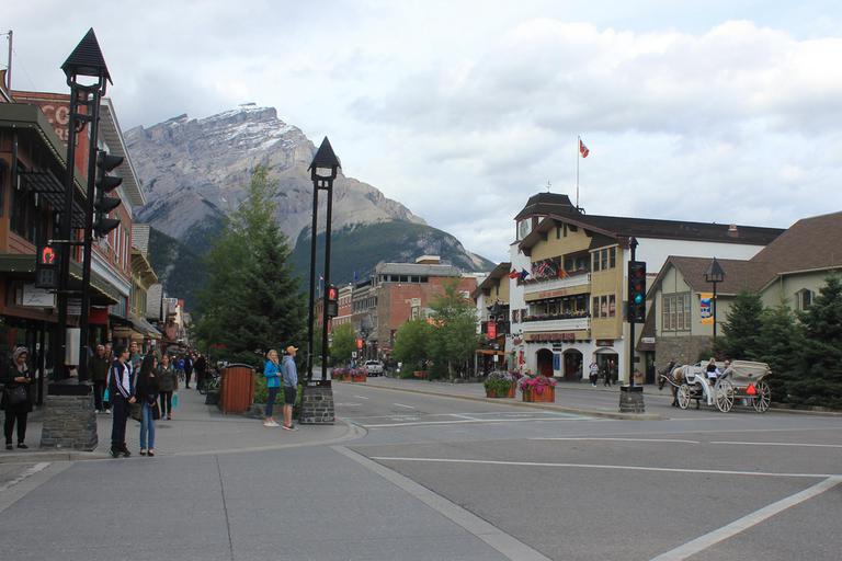 Nous laissons notre véhicule près d'un parc de loisirs au bord de la rivière Bow et partons à la découverte de la station. Nous passons devant le vieux chalet du musée du parc, et arrivons devant la rue principale. C'est une grande avenue bordée de commerces et de restaurants, avec de larges trottoirs, traversée par une importante circulation automobile sur deux fois deux voies. Une foule cosmopolite à forte dominante asiatique se presse dans les boutiques, à l'affût du moindre bibelot estampillé Canada. Nous faisons un aller et retour sur cette avenue et revenons à la voiture.