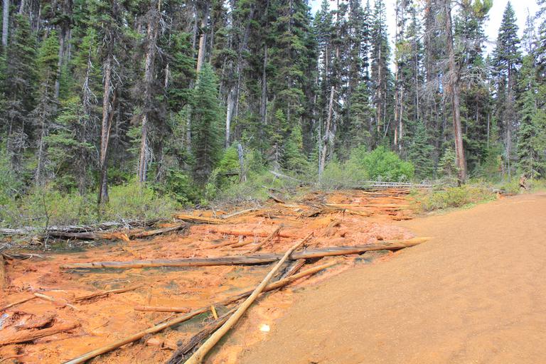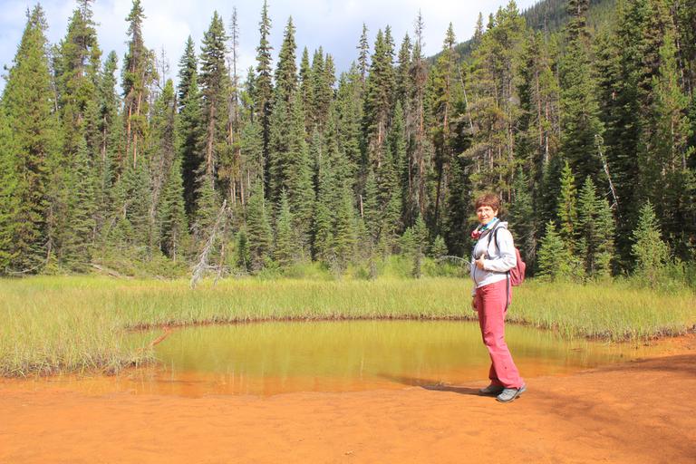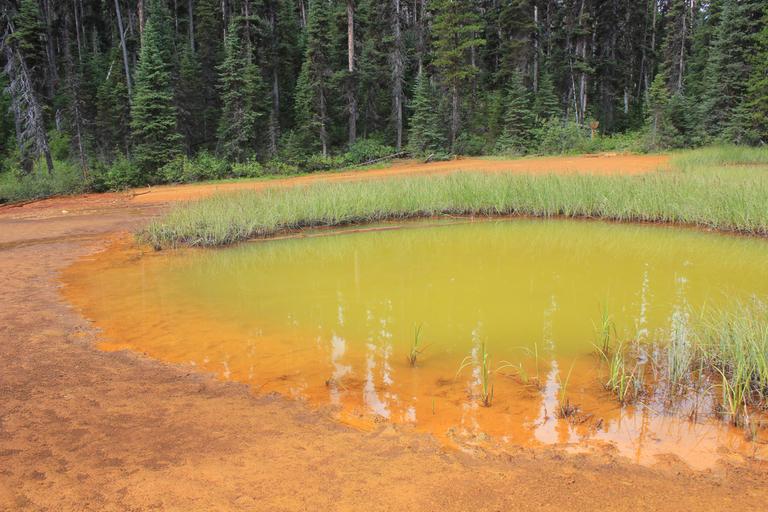 La première balade qui nous est proposée est Paint Pots, les pots de peinture. Une petite marche d'une demi-heure nous amène vers des sources d'eaux chargées en oxyde de fer. L'eau des mares vertes s'oxyde à la périphérie et colore le sol des alentours en ocre-rouge. Ces terres étaient utilisées par les amérindiens pour leurs peintures de guerre et la décoration des tipis. Superbe.