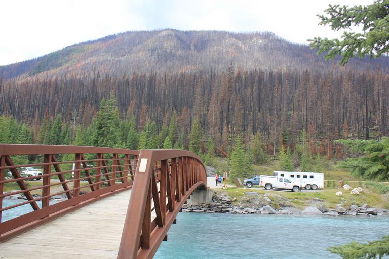 Nous nous arrêtons ensuite près de Vermilion Crossing. Le paysage est marqué par le gigantesque feu de forêt de 2003, seule la bande d'arbres près de la rivière a été sauvegardée. Le message diffusé par les gardes des parcs est plutôt ambigüe, ces incendies sont des catastrophes mais ils les laissent se développer car ils sont utiles à l'écosystème...