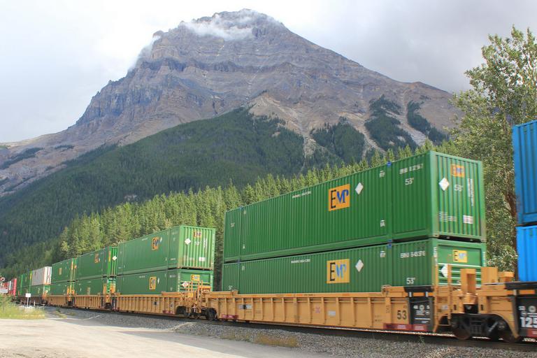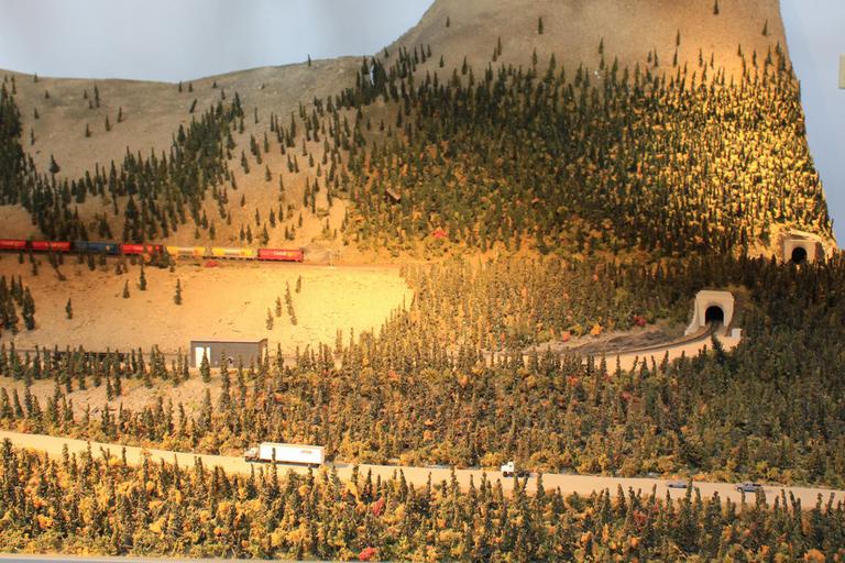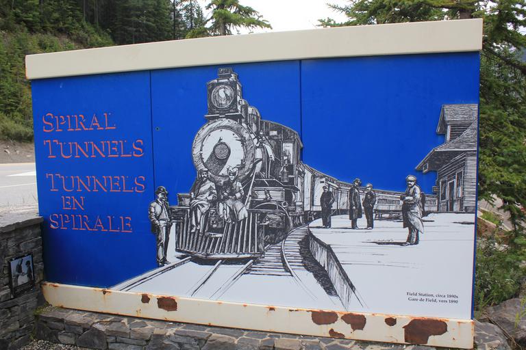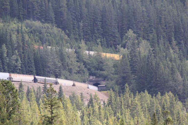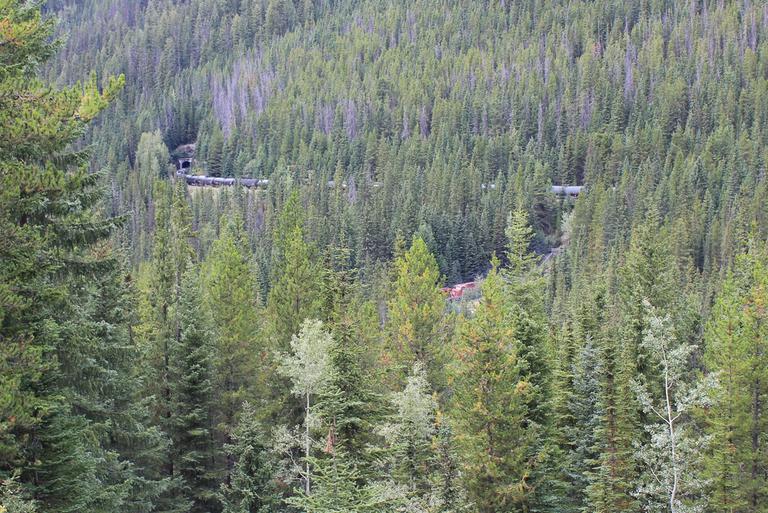Après de nombreux accidents, le Canadien Pacific a opté pour une technique utilisée en Suisse pour réduire la pente de ses tunnels et deux nouveaux tunnels à spirales ont ainsi été creusés dans la montagne. Cette ligne étant très fréquentée par de très grands trains, nous assistons au passage d'un convoi apercu en même temps dans la courbe avant le tunnel, un peu plus bas à l'entrée et encore plus bas à la sortie de celui-ci. Des panneaux sur le site et une maquette au bureau du tourisme expliquent parfaitement ce cheminement... Impressionnant.