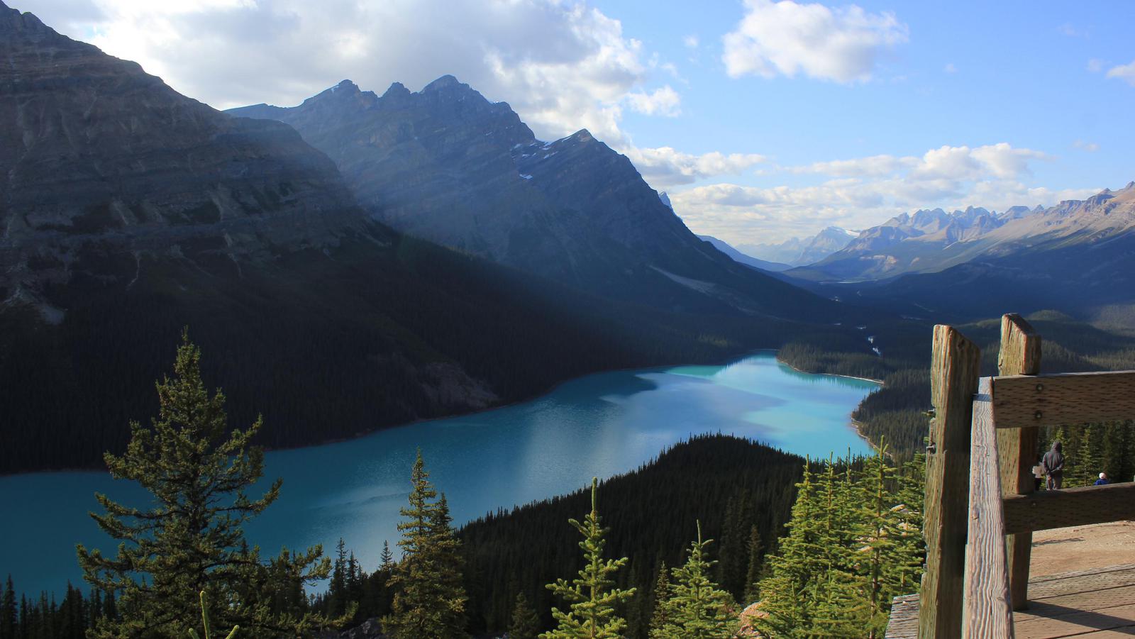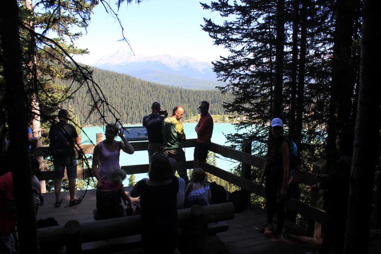 Nous parcourons quelques kilométres et arrivons au parking du belvédère du lac Peyto. Le sentier n'est pas très long, mais il est surtout très raide et difficile pour Isa. Les bus se succèdent et le petit point de vue en bois est bien vite saturé.