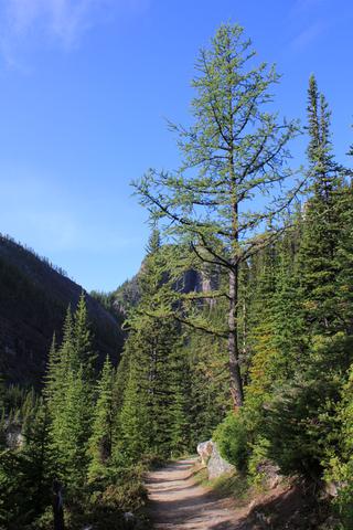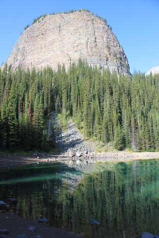 La montée est assez rude, régulière et sans lacet, à travers la forêt et sans aucune vue sur le lac. Nous atteignons le Lake Mirror au bout de quarante cinq minutes, celui-ci est encore totalement à l'ombre. Nous apercevons maintenant les sommets enneigés par dessus les pans de végétation où se mélangent mélèzes et pins douglas.
