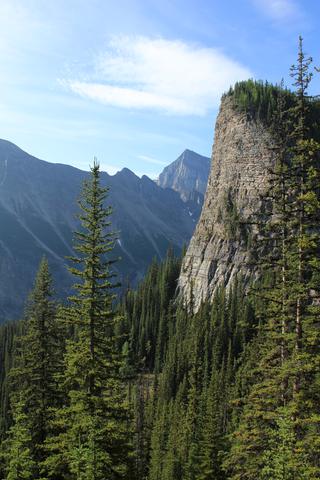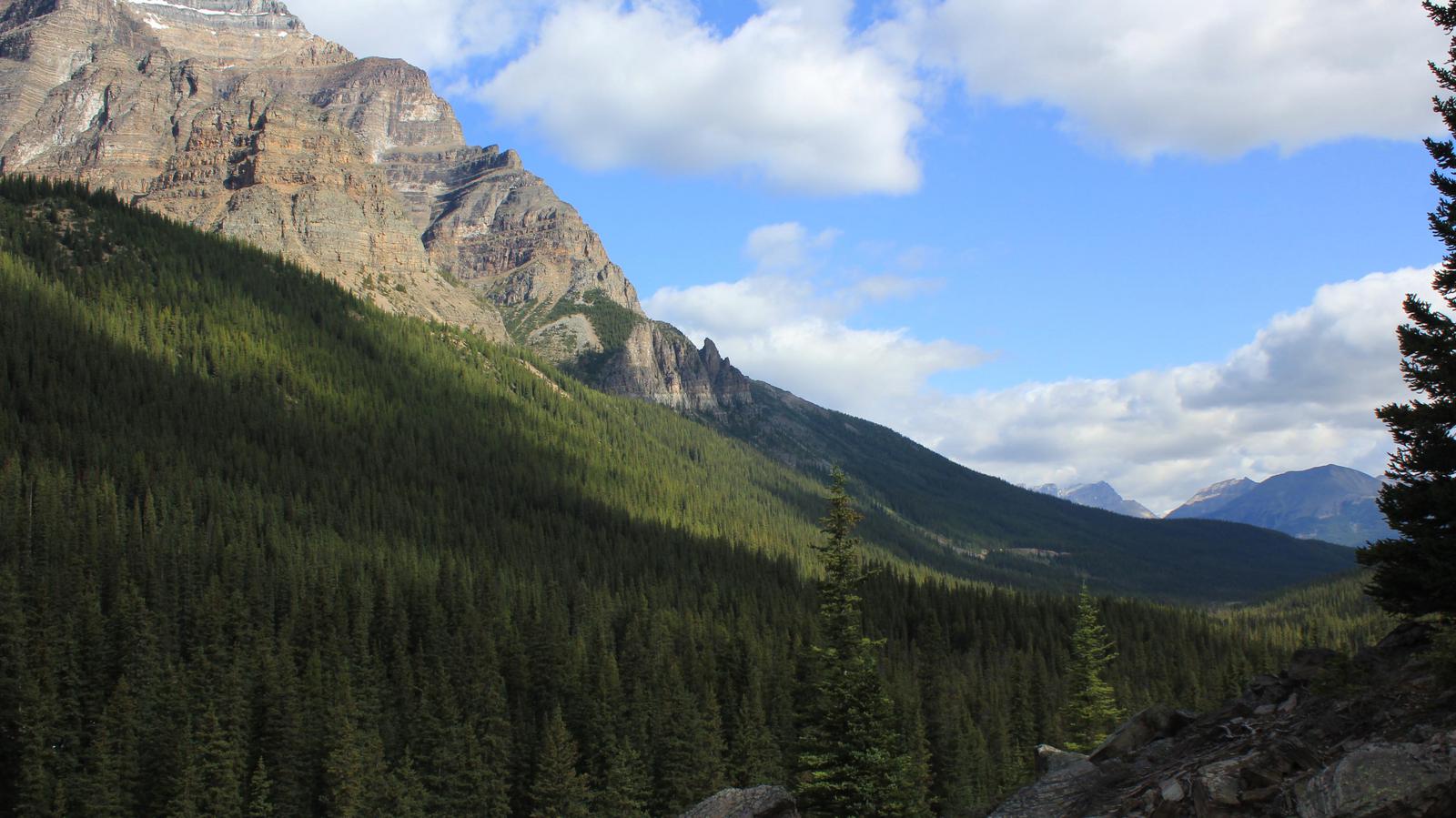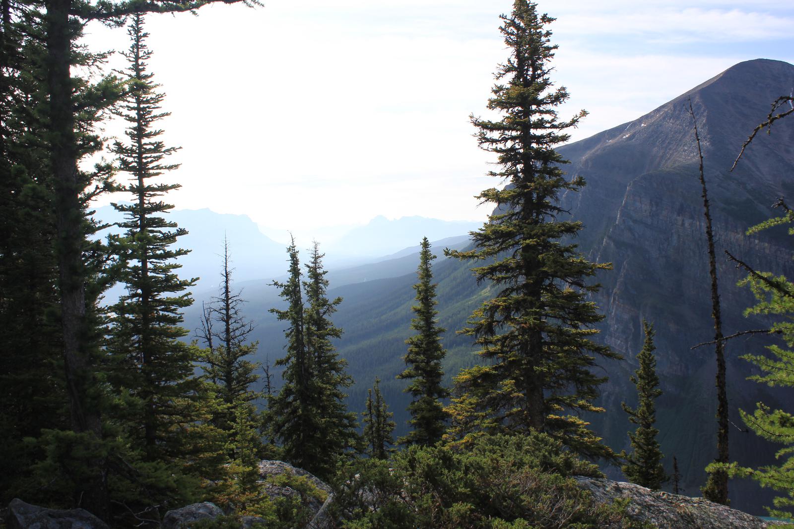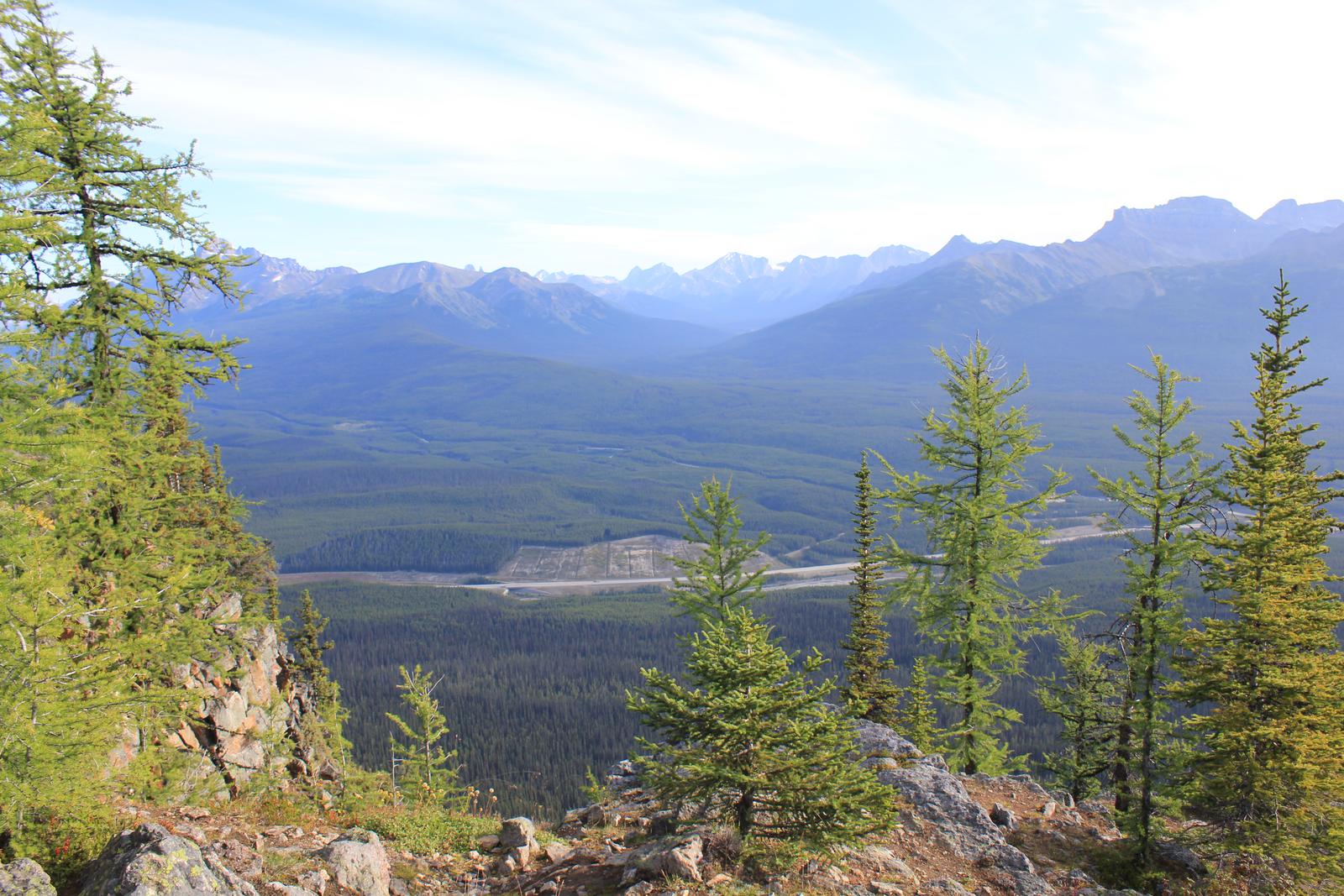Nous arrivons au sommet, nous découvrons une large vue sur la vallée de la Bow et le lac. Petite pause, avant d'entamer la descente. Isa reste prendre quelques photos tandis que je commence à descendre; Je la retrouvre quelques minutes plus tard, elle m'annonce qu'entre-temps elle a glissé et s'est tordue la cheville...