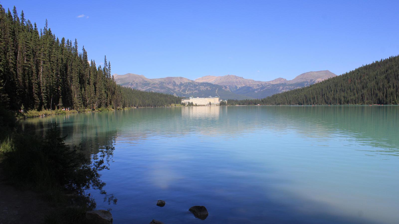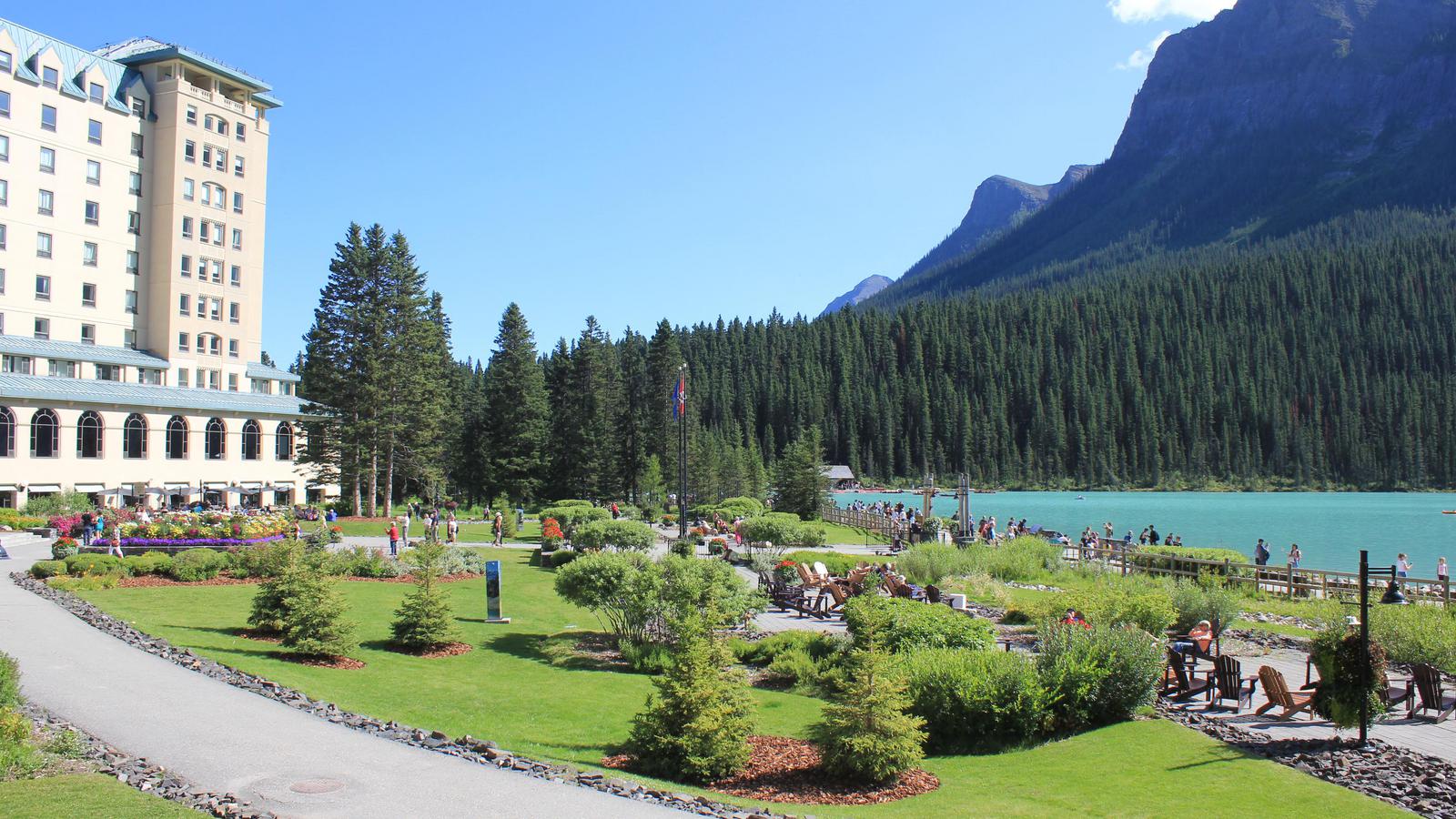 Les pensionnaires de l'énorme hôtel Château Fairmont Lake Louise ne sont pas encore réveillés que déjà les touristes ont envahi le front de lac, et attendent l'apparition du soleil... Nous commençons l'ascension.