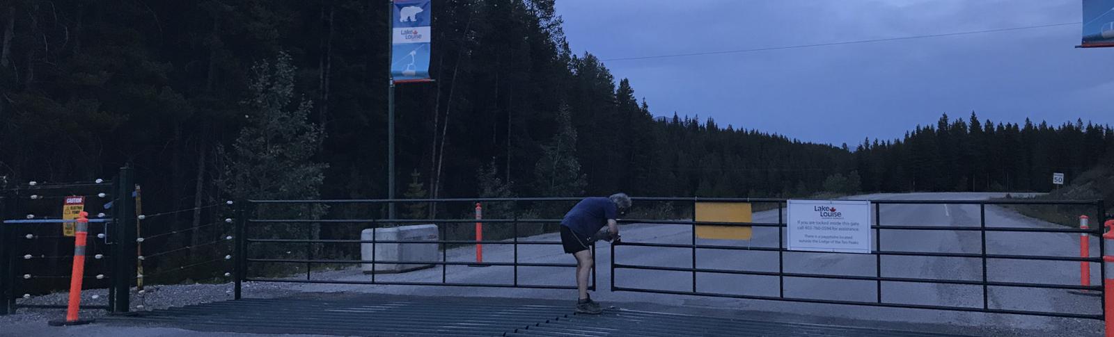 Nous revenons au parking des navettes du lac Louise, à la nuit tombante, par la route 1A. Nous roulons au pas, attentifs à la présence d'animaux. En vain.