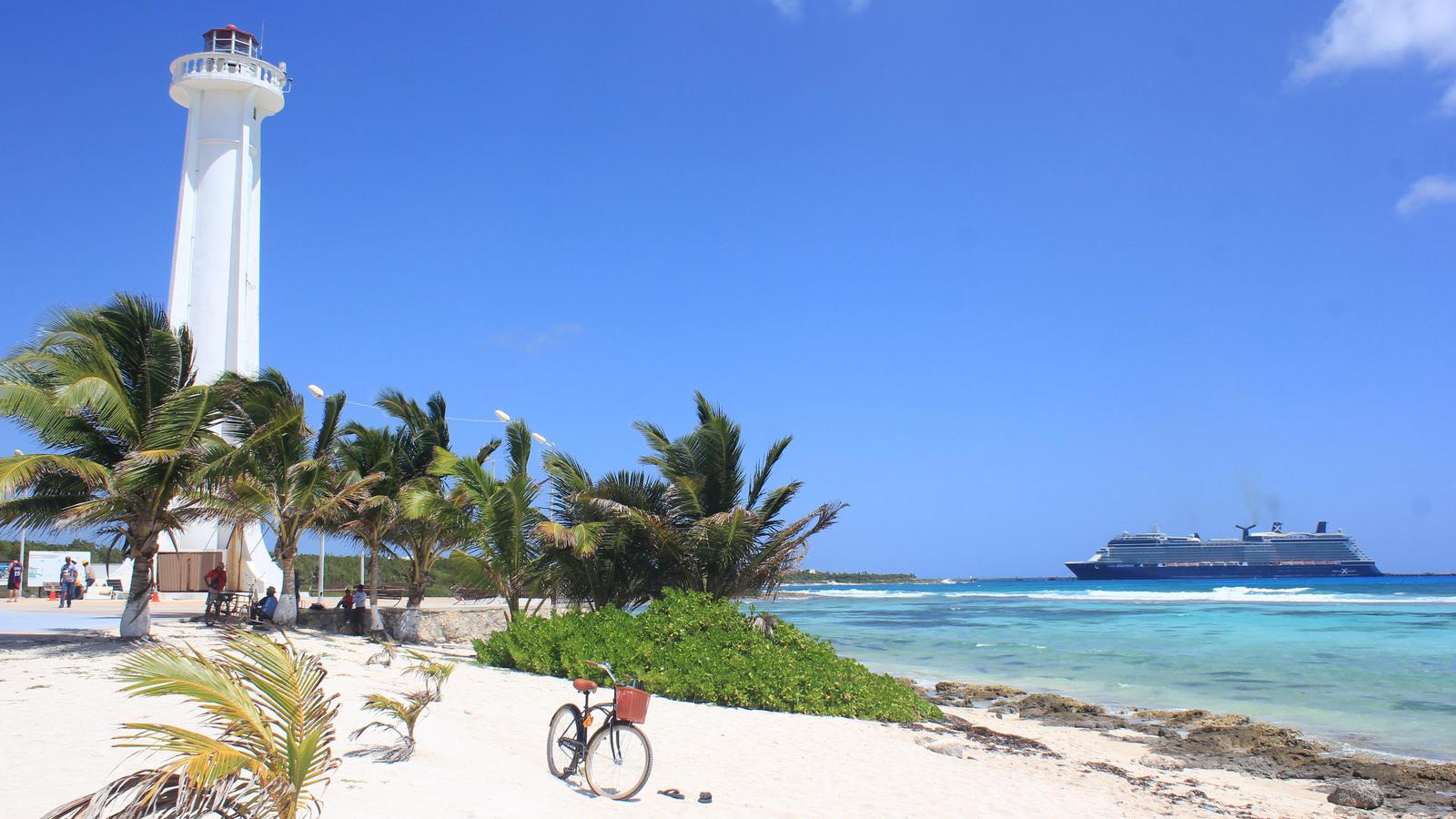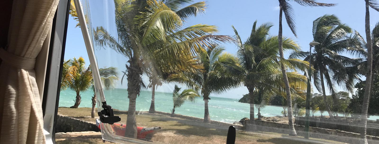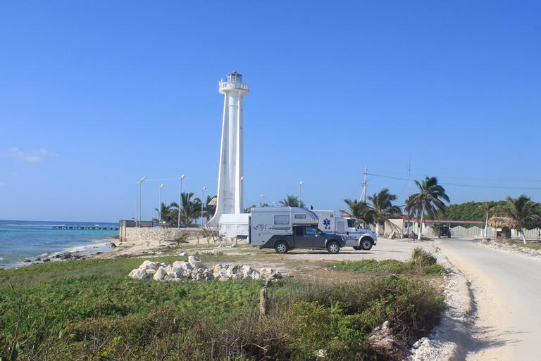 Nous arrivons à Mahahual, le phare se dresse juste devant nous à l'extrémité de la route. Le petit parking indiqué sur Ioverlander est bien au rendez-vous et un RV texan y est déjà installé face à la mer.