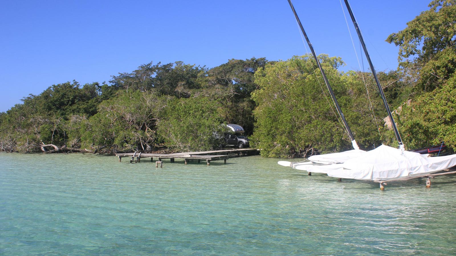 Aujourd'hui nous devons aller faire quelques courses, retirer des pesos pour régler le camping et remplir notre réservoir d'eau dans un centre d'eau purifiée. Nous suivons le bord de mer jusqu'au terminal maritime. C'est une réserve biosphère des lamentins, mais l'eau est si trouble qu'il serait surprenant de voir un animal ici...