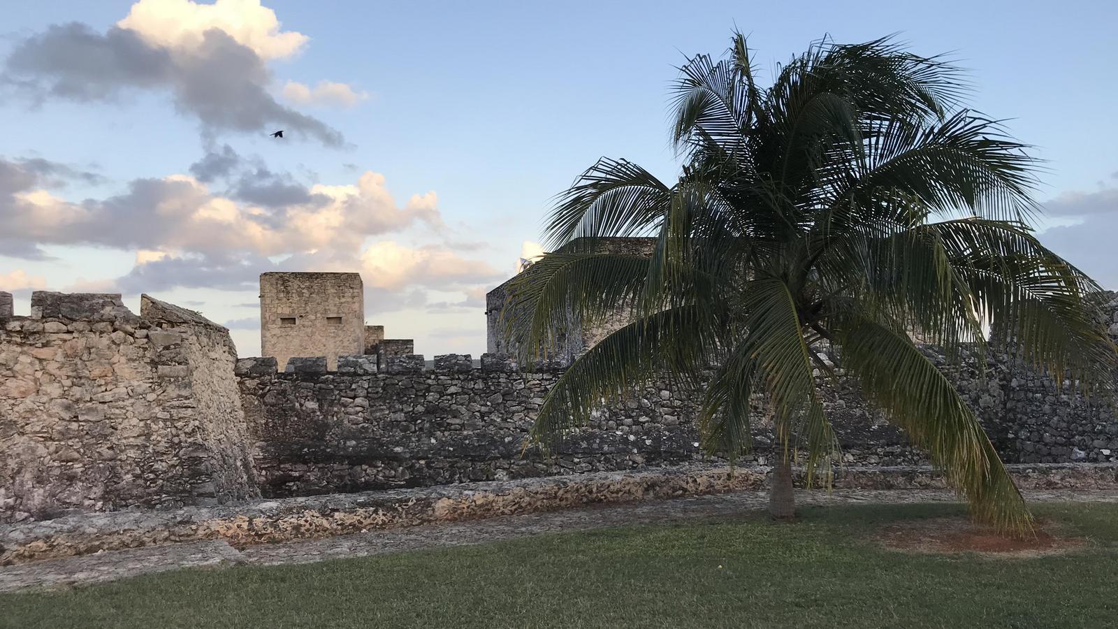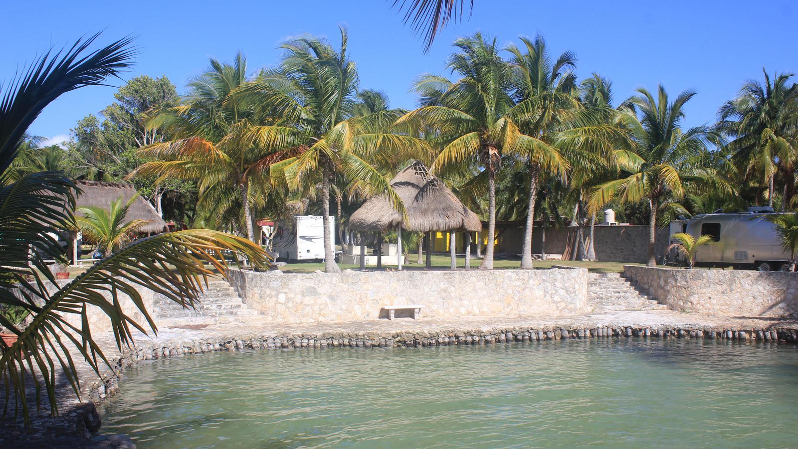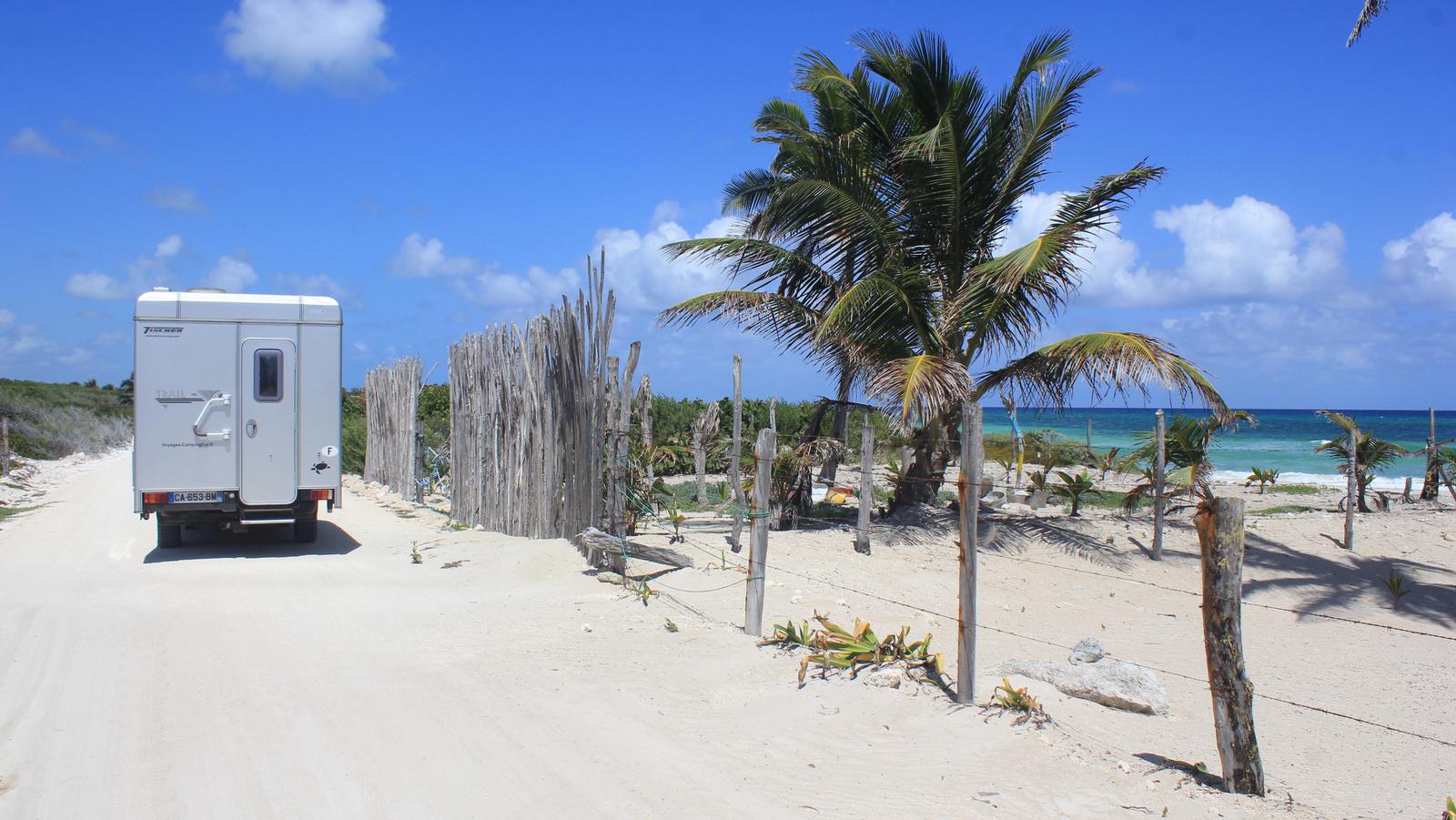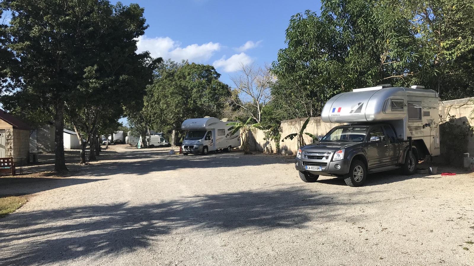 Celui-ci est magnifique, la mer sur deux côtés et de hauts murs en pierres sur les deux autres. Nous sommes une demi-douzaine de véhicules de voyageurs, la plupart en route pour le Belize qui vient de fermer ses portes comme presque tous les autres pays d'Amérique centrale.