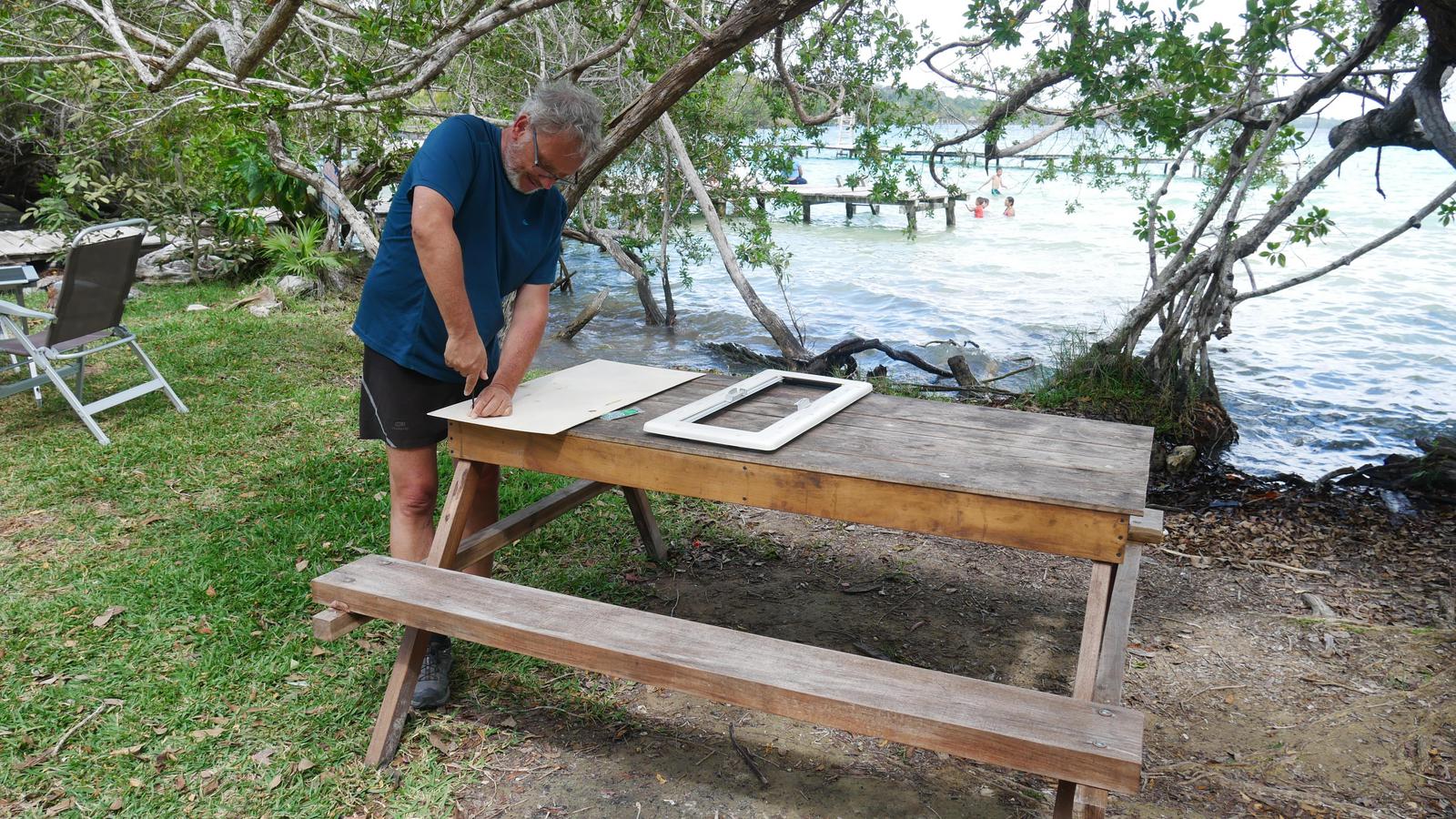 Les autres campeurs se mettent en route, nous, nous décidons de passer une seconde nuit et restons seuls sur le petit camping. Nous consacrons notre après-midi à une activité bricolage, nous démontons les fenêtres et ajustons les panneaux achetés la veille. Tous les récits que nous lisons évoquent des vols avec dégradations dans les ports d'Amérique du sud, les baies sont les points faibles de notre cellule et il est indispensable d'y remédier autant que faire se peut... Il fait chaud mais nous travaillons à l'ombre avec un petit vent, c'est très agréable de bricoler dans ces conditions !
