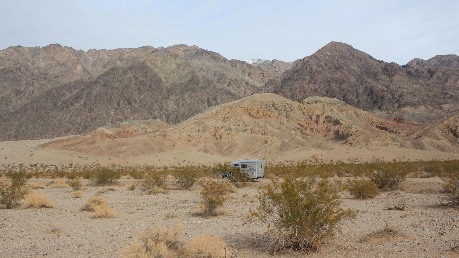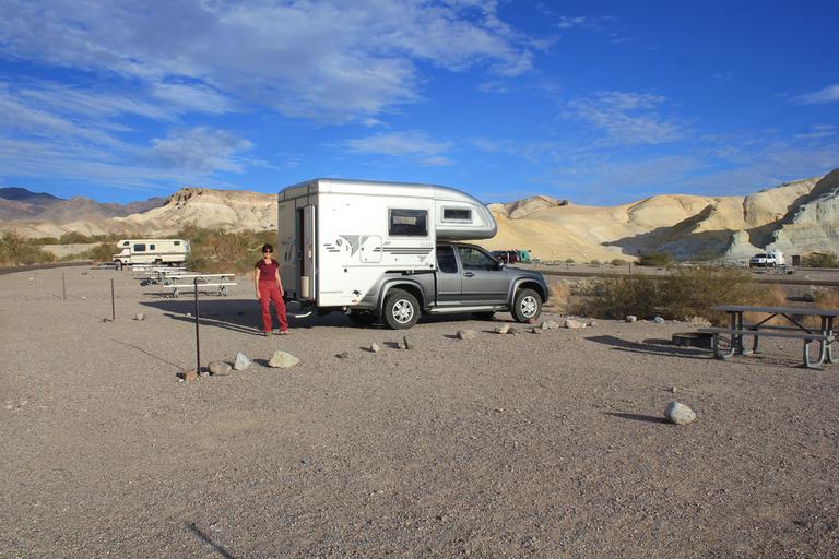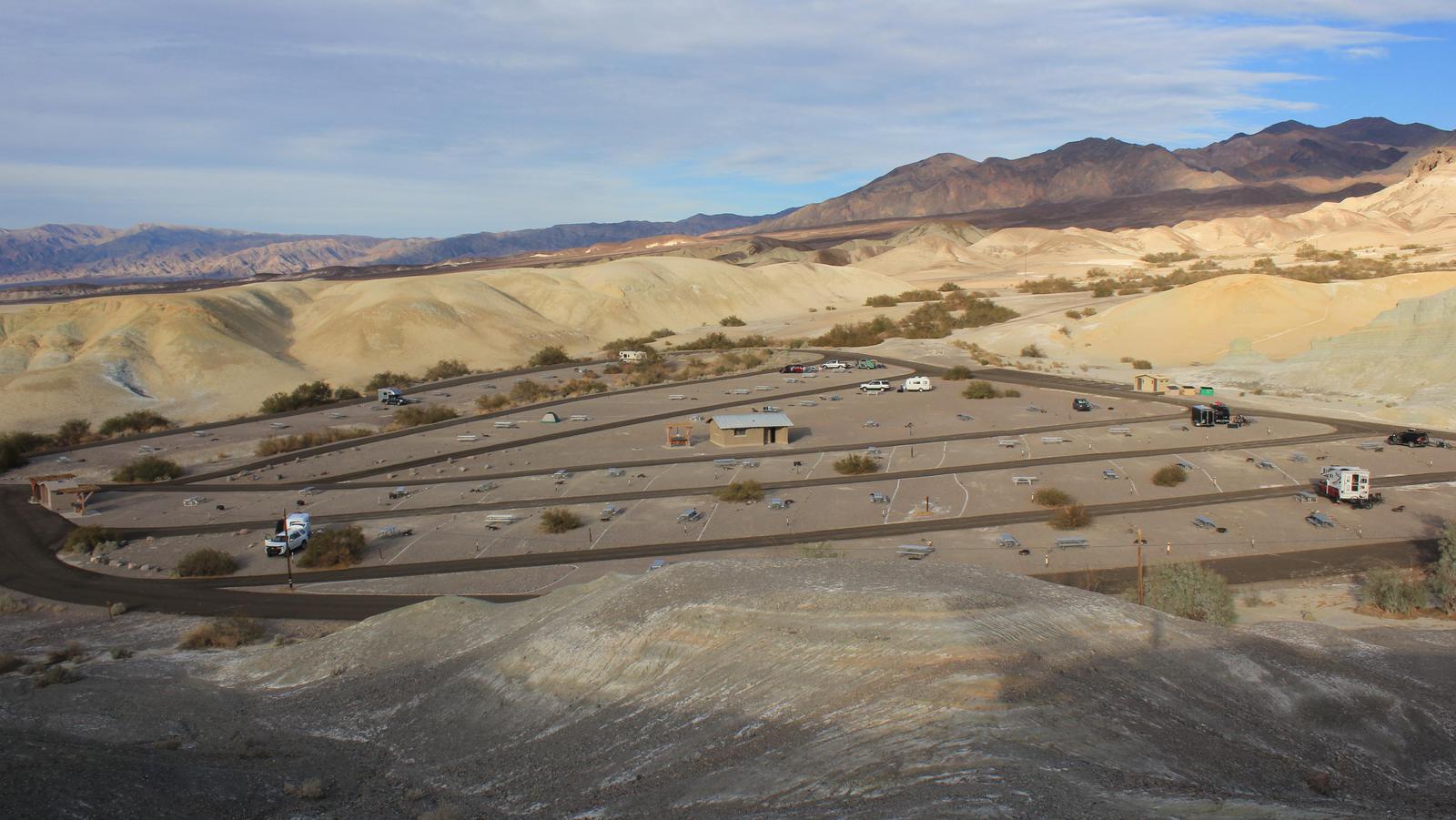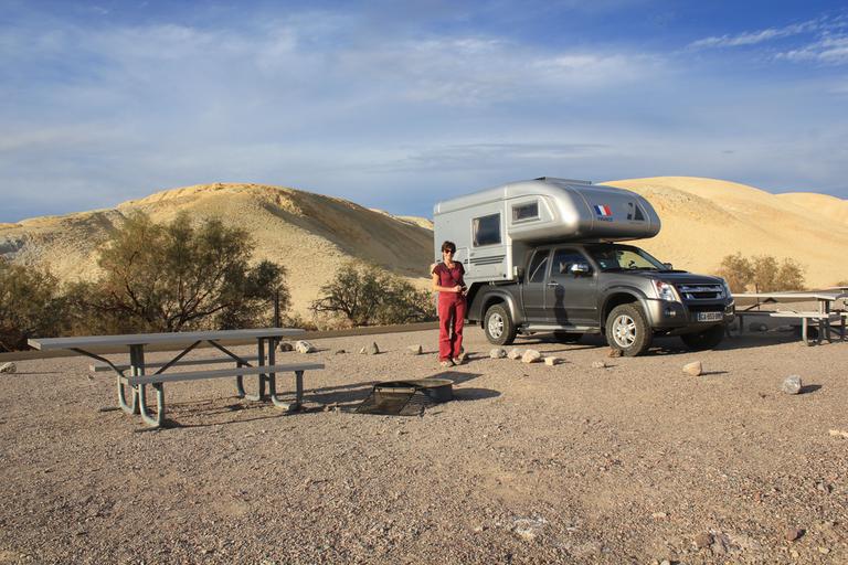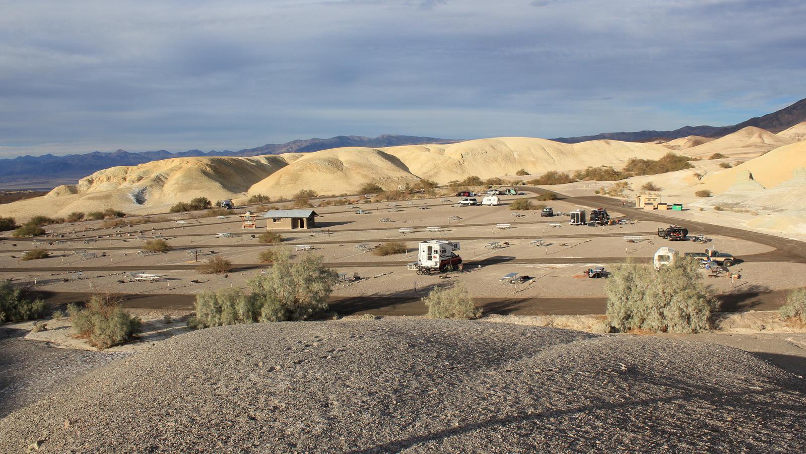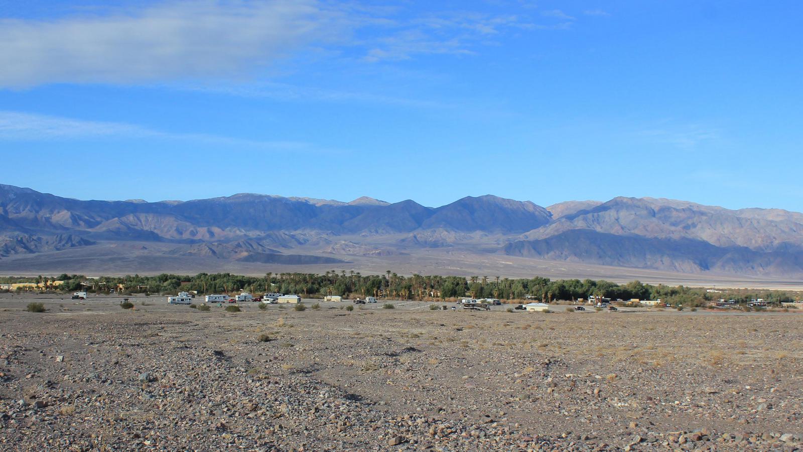 Il ne fait pas très beau, nous préférons ne pas nous arrêter aux différents points d'intérêts et rejoindre directement un des campings de Furnace Creek. Une fois sur place, nous optons pour le camping Texas Springs, sans branchement mais présentant l'énorme avantage de dominer toute la vallée et surtout de ne pas accepter l'utilisation des groupes électrogènes...