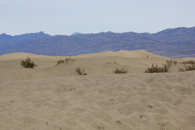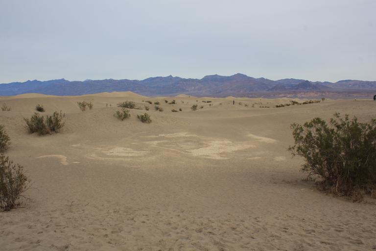 Nous faisons une halte à Mesquite Flat Sand Dunes. A cet endroit précisement, l'action du vent a formé d'énormes dunes de sable. Il fait gris et frais, nous avons déjà vu des dunes..,