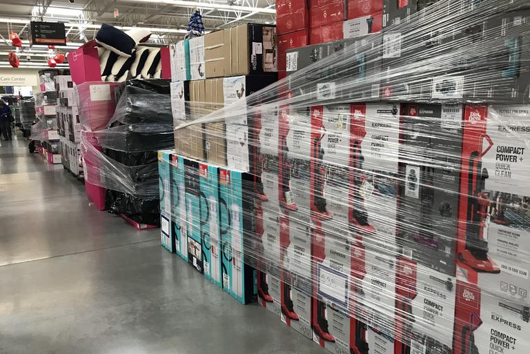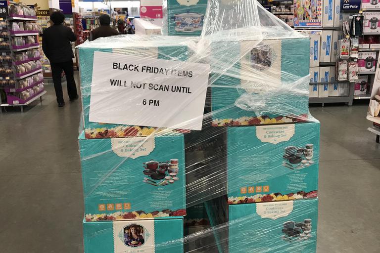 Il y a beaucoup de voitures sur le parking pour un jour de fête. Nous entrons, toutes les allées du magasin sont occupées par les palettes filmées des produits qui seront mis en promotion à partir de 18h00. Les clients n'achètent rien, mais vont et viennent dans les rayons, liste en mains, pour repérer les bonnes affaires avant le rush attendu...