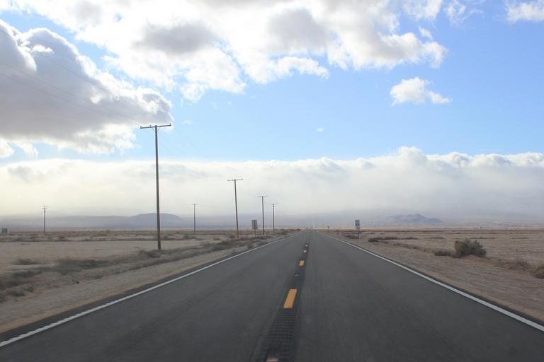 L'entrée du Joshua Tree NP est toute proche, cependant nous bifurquons sur la route 62 en direction de la vallée de Coachella. Nous passons rapidement de 1000m à quelques mètres au dessus du niveau de la mer, la route à 2x2 voies est splendide. Nous avons retrouvé quelques degrés mais le ciel est toujours aussi menaçant.