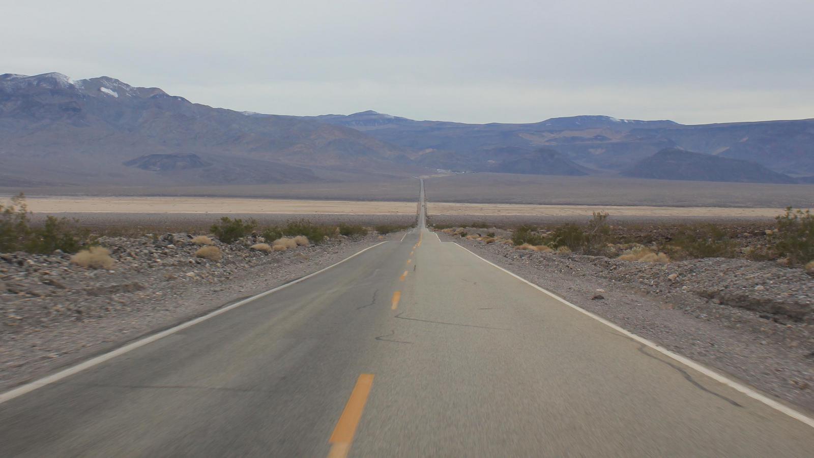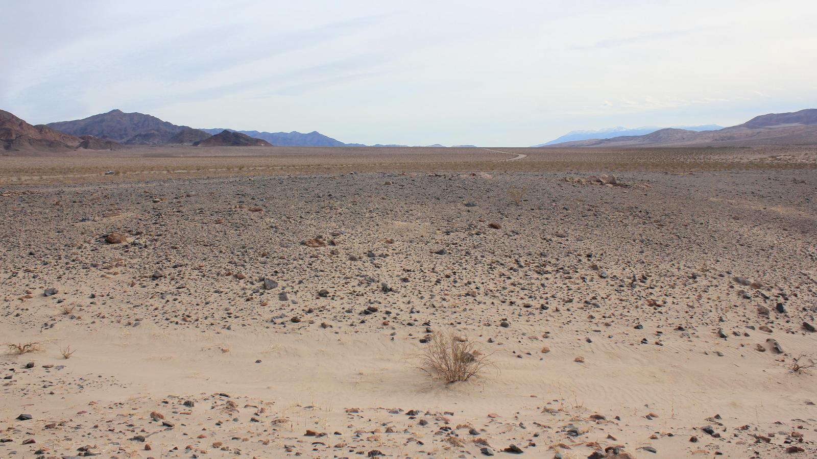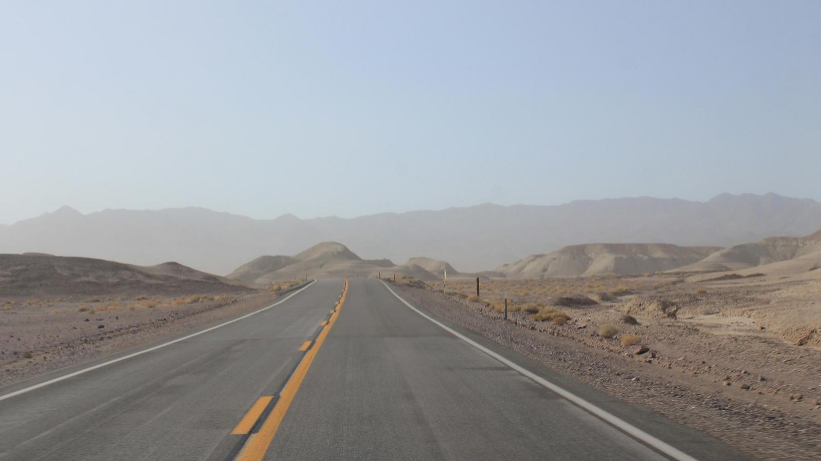 Nous quittons Las Vegas par la route 178. Nous passons Pahrump, puis poursuivons en direction de Shoshone, l'entrée sud de la Death Valley. Nous entrons en Californie, le paysage devient lunaire et semble vouloir disparaître peu à peu derrière la brume.