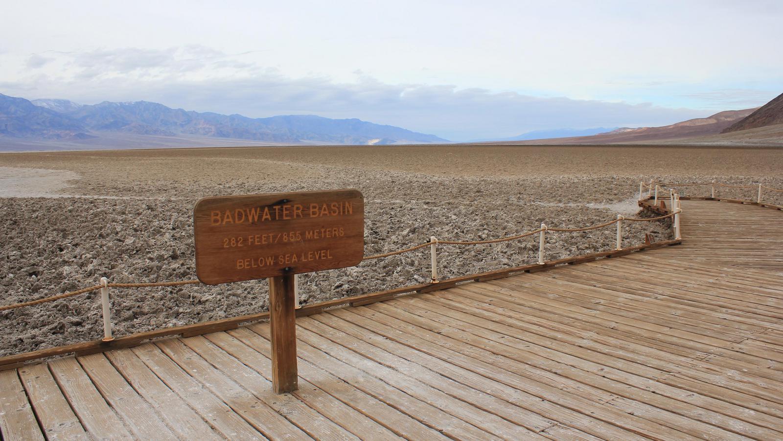 Nous longeons maintenant une large étendue asséchée. Nous arrivons à Badwater, le point le plus bas de la vallée, nous sommes à -85,5m en dessous du niveau de la mer.