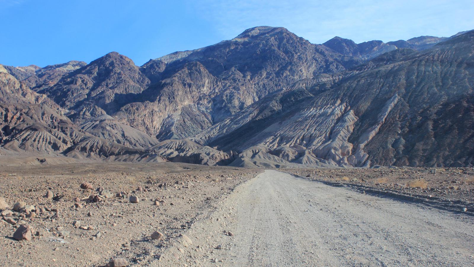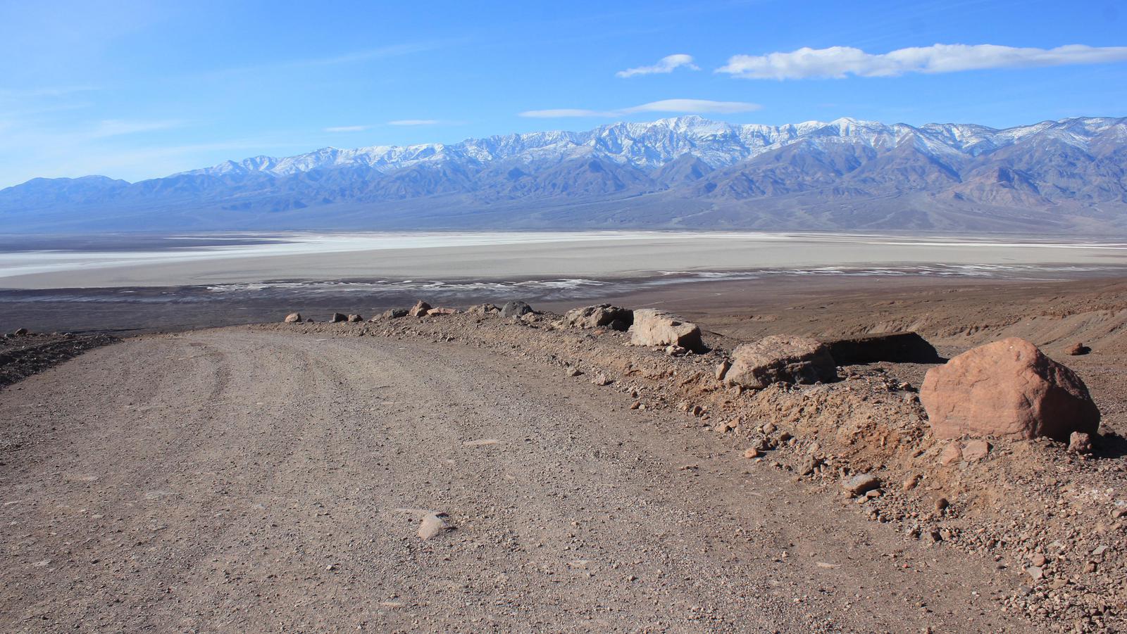 Nous prenons ensuite la piste qui mène à Mosaïc Canyon. Celle-ci est totalement défoncée, au bout des 4km et rien qu'à la pensée du retour, l'envie de visiter un canyon dans ces conditions s'est envolée... Nous reprenons la route.