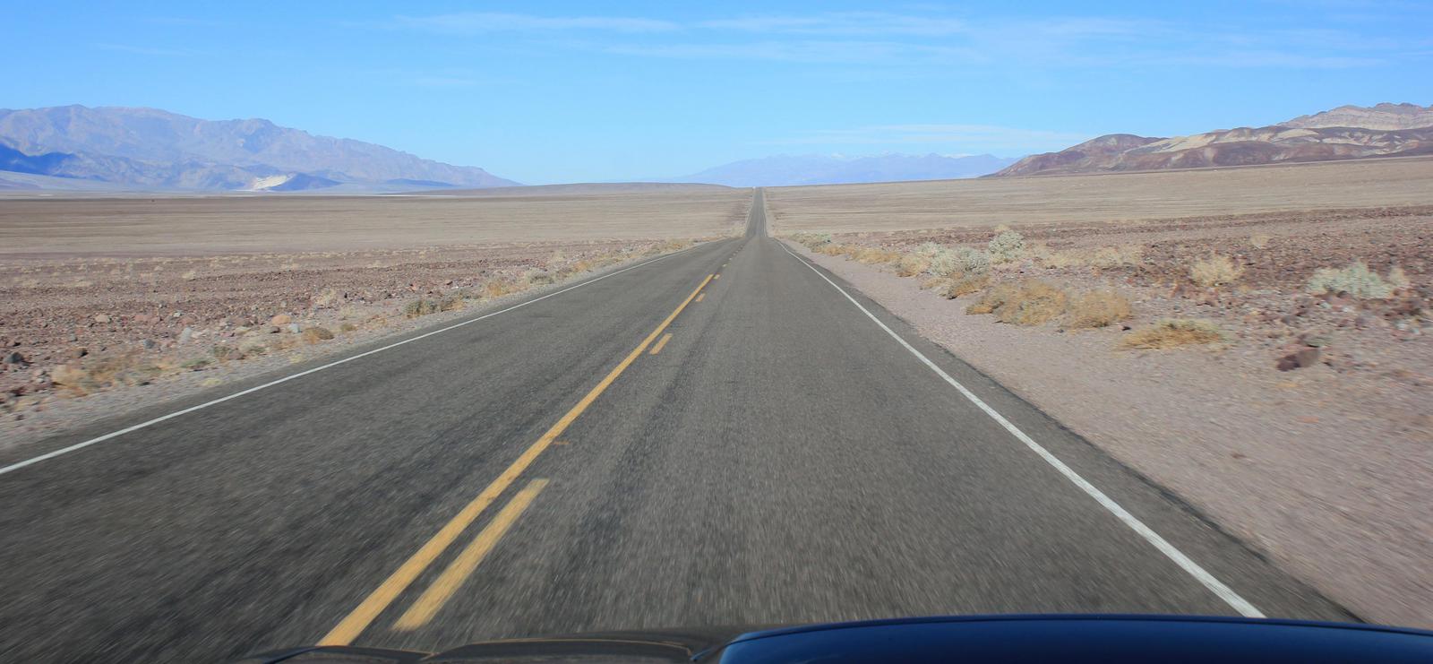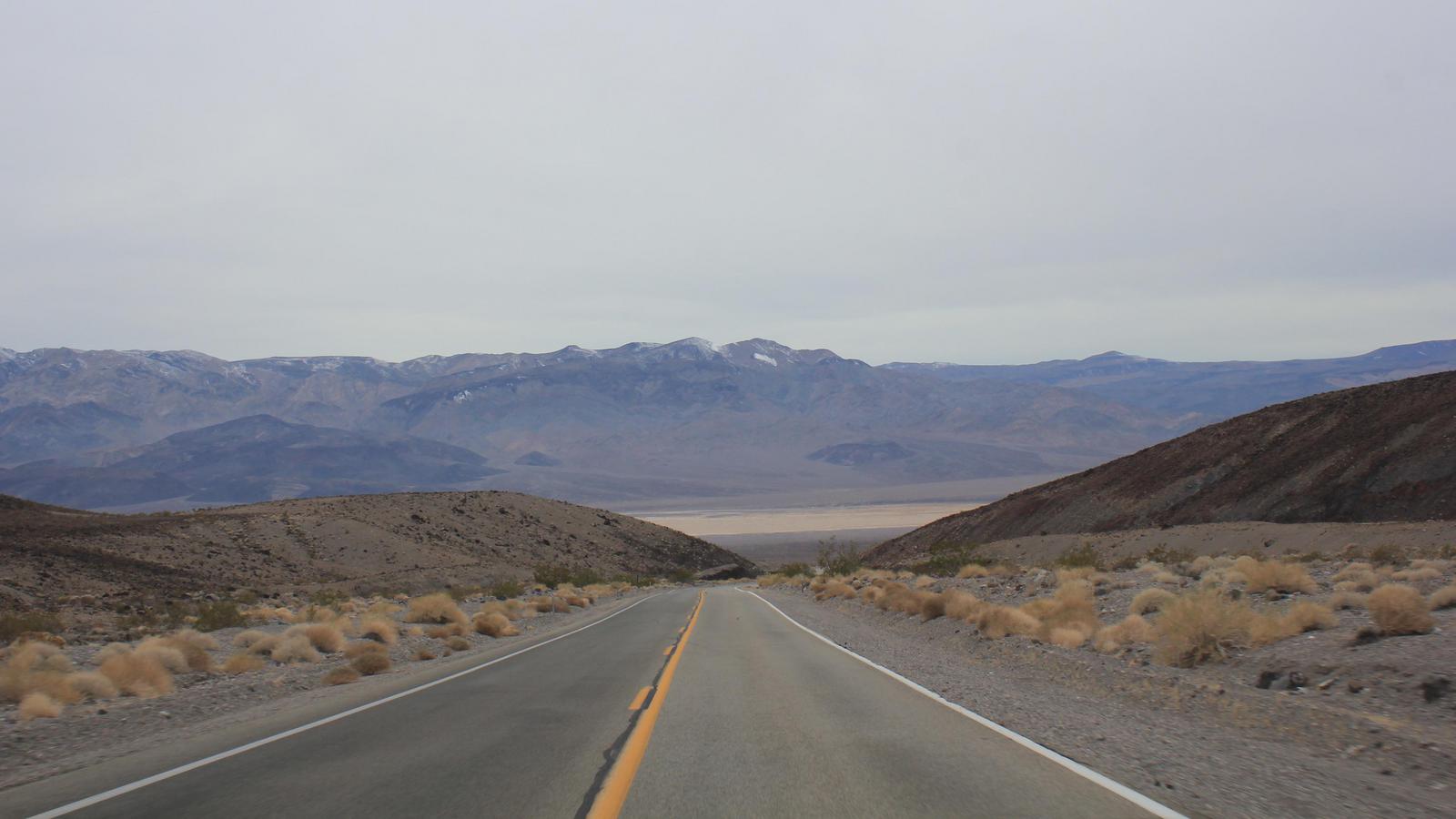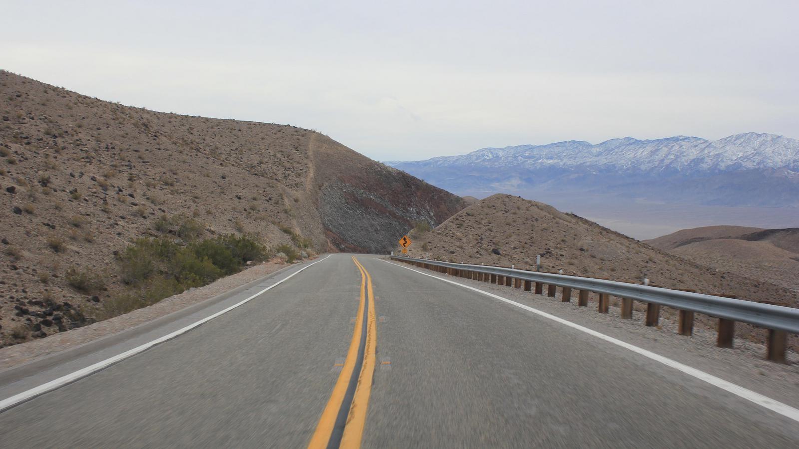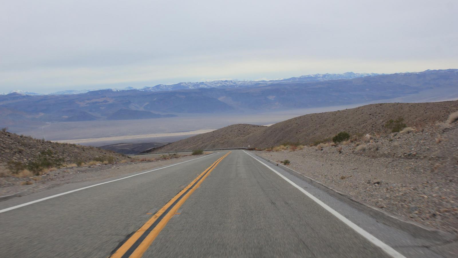 La route s'élève, en bord de route de grands panneaux demandent aux automobilistes de couper la climatisation pour éviter la surchauffe des moteurs. Nous passons le col, Towne Pass, à 1 511m puis entamons la longue descente vers Trona.