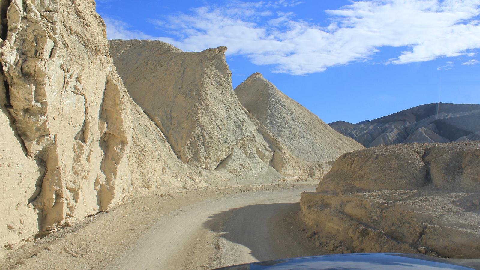 Nous partons dans cette direction. Le vent est de plus en plus fort, par moment nous dinstinguons à peine la route. Nous arrivons à China Ranch, la route goudronnée s'arrête, puis la piste en terre qui lui succède descend soudain brusquement entre deux parois rocheuses... Je ne veux plus continuer, nous remontons sur la route goudronnée et faisons le point.