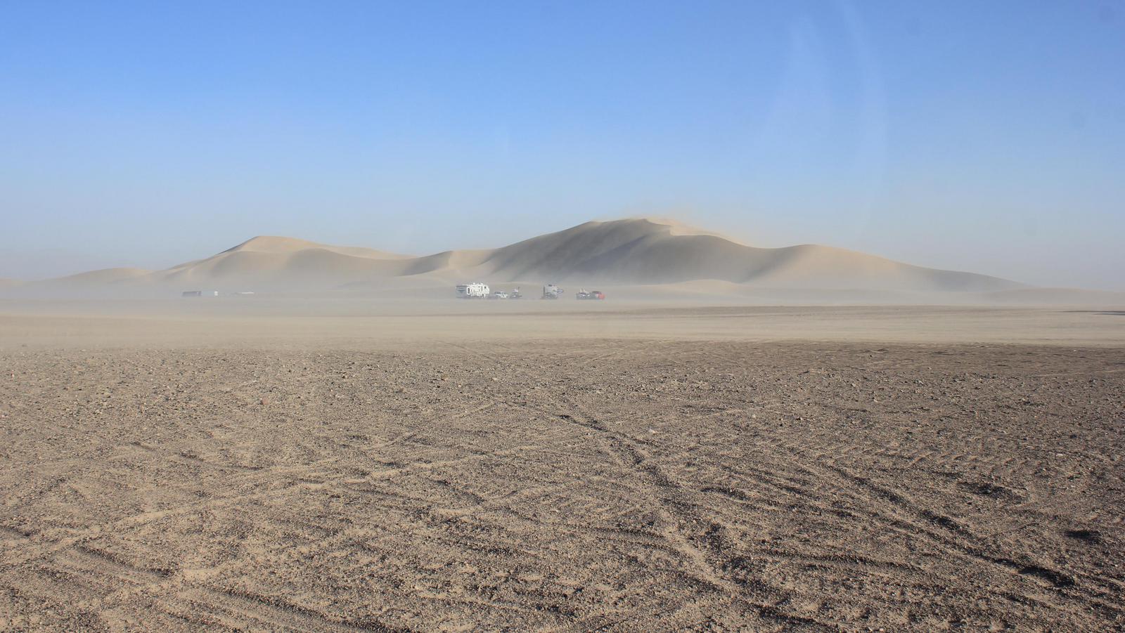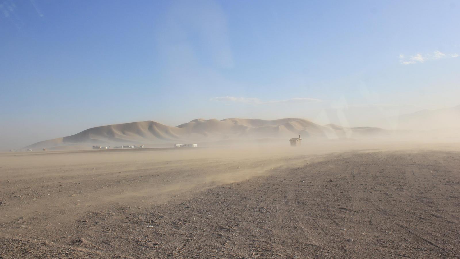 A observer de plus près, ce n'est pas de la brume, mais un nuage de poussière soulevé par vent.