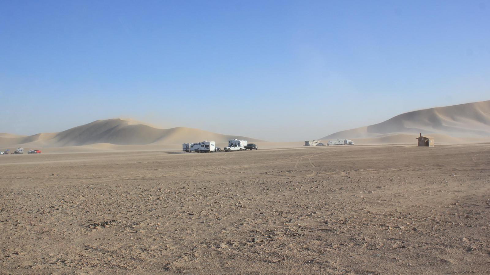 Nous arrivons à hauteur de Dumont Dunes. Ces magnifiques dunes de sable sont une Recreation Area où il est possible de camper et de pratiquer du tout-terrain. A l'approche du pont de Thanksgiving, de nombreux américains sont venus s'installer ici avec leur trailer et leur ATV. Nous sommes en pleine tempête de sable, impossible de baisser ma vitre pour prendre une photo...