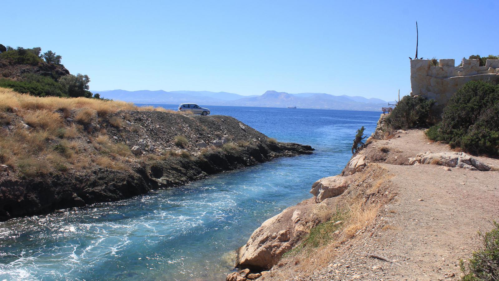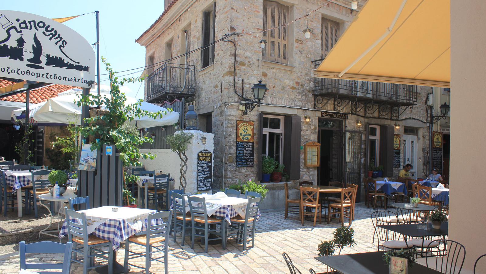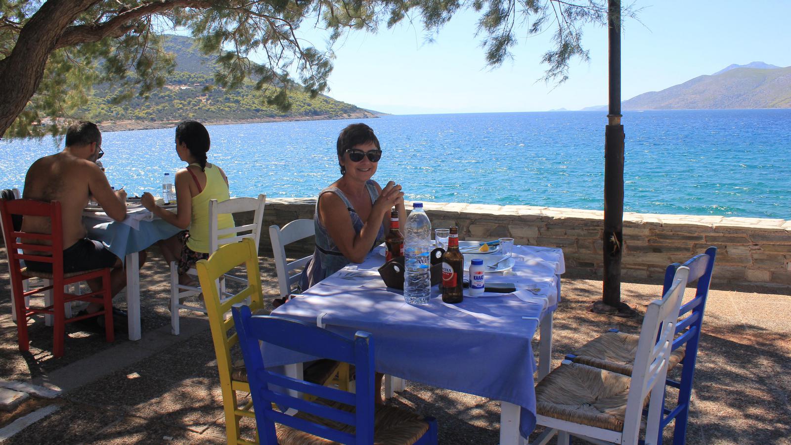 Nous tentons de nous garer en vain près du port. Il y a foule et tous les stationnements sont complets. Nous trouvons enfin celui d'une taverne en bord de mer, à la sortie de la ville en direction de Psatha. Nous nous y arrêtons et déjeunons.