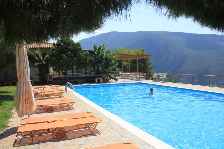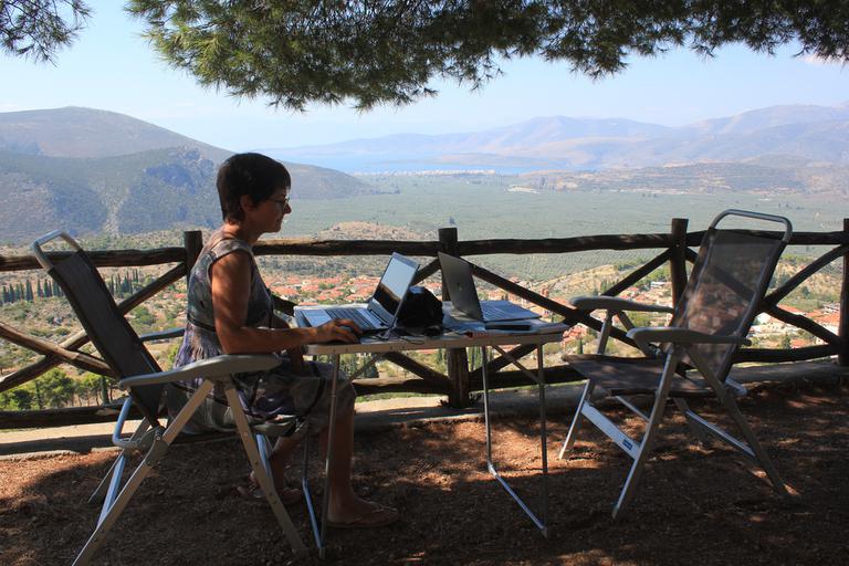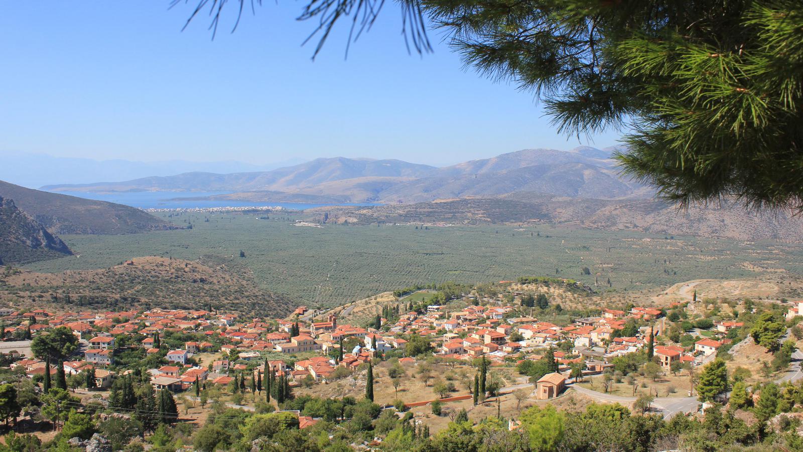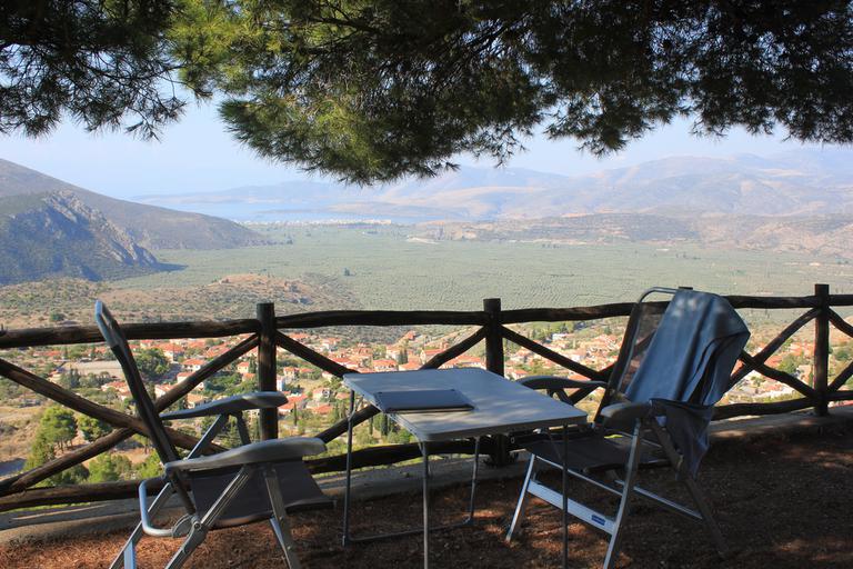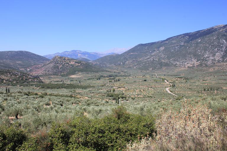 Nous sommes installés au-dessus de la mer des oliviers de Delphes. Cette oliveraie est agée de 3000 ans, c'est la plus ancienne de Grèce et l'une des plus anciennes du monde.