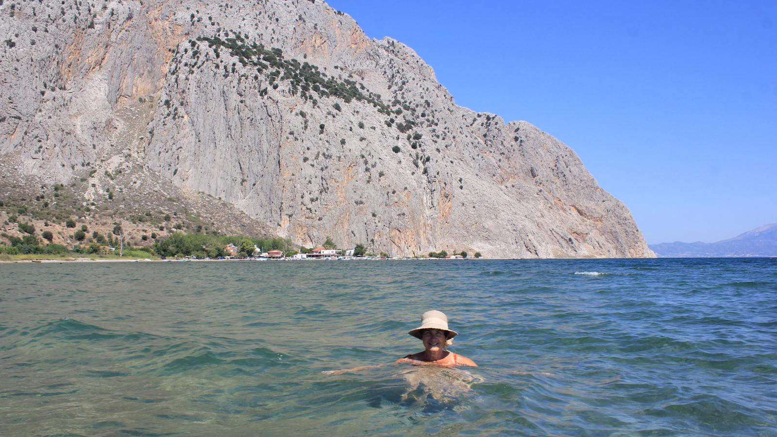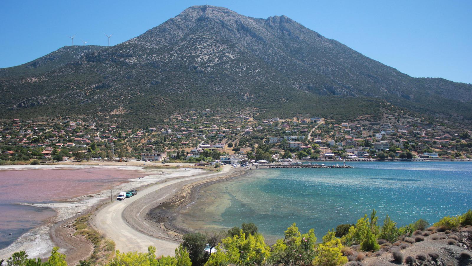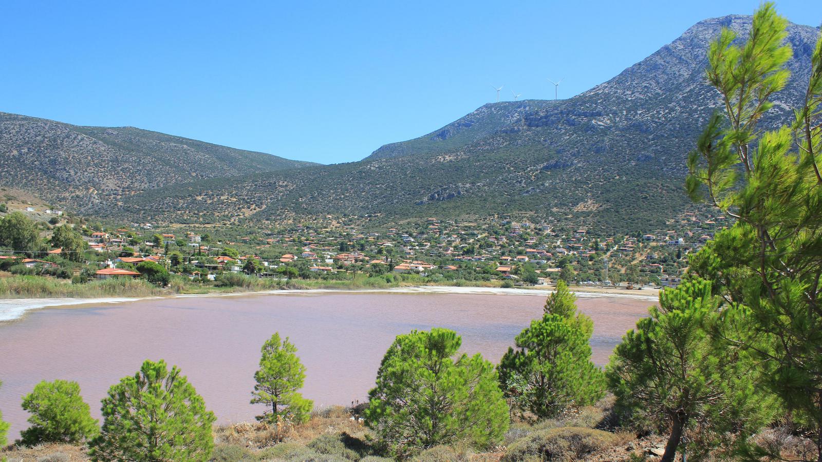 Nous quittons une nouvelle fois un bivouac unique et poursuivons notre route vers Corinthe. Nous faisons une halte à Aliki, le village suivant sur la côte. Celui-ci est assez important et nous retrouvons une petite animation de station balnéaire. Un cordon de terre sépare la mer d'une saline rose naturelle. Dans un premier temps, nous pensons à quelques bouées, mais ce sont bien les casquettes colorées d'une dizaine de personnes agées que nous apercevons allongée dans cette eau peu attirante...