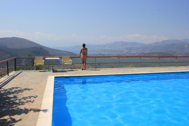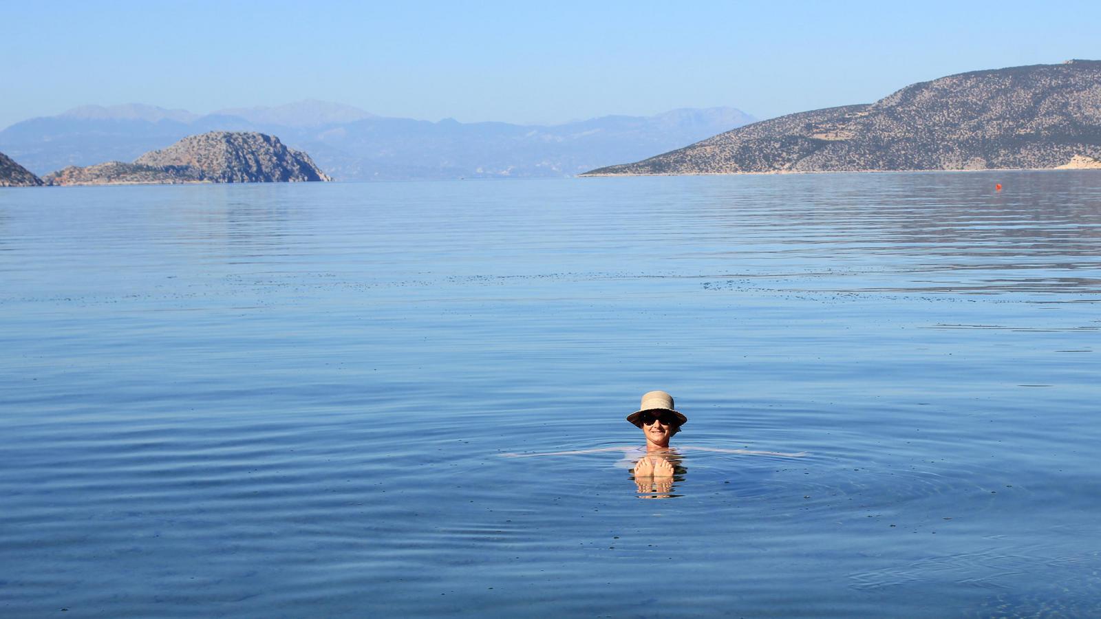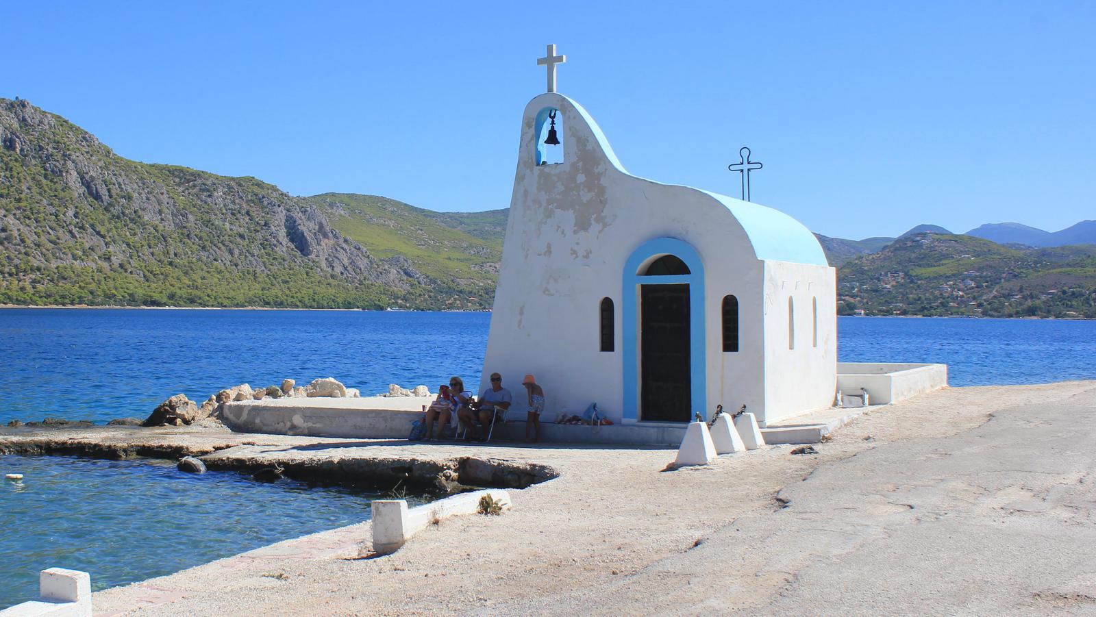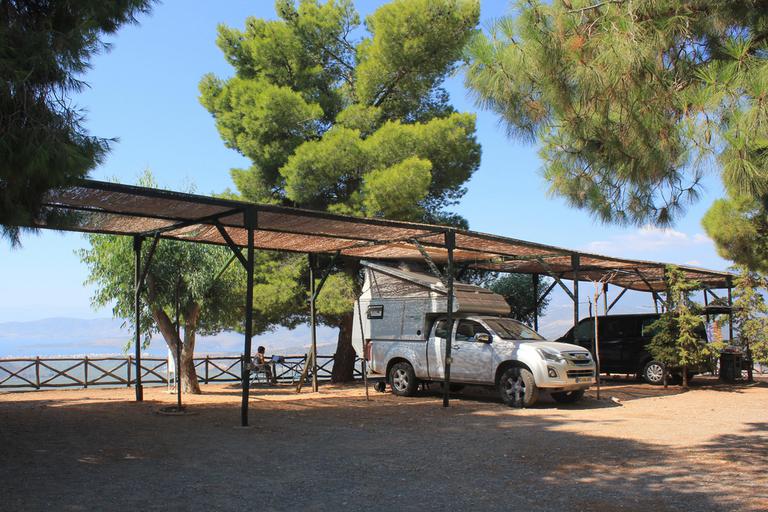 Nous quittons une nouvelle fois un bivouac unique et poursuivons notre route vers Corinthe. Nous faisons une halte à Aliki, le village suivant sur la côte. Celui-ci est assez important et nous retrouvons une petite animation de station balnéaire. Un cordon de terre sépare la mer d'une saline rose naturelle. Dans un premier temps, nous pensons à quelques bouées, mais ce sont bien les casquettes colorées d'une dizaine de personnes agées que nous apercevons allongée dans cette eau peu attirante...
