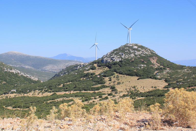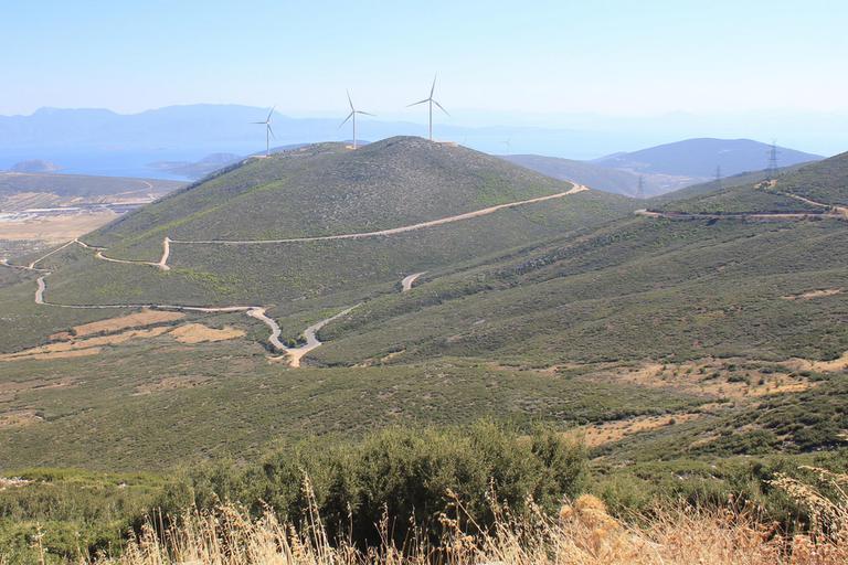 Au bout de 70km de lacets de montagne, nous apercevons soudain, comme une récompense, le bleu de la mer. Des éoliennes ont été installées sur chaque sommet et le paysage se trouve marqué des impressionnants travaux routiers pour acheminer les différents éléments.