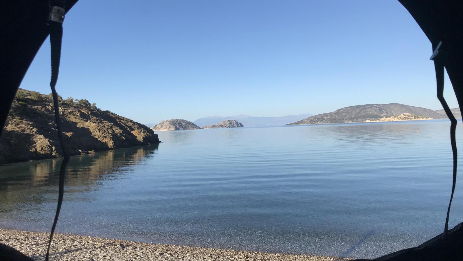 Nuit paisible et panorama unique au réveil par notre grande ouverture de toit. Il n'y a pas de vent, la mer est d'huile et l'eau limpide. Nous déjeunons et allons nous baigner.