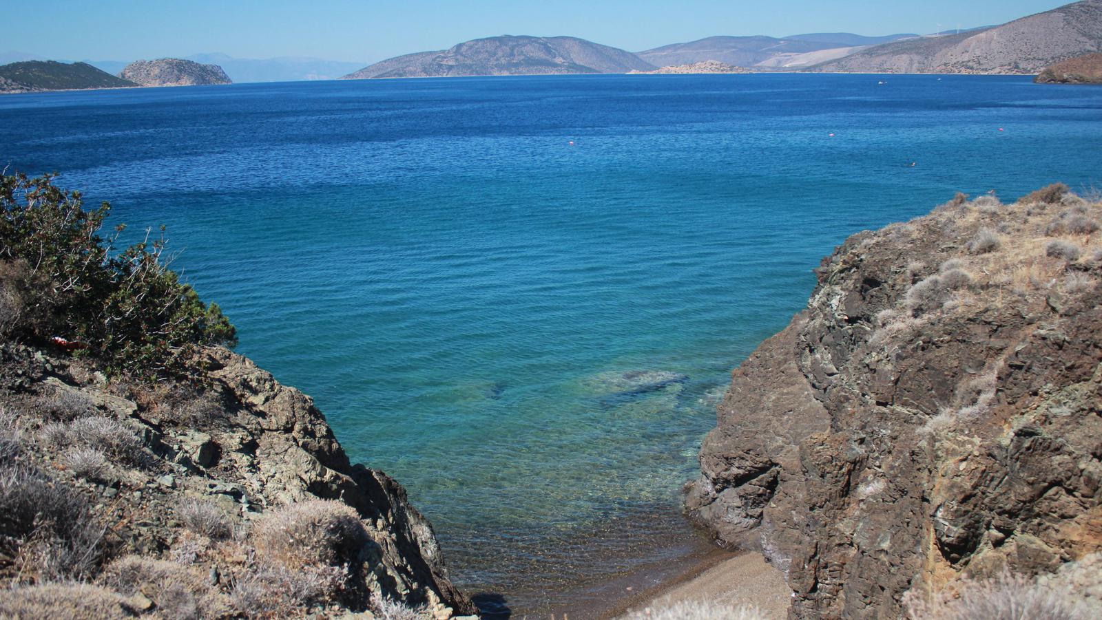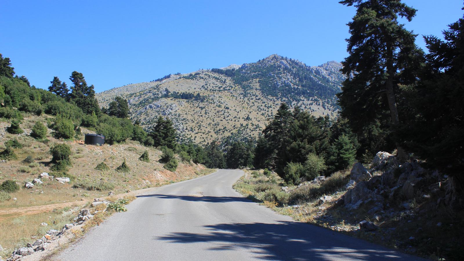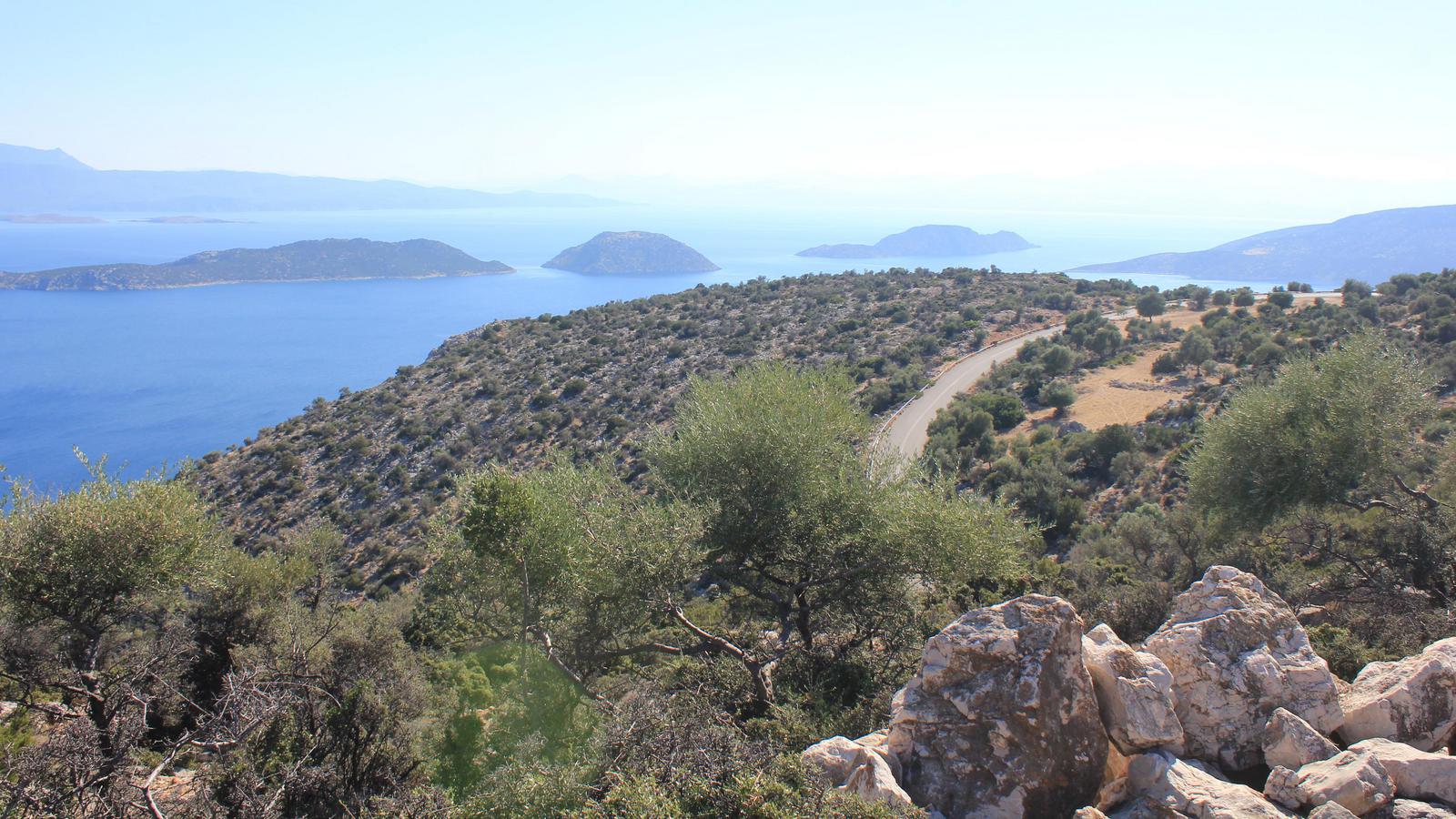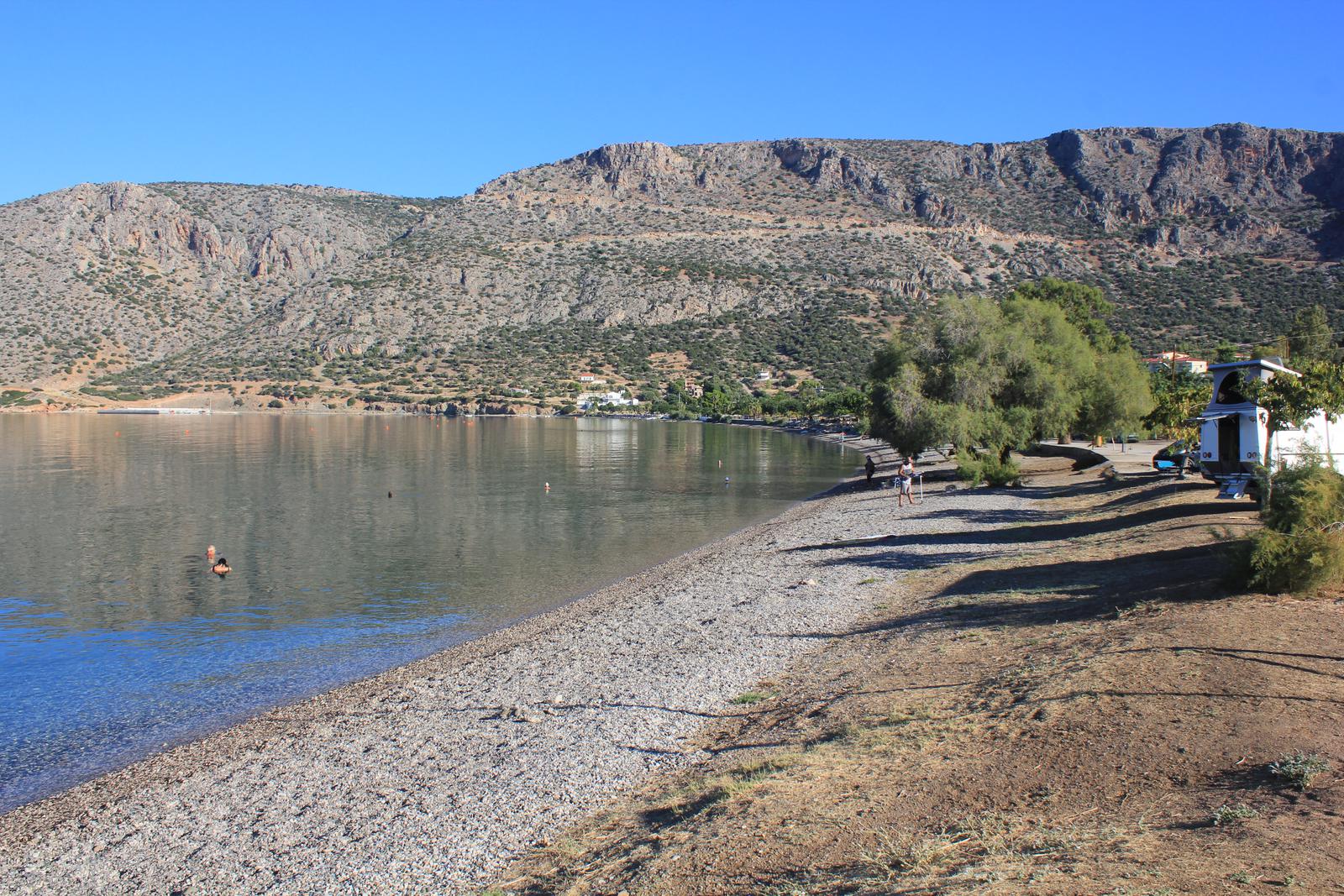 Notre route plonge maintenant vers la mer, nous apercevons la belle plage d'Agios Nikolaos juste en dessous de nous.