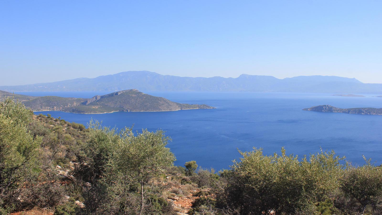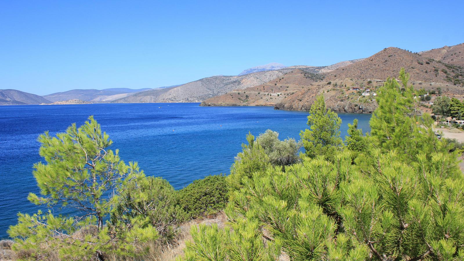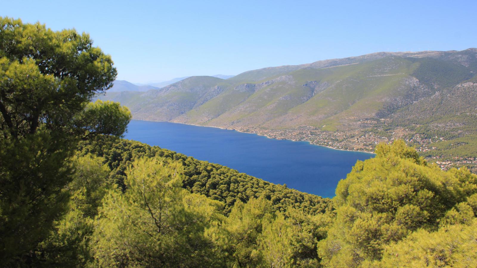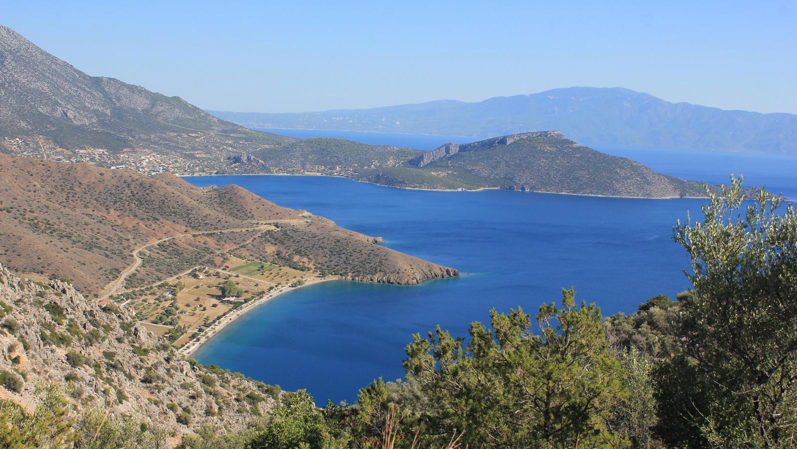 Nous laissons la côte pour une grande virée de près de deux heures à l'intérieur des terres. Nous retrouvons la mer en prenant l'option de rejoindre Porto Germeno. La descente sur la baie au milieu des pins est superbe.