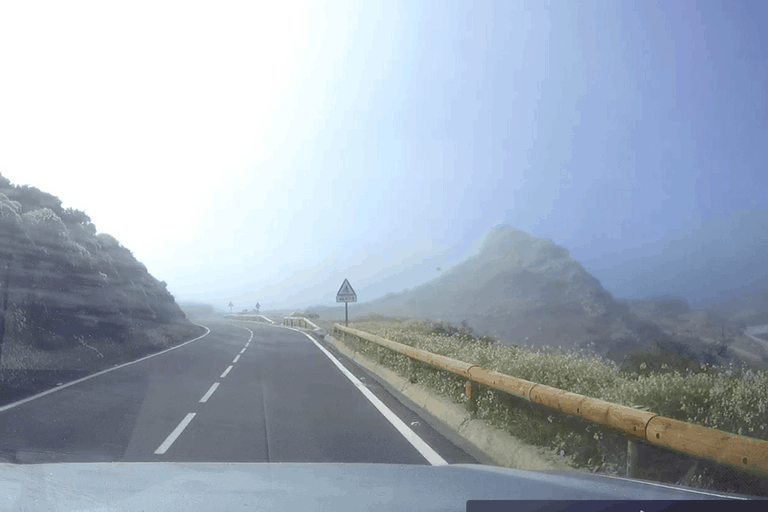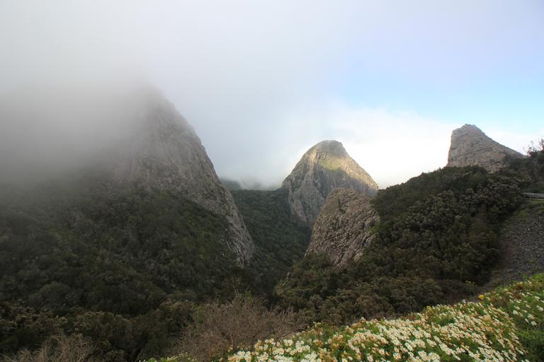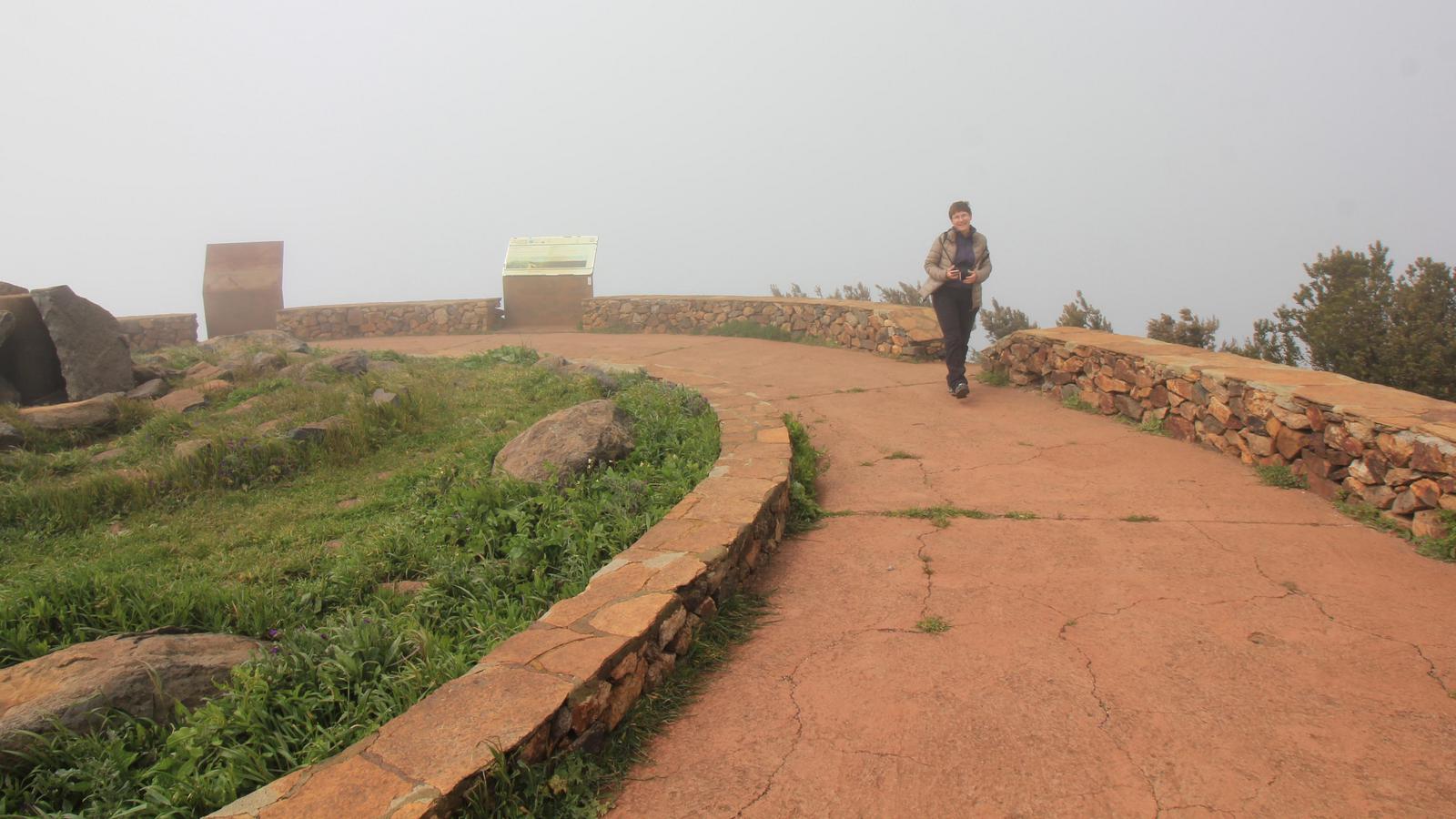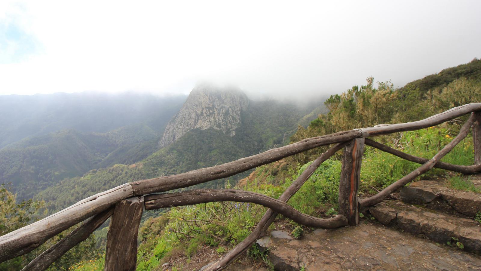 Nous revenons au mirador de Los Roques et à celui de Tajaqué, cette fois le ciel est presque totalement dégagé et nous apercevons le Teide sur Tenerife. Nous basculons sur l'autre versant de l'île par une route étroite plongeant sur Hermiga. Nous nous arrêtons au premier point de vue, le temps de rejoindre celui-ci la brume a déjà enveloppé les rochers...